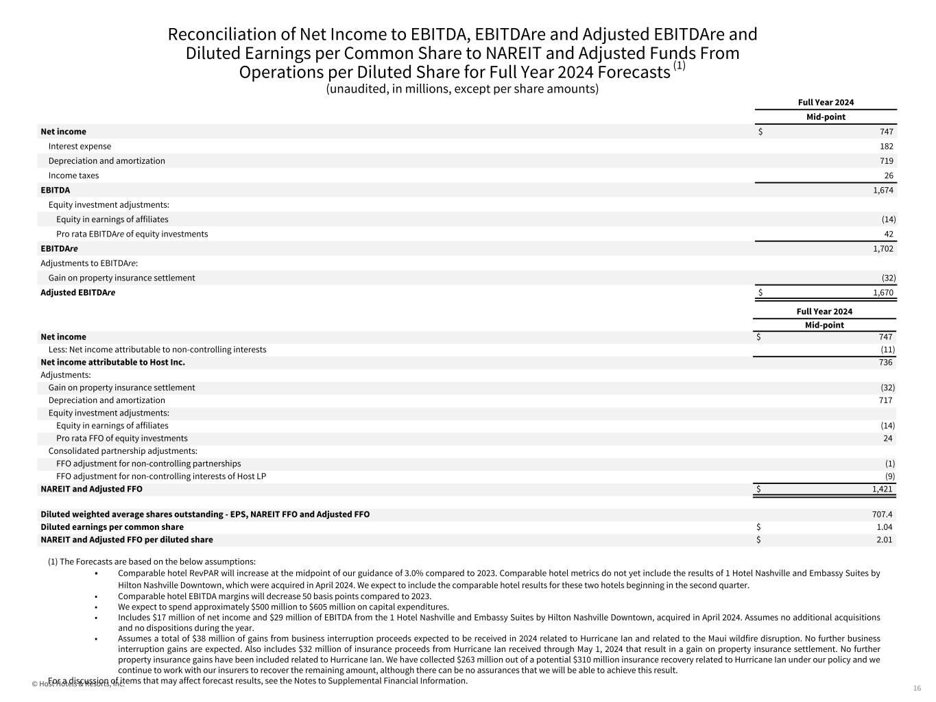 © Host Hotels & Resorts, Inc. Comparable Hotel Results 2024 Forecast (cont.) (unaudited, in millions) 15 Forecast Year ended December 31, 2024 Year ended December 31, 2023 Year ended December 31, 2019 Adjustments Adjustments Adjustments GAAP Results Forecast results for Nashville acquisition Non- comparable hotel results, net Depreciation and corporate level items Comparable hotel Results GAAP Results Property transaction adjustments Non- comparable hotel results, net Depreciation and corporate level items Comparable hotel Results GAAP Results Property transaction adjustments Non- comparable hotel results, net Depreciation and corporate level items Comparable hotel Results Revenues Room $ 3,448 $ (51) $ (117) $ — $ 3,280 $ 3,244 $ (5) $ (62) $ — $ 3,177 $ 3,431 $ (363) $ (81) $ — $ 2,987 Food and beverage 1,722 (19) (85) — 1,618 1,582 (2) (37) — 1,543 1,647 (95) (63) — 1,489 Other 532 (10) (21) — 501 485 — (12) — 473 391 (7) (24) — 360 Total revenues 5,702 (80) (223) — 5,399 5,311 (7) (111) — 5,193 5,469 (465) (168) — $ 4,836 Expenses Room 842 (11) (22) — 809 787 (1) (14) — 772 873 (125) (17) — 731 Food and beverage 1,131 (13) (63) — 1,055 1,042 (1) (34) — 1,007 1,120 (84) (46) — 990 Other 2,064 (27) (78) — 1,959 1,912 (2) (49) — 1,861 1,899 (160) (52) — 1,687 Depreciation and amortization 719 — — (719) — 697 — — (697) — 676 — — (676) — Corporate and other expenses 118 — — (118) — 132 — — (132) — 107 — — (107) — Gain on insurance settlements (70) — 18 32 (20) (86) — 75 3 (8) (5) — — 5 — Total expenses 4,804 (51) (145) (805) 3,803 4,484 (4) (22) (826) 3,632 4,670 (369) (115) (778) 3,408 Operating Profit - Comparable hotel EBITDA $ 898 $ (29) $ (78) $ 805 $ 1,596 $ 827 $ (3) $ (89) $ 826 $ 1,561 $ 799 $ (96) $ (53) $ 778 $ 1,428 Hotel Net Income Plus: Depreciation Plus: Interest Expense Plus: Income Tax Equals: Hotel EBITDA The Ritz-Carlton, Naples $ 7 $ 55 $ — $ — $ 62 Alila Ventana Big Sur $ 1 $ 5 $ — $ — $ 6 Forecast non-comparable hotel results, net includes the results of The Ritz-Carlton, Naples and Alila Ventana Big Sur. The following table reconciles net income to Hotel EBITDA based on the expected 2024 results of the properties excluding business interruption proceeds (in millions); any changes to net income would be equal to the change in Hotel EBITDA: Net Income Plus: Depreciation Plus: Interest Expense Plus: Income Tax Equals: Hotel EBITDA $ 17 $ 12 $ — $ — $ 29 Forecast results for Nashville acquisition includes the results of 1 Hotel Nashville and Embassy Suites by Hilton Nashville Downtown. The following table reconciles net income to Hotel EBITDA based on the expected 2024 results of the property from the date the of acquisition (in millions):