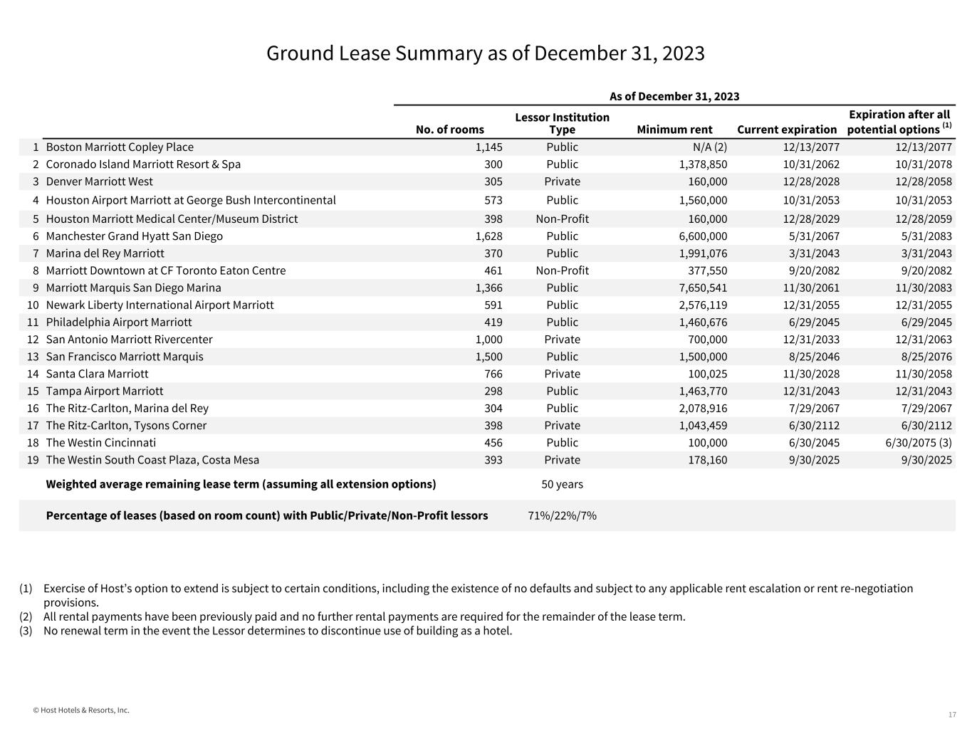 © Host Hotels & Resorts, Inc. Ground Lease Summary as of December 31, 2023 17 As of December 31, 2023 No. of rooms Lessor Institution Type Minimum rent Current expiration Expiration after all potential options (1) 1 Boston Marriott Copley Place 1,145 Public N/A (2) 12/13/2077 12/13/2077 2 Coronado Island Marriott Resort & Spa 300 Public 1,378,850 10/31/2062 10/31/2078 3 Denver Marriott West 305 Private 160,000 12/28/2028 12/28/2058 4 Houston Airport Marriott at George Bush Intercontinental 573 Public 1,560,000 10/31/2053 10/31/2053 5 Houston Marriott Medical Center/Museum District 398 Non-Profit 160,000 12/28/2029 12/28/2059 6 Manchester Grand Hyatt San Diego 1,628 Public 6,600,000 5/31/2067 5/31/2083 7 Marina del Rey Marriott 370 Public 1,991,076 3/31/2043 3/31/2043 8 Marriott Downtown at CF Toronto Eaton Centre 461 Non-Profit 377,550 9/20/2082 9/20/2082 9 Marriott Marquis San Diego Marina 1,366 Public 7,650,541 11/30/2061 11/30/2083 10 Newark Liberty International Airport Marriott 591 Public 2,576,119 12/31/2055 12/31/2055 11 Philadelphia Airport Marriott 419 Public 1,460,676 6/29/2045 6/29/2045 12 San Antonio Marriott Rivercenter 1,000 Private 700,000 12/31/2033 12/31/2063 13 San Francisco Marriott Marquis 1,500 Public 1,500,000 8/25/2046 8/25/2076 14 Santa Clara Marriott 766 Private 100,025 11/30/2028 11/30/2058 15 Tampa Airport Marriott 298 Public 1,463,770 12/31/2043 12/31/2043 16 The Ritz-Carlton, Marina del Rey 304 Public 2,078,916 7/29/2067 7/29/2067 17 The Ritz-Carlton, Tysons Corner 398 Private 1,043,459 6/30/2112 6/30/2112 18 The Westin Cincinnati 456 Public 100,000 6/30/2045 6/30/2075 (3) 19 The Westin South Coast Plaza, Costa Mesa 393 Private 178,160 9/30/2025 9/30/2025 Weighted average remaining lease term (assuming all extension options) 50 years Percentage of leases (based on room count) with Public/Private/Non-Profit lessors 71%/22%/7% (1) Exercise of Host’s option to extend is subject to certain conditions, including the existence of no defaults and subject to any applicable rent escalation or rent re-negotiation provisions. (2) All rental payments have been previously paid and no further rental payments are required for the remainder of the lease term. (3) No renewal term in the event the Lessor determines to discontinue use of building as a hotel.