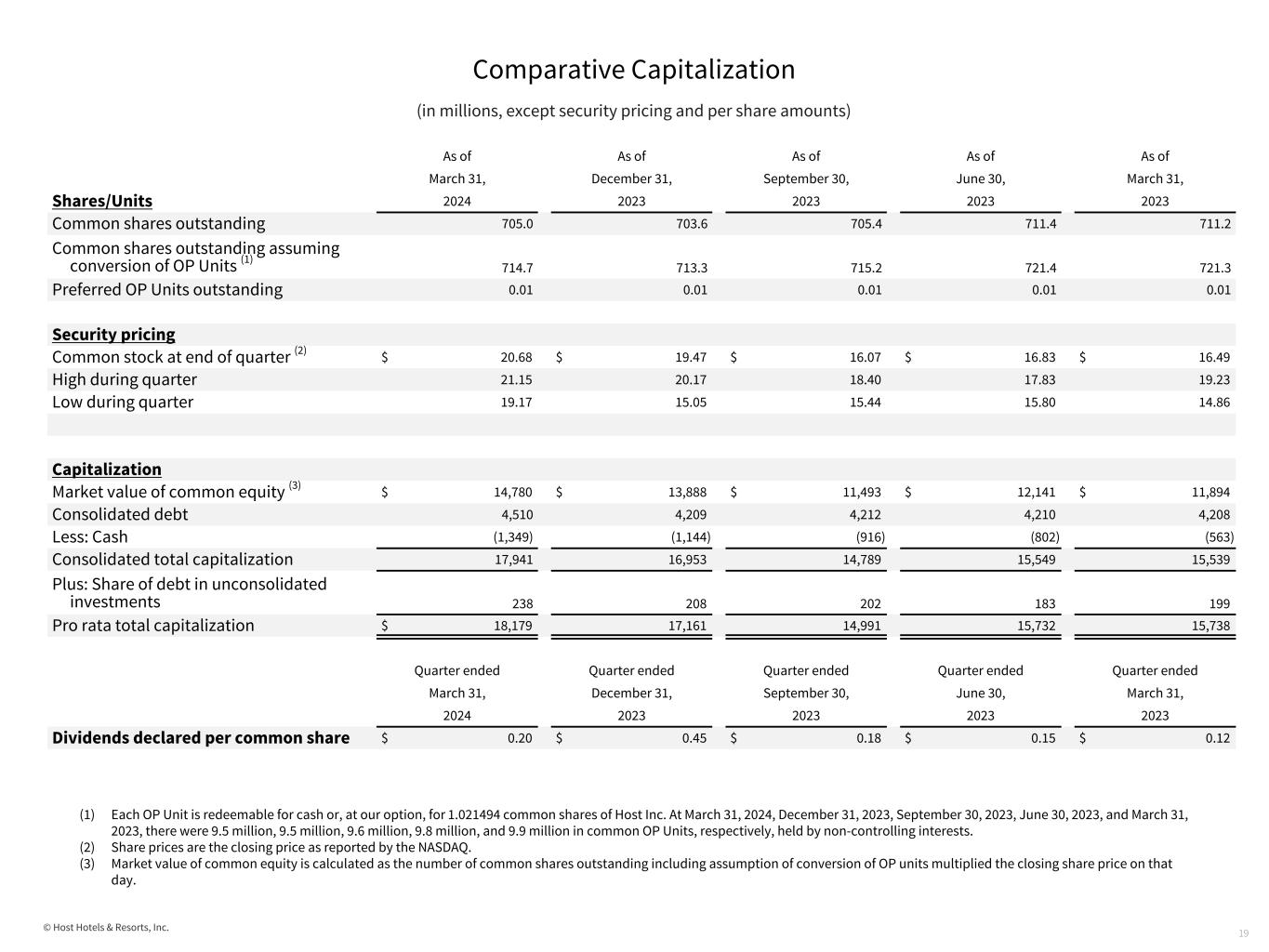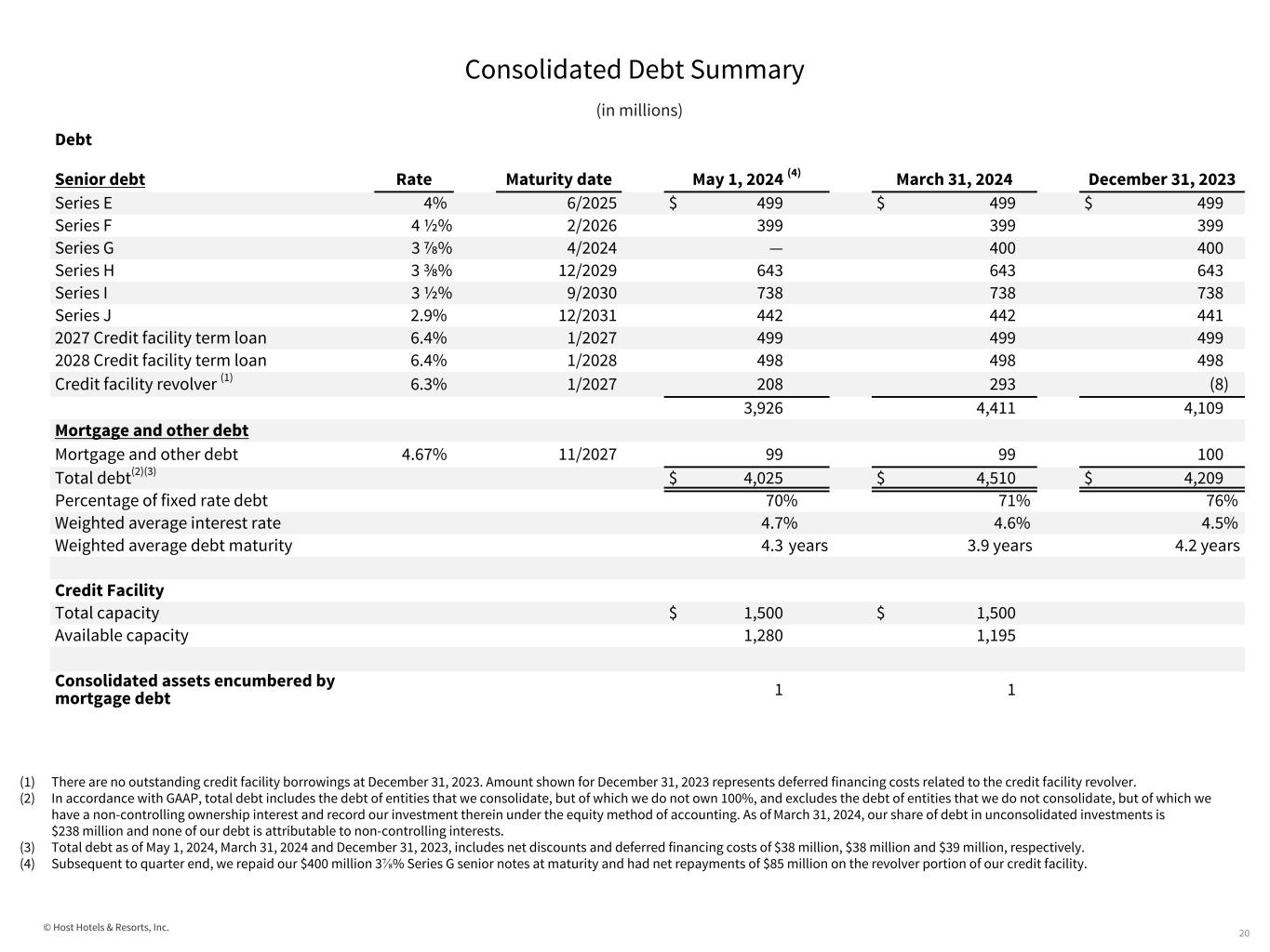 © Host Hotels & Resorts, Inc. Comparative Capitalization (in millions, except security pricing and per share amounts) 19 (1) Each OP Unit is redeemable for cash or, at our option, for 1.021494 common shares of Host Inc. At March 31, 2024, December 31, 2023, September 30, 2023, June 30, 2023, and March 31, 2023, there were 9.5 million, 9.5 million, 9.6 million, 9.8 million, and 9.9 million in common OP Units, respectively, held by non-controlling interests. (2) Share prices are the closing price as reported by the NASDAQ. (3) Market value of common equity is calculated as the number of common shares outstanding including assumption of conversion of OP units multiplied the closing share price on that day. As of As of As of As of As of March 31, December 31, September 30, June 30, March 31, Shares/Units 2024 2023 2023 2023 2023 Common shares outstanding 705.0 703.6 705.4 711.4 711.2 Common shares outstanding assuming conversion of OP Units (1) 714.7 713.3 715.2 721.4 721.3 Preferred OP Units outstanding 0.01 0.01 0.01 0.01 0.01 Security pricing Common stock at end of quarter (2) $ 20.68 $ 19.47 $ 16.07 $ 16.83 $ 16.49 High during quarter 21.15 20.17 18.40 17.83 19.23 Low during quarter 19.17 15.05 15.44 15.80 14.86 Capitalization Market value of common equity (3) $ 14,780 $ 13,888 $ 11,493 $ 12,141 $ 11,894 Consolidated debt 4,510 4,209 4,212 4,210 4,208 Less: Cash (1,349) (1,144) (916) (802) (563) Consolidated total capitalization 17,941 16,953 14,789 15,549 15,539 Plus: Share of debt in unconsolidated investments 238 208 202 183 199 Pro rata total capitalization $ 18,179 17,161 14,991 15,732 15,738 Quarter ended Quarter ended Quarter ended Quarter ended Quarter ended March 31, December 31, September 30, June 30, March 31, 2024 2023 2023 2023 2023 Dividends declared per common share $ 0.20 $ 0.45 $ 0.18 $ 0.15 $ 0.12