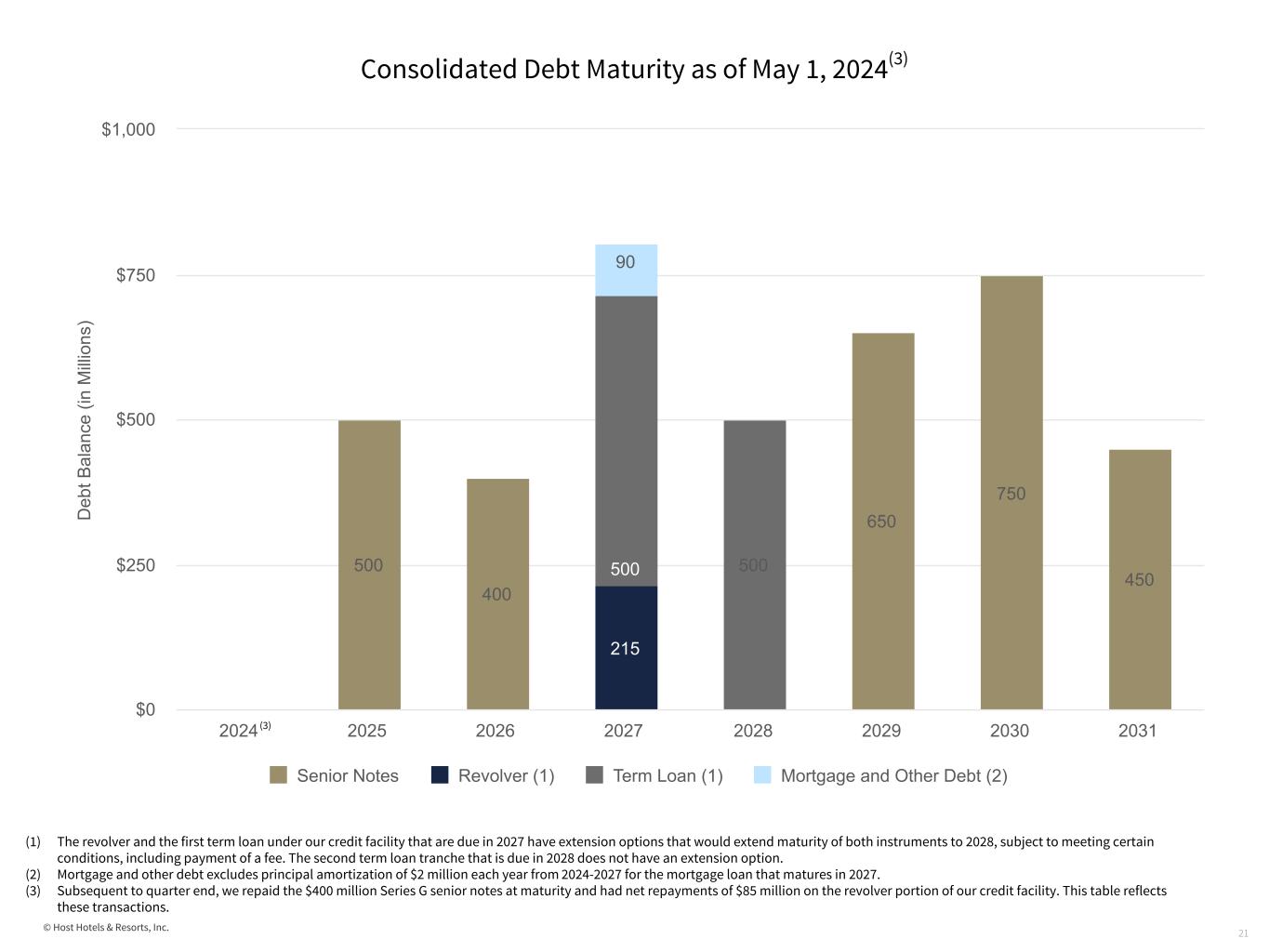 © Host Hotels & Resorts, Inc. Consolidated Debt Summary 20 (in millions) (1) There are no outstanding credit facility borrowings at December 31, 2023. Amount shown for December 31, 2023 represents deferred financing costs related to the credit facility revolver. (2) In accordance with GAAP, total debt includes the debt of entities that we consolidate, but of which we do not own 100%, and excludes the debt of entities that we do not consolidate, but of which we have a non-controlling ownership interest and record our investment therein under the equity method of accounting. As of March 31, 2024, our share of debt in unconsolidated investments is $238 million and none of our debt is attributable to non-controlling interests. (3) Total debt as of May 1, 2024, March 31, 2024 and December 31, 2023, includes net discounts and deferred financing costs of $38 million, $38 million and $39 million, respectively. (4) Subsequent to quarter end, we repaid our $400 million 3⅞% Series G senior notes at maturity and had net repayments of $85 million on the revolver portion of our credit facility. Debt Senior debt Rate Maturity date May 1, 2024 (4) March 31, 2024 December 31, 2023 Series E 4% 6/2025 $ 499 $ 499 $ 499 Series F 4 ½% 2/2026 399 399 399 Series G 3 ⅞% 4/2024 — 400 400 Series H 3 ⅜% 12/2029 643 643 643 Series I 3 ½% 9/2030 738 738 738 Series J 2.9% 12/2031 442 442 441 2027 Credit facility term loan 6.4% 1/2027 499 499 499 2028 Credit facility term loan 6.4% 1/2028 498 498 498 Credit facility revolver (1) 6.3% 1/2027 208 293 (8) 3,926 4,411 4,109 Mortgage and other debt Mortgage and other debt 4.67% 11/2027 99 99 100 Total debt(2)(3) $ 4,025 $ 4,510 $ 4,209 Percentage of fixed rate debt 70% 71% 76% Weighted average interest rate 4.7% 4.6% 4.5% Weighted average debt maturity 4.3 years 3.9 years 4.2 years Credit Facility Total capacity $ 1,500 $ 1,500 Available capacity 1,280 1,195 Consolidated assets encumbered by mortgage debt 1 1