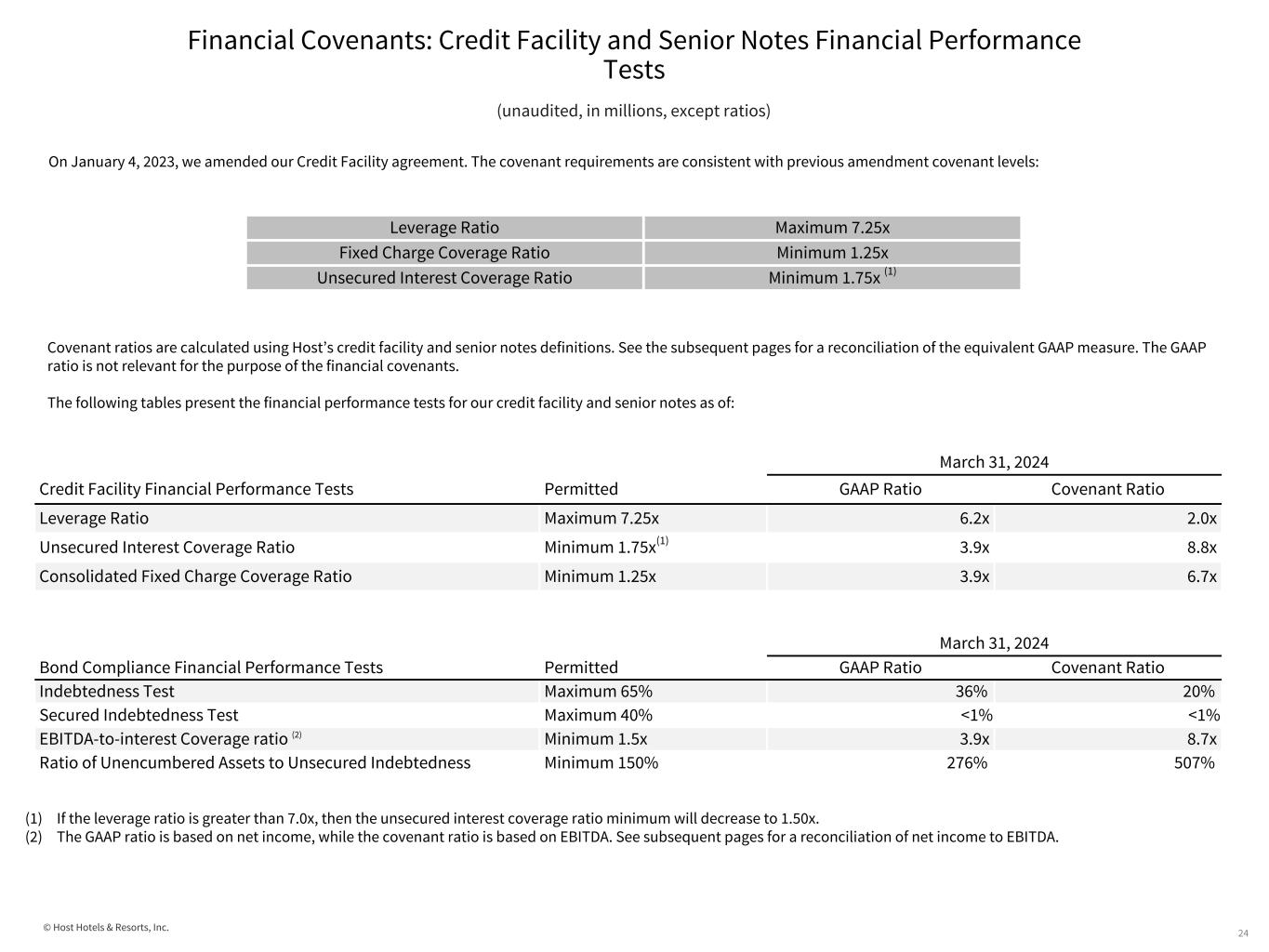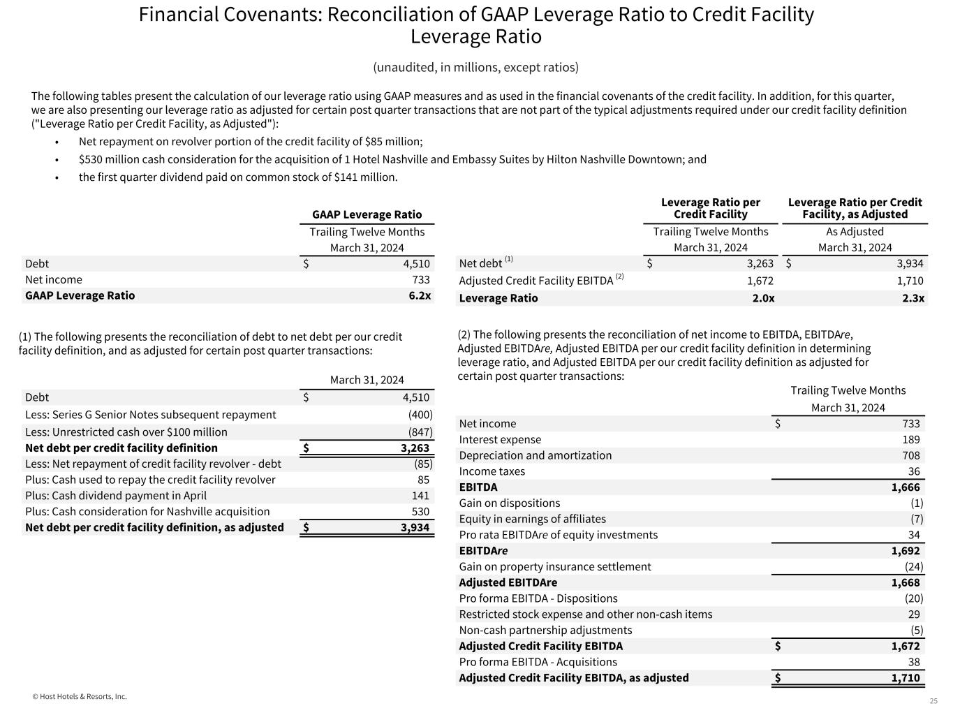 © Host Hotels & Resorts, Inc. Financial Covenants: Credit Facility and Senior Notes Financial Performance Tests 24 (unaudited, in millions, except ratios) Covenant ratios are calculated using Host’s credit facility and senior notes definitions. See the subsequent pages for a reconciliation of the equivalent GAAP measure. The GAAP ratio is not relevant for the purpose of the financial covenants. The following tables present the financial performance tests for our credit facility and senior notes as of: (1) If the leverage ratio is greater than 7.0x, then the unsecured interest coverage ratio minimum will decrease to 1.50x. (2) The GAAP ratio is based on net income, while the covenant ratio is based on EBITDA. See subsequent pages for a reconciliation of net income to EBITDA. On January 4, 2023, we amended our Credit Facility agreement. The covenant requirements are consistent with previous amendment covenant levels: Leverage Ratio Maximum 7.25x Fixed Charge Coverage Ratio Minimum 1.25x Unsecured Interest Coverage Ratio Minimum 1.75x (1) March 31, 2024 Credit Facility Financial Performance Tests Permitted GAAP Ratio Covenant Ratio Leverage Ratio Maximum 7.25x 6.2x 2.0x Unsecured Interest Coverage Ratio Minimum 1.75x(1) 3.9x 8.8x Consolidated Fixed Charge Coverage Ratio Minimum 1.25x 3.9x 6.7x March 31, 2024 Bond Compliance Financial Performance Tests Permitted GAAP Ratio Covenant Ratio Indebtedness Test Maximum 65% 36% 20% Secured Indebtedness Test Maximum 40% <1% <1% EBITDA-to-interest Coverage ratio (2) Minimum 1.5x 3.9x 8.7x Ratio of Unencumbered Assets to Unsecured Indebtedness Minimum 150% 276% 507%