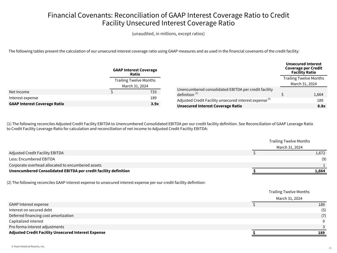 © Host Hotels & Resorts, Inc. Financial Covenants: Reconciliation of GAAP Leverage Ratio to Credit Facility Leverage Ratio 25 (unaudited, in millions, except ratios) (1) The following presents the reconciliation of debt to net debt per our credit facility definition, and as adjusted for certain post quarter transactions: (2) The following presents the reconciliation of net income to EBITDA, EBITDAre, Adjusted EBITDAre, Adjusted EBITDA per our credit facility definition in determining leverage ratio, and Adjusted EBITDA per our credit facility definition as adjusted for certain post quarter transactions: The following tables present the calculation of our leverage ratio using GAAP measures and as used in the financial covenants of the credit facility. In addition, for this quarter, we are also presenting our leverage ratio as adjusted for certain post quarter transactions that are not part of the typical adjustments required under our credit facility definition ("Leverage Ratio per Credit Facility, as Adjusted"): • Net repayment on revolver portion of the credit facility of $85 million; • $530 million cash consideration for the acquisition of 1 Hotel Nashville and Embassy Suites by Hilton Nashville Downtown; and • the first quarter dividend paid on common stock of $141 million. GAAP Leverage Ratio Trailing Twelve Months March 31, 2024 Debt $ 4,510 Net income 733 GAAP Leverage Ratio 6.2x Leverage Ratio per Credit Facility Leverage Ratio per Credit Facility, as Adjusted Trailing Twelve Months As Adjusted March 31, 2024 March 31, 2024 Net debt (1) $ 3,263 $ 3,934 Adjusted Credit Facility EBITDA (2) 1,672 1,710 Leverage Ratio 2.0x 2.3x March 31, 2024 Debt $ 4,510 Less: Series G Senior Notes subsequent repayment (400) Less: Unrestricted cash over $100 million (847) Net debt per credit facility definition $ 3,263 Less: Net repayment of credit facility revolver - debt (85) Plus: Cash used to repay the credit facility revolver 85 Plus: Cash dividend payment in April 141 Plus: Cash consideration for Nashville acquisition 530 Net debt per credit facility definition, as adjusted $ 3,934 Trailing Twelve Months March 31, 2024 Net income $ 733 Interest expense 189 Depreciation and amortization 708 Income taxes 36 EBITDA 1,666 Gain on dispositions (1) Equity in earnings of affiliates (7) Pro rata EBITDAre of equity investments 34 EBITDAre 1,692 Gain on property insurance settlement (24) Adjusted EBITDAre 1,668 Pro forma EBITDA - Dispositions (20) Restricted stock expense and other non-cash items 29 Non-cash partnership adjustments (5) Adjusted Credit Facility EBITDA $ 1,672 Pro forma EBITDA - Acquisitions 38 Adjusted Credit Facility EBITDA, as adjusted $ 1,710