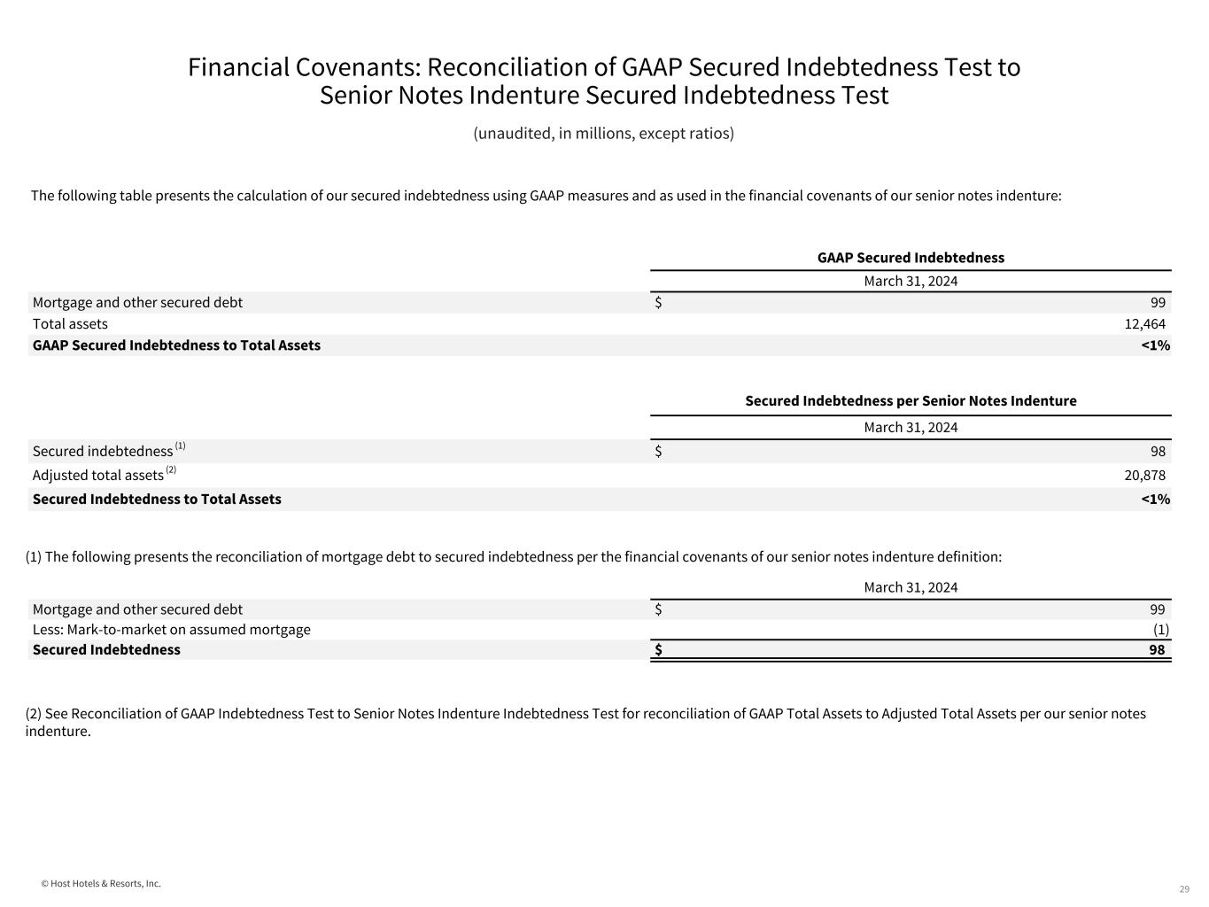 © Host Hotels & Resorts, Inc. Financial Covenants: Reconciliation of GAAP Indebtedness Test to Senior Notes Indenture Indebtedness Test 28 (unaudited, in millions, except ratios) The following tables present the calculation of our total indebtedness to total assets using GAAP measures and as used in the financial covenants of our senior notes indenture: (2) The following presents the reconciliation of total assets to adjusted total assets per the financial covenants of our senior notes indenture definition: (1) The following reconciles our GAAP total indebtedness to our total indebtedness per our senior notes indenture: GAAP Total Indebtedness to Total Assets March 31, 2024 Debt $ 4,510 Total assets 12,464 GAAP Total Indebtedness to Total Assets 36% Total Indebtedness to Total Assets per Senior Notes Indenture March 31, 2024 Adjusted indebtedness (1) $ 4,132 Adjusted total assets (2) 20,878 Total Indebtedness to Total Assets 20% March 31, 2024 Debt $ 4,510 Add: Deferred financing costs 23 Less: Series G Senior Notes subsequent repayment (400) Less: Mark-to-market on assumed mortgage (1) Adjusted Indebtedness per Senior Notes Indenture $ 4,132 March 31, 2024 Total assets $ 12,464 Add: Accumulated depreciation 9,354 Add: Prior impairment of assets held 11 Add: Inventory impairment at unconsolidated investment 9 Less: Intangibles (9) Less: Cash paid for Series G Senior Notes (400) Less: Right-of-use assets (551) Adjusted Total Assets per Senior Notes Indenture $ 20,878