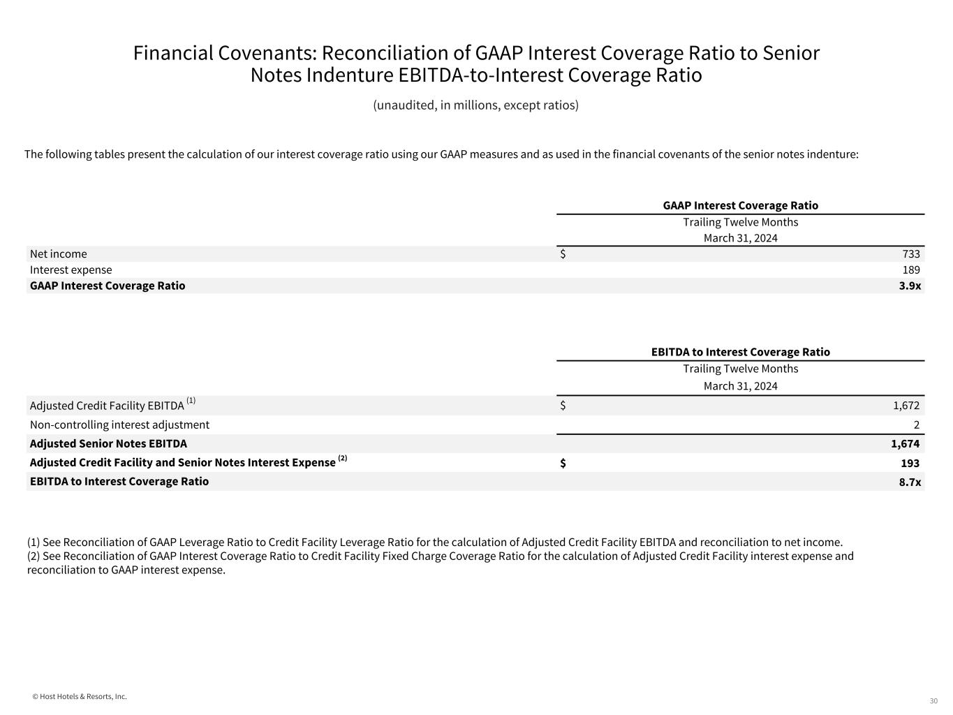 © Host Hotels & Resorts, Inc. Financial Covenants: Reconciliation of GAAP Secured Indebtedness Test to Senior Notes Indenture Secured Indebtedness Test 29 (unaudited, in millions, except ratios) The following table presents the calculation of our secured indebtedness using GAAP measures and as used in the financial covenants of our senior notes indenture: (2) See Reconciliation of GAAP Indebtedness Test to Senior Notes Indenture Indebtedness Test for reconciliation of GAAP Total Assets to Adjusted Total Assets per our senior notes indenture. (1) The following presents the reconciliation of mortgage debt to secured indebtedness per the financial covenants of our senior notes indenture definition: GAAP Secured Indebtedness March 31, 2024 Mortgage and other secured debt $ 99 Total assets 12,464 GAAP Secured Indebtedness to Total Assets <1% Secured Indebtedness per Senior Notes Indenture March 31, 2024 Secured indebtedness (1) $ 98 Adjusted total assets (2) 20,878 Secured Indebtedness to Total Assets <1% March 31, 2024 Mortgage and other secured debt $ 99 Less: Mark-to-market on assumed mortgage (1) Secured Indebtedness $ 98