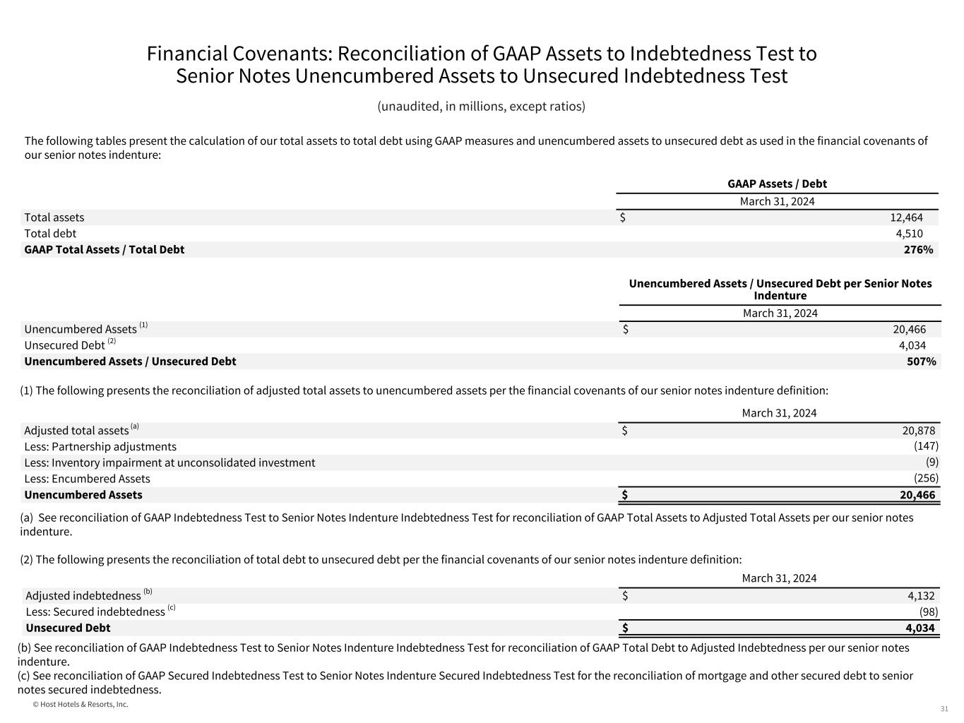© Host Hotels & Resorts, Inc. Financial Covenants: Reconciliation of GAAP Assets to Indebtedness Test to Senior Notes Unencumbered Assets to Unsecured Indebtedness Test 31 (unaudited, in millions, except ratios) The following tables present the calculation of our total assets to total debt using GAAP measures and unencumbered assets to unsecured debt as used in the financial covenants of our senior notes indenture: (1) The following presents the reconciliation of adjusted total assets to unencumbered assets per the financial covenants of our senior notes indenture definition: (a) See reconciliation of GAAP Indebtedness Test to Senior Notes Indenture Indebtedness Test for reconciliation of GAAP Total Assets to Adjusted Total Assets per our senior notes indenture. (2) The following presents the reconciliation of total debt to unsecured debt per the financial covenants of our senior notes indenture definition: (b) See reconciliation of GAAP Indebtedness Test to Senior Notes Indenture Indebtedness Test for reconciliation of GAAP Total Debt to Adjusted Indebtedness per our senior notes indenture. (c) See reconciliation of GAAP Secured Indebtedness Test to Senior Notes Indenture Secured Indebtedness Test for the reconciliation of mortgage and other secured debt to senior notes secured indebtedness. GAAP Assets / Debt March 31, 2024 Total assets $ 12,464 Total debt 4,510 GAAP Total Assets / Total Debt 276% Unencumbered Assets / Unsecured Debt per Senior Notes Indenture March 31, 2024 Unencumbered Assets (1) $ 20,466 Unsecured Debt (2) 4,034 Unencumbered Assets / Unsecured Debt 507% March 31, 2024 Adjusted total assets (a) $ 20,878 Less: Partnership adjustments (147) Less: Inventory impairment at unconsolidated investment (9) Less: Encumbered Assets (256) Unencumbered Assets $ 20,466 March 31, 2024 Adjusted indebtedness (b) $ 4,132 Less: Secured indebtedness (c) (98) Unsecured Debt $ 4,034