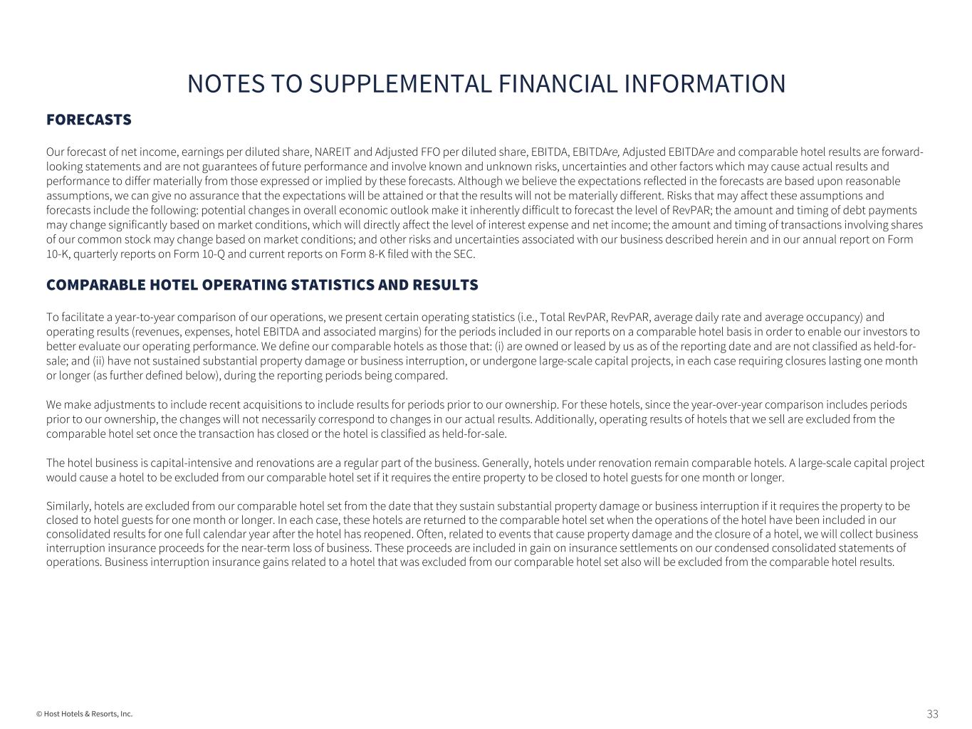 33© Host Hotels & Resorts, Inc. FORECASTS Our forecast of net income, earnings per diluted share, NAREIT and Adjusted FFO per diluted share, EBITDA, EBITDAre, Adjusted EBITDAre and comparable hotel results are forward- looking statements and are not guarantees of future performance and involve known and unknown risks, uncertainties and other factors which may cause actual results and performance to differ materially from those expressed or implied by these forecasts. Although we believe the expectations reflected in the forecasts are based upon reasonable assumptions, we can give no assurance that the expectations will be attained or that the results will not be materially different. Risks that may affect these assumptions and forecasts include the following: potential changes in overall economic outlook make it inherently difficult to forecast the level of RevPAR; the amount and timing of debt payments may change significantly based on market conditions, which will directly affect the level of interest expense and net income; the amount and timing of transactions involving shares of our common stock may change based on market conditions; and other risks and uncertainties associated with our business described herein and in our annual report on Form 10-K, quarterly reports on Form 10-Q and current reports on Form 8-K filed with the SEC. COMPARABLE HOTEL OPERATING STATISTICS AND RESULTS To facilitate a year-to-year comparison of our operations, we present certain operating statistics (i.e., Total RevPAR, RevPAR, average daily rate and average occupancy) and operating results (revenues, expenses, hotel EBITDA and associated margins) for the periods included in our reports on a comparable hotel basis in order to enable our investors to better evaluate our operating performance. We define our comparable hotels as those that: (i) are owned or leased by us as of the reporting date and are not classified as held-for- sale; and (ii) have not sustained substantial property damage or business interruption, or undergone large-scale capital projects, in each case requiring closures lasting one month or longer (as further defined below), during the reporting periods being compared. We make adjustments to include recent acquisitions to include results for periods prior to our ownership. For these hotels, since the year-over-year comparison includes periods prior to our ownership, the changes will not necessarily correspond to changes in our actual results. Additionally, operating results of hotels that we sell are excluded from the comparable hotel set once the transaction has closed or the hotel is classified as held-for-sale. The hotel business is capital-intensive and renovations are a regular part of the business. Generally, hotels under renovation remain comparable hotels. A large-scale capital project would cause a hotel to be excluded from our comparable hotel set if it requires the entire property to be closed to hotel guests for one month or longer. Similarly, hotels are excluded from our comparable hotel set from the date that they sustain substantial property damage or business interruption if it requires the property to be closed to hotel guests for one month or longer. In each case, these hotels are returned to the comparable hotel set when the operations of the hotel have been included in our consolidated results for one full calendar year after the hotel has reopened. Often, related to events that cause property damage and the closure of a hotel, we will collect business interruption insurance proceeds for the near-term loss of business. These proceeds are included in gain on insurance settlements on our condensed consolidated statements of operations. Business interruption insurance gains related to a hotel that was excluded from our comparable hotel set also will be excluded from the comparable hotel results. NOTES TO SUPPLEMENTAL FINANCIAL INFORMATION