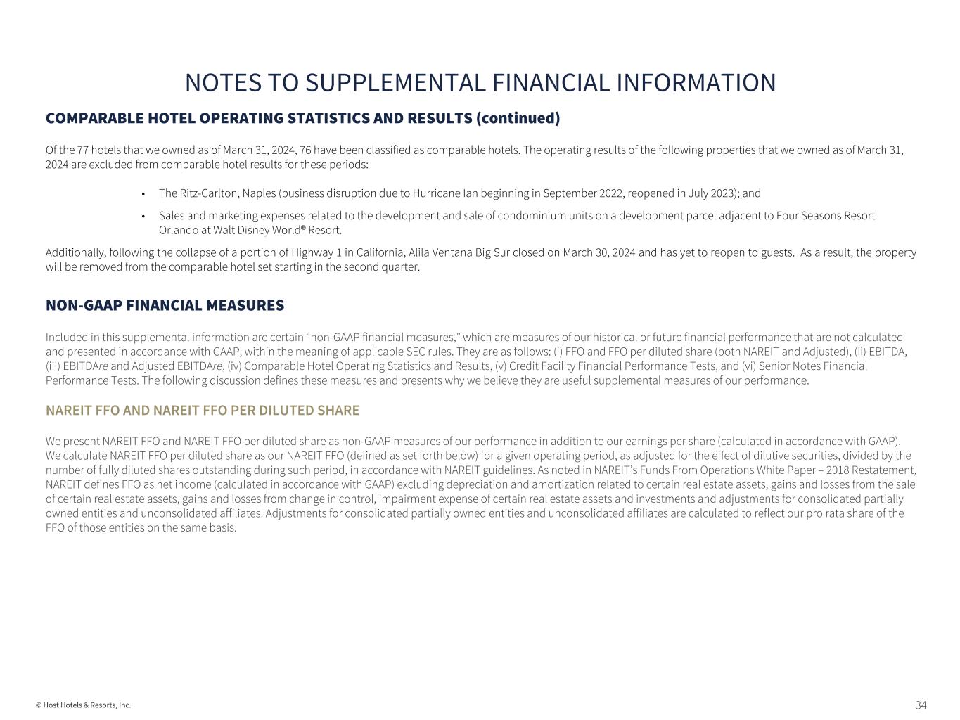 34© Host Hotels & Resorts, Inc. COMPARABLE HOTEL OPERATING STATISTICS AND RESULTS (continued) Of the 77 hotels that we owned as of March 31, 2024, 76 have been classified as comparable hotels. The operating results of the following properties that we owned as of March 31, 2024 are excluded from comparable hotel results for these periods: • The Ritz-Carlton, Naples (business disruption due to Hurricane Ian beginning in September 2022, reopened in July 2023); and • Sales and marketing expenses related to the development and sale of condominium units on a development parcel adjacent to Four Seasons Resort Orlando at Walt Disney World® Resort. Additionally, following the collapse of a portion of Highway 1 in California, Alila Ventana Big Sur closed on March 30, 2024 and has yet to reopen to guests. As a result, the property will be removed from the comparable hotel set starting in the second quarter. NON-GAAP FINANCIAL MEASURES Included in this supplemental information are certain “non-GAAP financial measures,” which are measures of our historical or future financial performance that are not calculated and presented in accordance with GAAP, within the meaning of applicable SEC rules. They are as follows: (i) FFO and FFO per diluted share (both NAREIT and Adjusted), (ii) EBITDA, (iii) EBITDAre and Adjusted EBITDAre, (iv) Comparable Hotel Operating Statistics and Results, (v) Credit Facility Financial Performance Tests, and (vi) Senior Notes Financial Performance Tests. The following discussion defines these measures and presents why we believe they are useful supplemental measures of our performance. NAREIT FFO AND NAREIT FFO PER DILUTED SHARE We present NAREIT FFO and NAREIT FFO per diluted share as non-GAAP measures of our performance in addition to our earnings per share (calculated in accordance with GAAP). We calculate NAREIT FFO per diluted share as our NAREIT FFO (defined as set forth below) for a given operating period, as adjusted for the effect of dilutive securities, divided by the number of fully diluted shares outstanding during such period, in accordance with NAREIT guidelines. As noted in NAREIT’s Funds From Operations White Paper – 2018 Restatement, NAREIT defines FFO as net income (calculated in accordance with GAAP) excluding depreciation and amortization related to certain real estate assets, gains and losses from the sale of certain real estate assets, gains and losses from change in control, impairment expense of certain real estate assets and investments and adjustments for consolidated partially owned entities and unconsolidated affiliates. Adjustments for consolidated partially owned entities and unconsolidated affiliates are calculated to reflect our pro rata share of the FFO of those entities on the same basis. NOTES TO SUPPLEMENTAL FINANCIAL INFORMATION