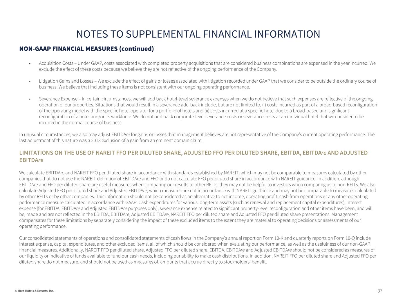 35© Host Hotels & Resorts, Inc. NON-GAAP FINANCIAL MEASURES (continued) We believe that NAREIT FFO per diluted share is a useful supplemental measure of our operating performance and that the presentation of NAREIT FFO per diluted share, when combined with the primary GAAP presentation of diluted earnings per share, provides beneficial information to investors. By excluding the effect of real estate depreciation, amortization, impairment expense and gains and losses from sales of depreciable real estate, all of which are based on historical cost accounting and which may be of lesser significance in evaluating current performance, we believe that such measures can facilitate comparisons of operating performance between periods and with other REITs, even though NAREIT FFO per diluted share does not represent an amount that accrues directly to holders of our common stock. Historical cost accounting for real estate assets implicitly assumes that the value of real estate assets diminishes predictably over time. As noted by NAREIT in its Funds From Operations White Paper – 2018 Restatement, the primary purpose for including FFO as a supplemental measure of operating performance of a REIT is to address the artificial nature of historical cost depreciation and amortization of real estate and real estate-related assets mandated by GAAP. For these reasons, NAREIT adopted the FFO metric in order to promote a uniform industry-wide measure of REIT operating performance. ADJUSTED FFO PER DILUTED SHARE We also present Adjusted FFO per diluted share when evaluating our performance because management believes that the exclusion of certain additional items described below provides useful supplemental information to investors regarding our ongoing operating performance. Management historically has made the adjustments detailed below in evaluating our performance, in our annual budget process and for our compensation programs. We believe that the presentation of Adjusted FFO per diluted share, when combined with both the primary GAAP presentation of diluted earnings per share and FFO per diluted share as defined by NAREIT, provides useful supplemental information that is beneficial to an investor’s understanding of our operating performance. We adjust NAREIT FFO per diluted share for the following items, which may occur in any period, and refer to this measure as Adjusted FFO per diluted share: • Gains and Losses on the Extinguishment of Debt – We exclude the effect of finance charges and premiums associated with the extinguishment of debt, including the acceleration of the write-off of deferred financing costs from the original issuance of the debt being redeemed or retired and incremental interest expense incurred during the refinancing period. We also exclude the gains on debt repurchases and the original issuance costs associated with the retirement of preferred stock. We believe that these items are not reflective of our ongoing finance costs. • Acquisition Costs – Under GAAP, costs associated with completed property acquisitions that are considered business combinations are expensed in the year incurred. We exclude the effect of these costs because we believe they are not reflective of the ongoing performance of the Company. • Litigation Gains and Losses – We exclude the effect of gains or losses associated with litigation recorded under GAAP that we consider to be outside the ordinary course of business. We believe that including these items is not consistent with our ongoing operating performance. • Severance Expense –In certain circumstances, we will add back hotel-level severance expenses when we do not believe that such expenses are reflective of the ongoing operation of our properties. Situations that would result in a severance add-back include, but are not limited to, (i) costs incurred as part of a broad- based reconfiguration of the operating model with the specific hotel operator for a portfolio of hotels and (ii) costs incurred at a specific hotel due to a broad- based and significant reconfiguration of a hotel and/or its workforce. We do not add back corporate-level severance costs or severance costs at an individual hotel that we consider to be incurred in the normal course of business. NOTES TO SUPPLEMENTAL FINANCIAL INFORMATION