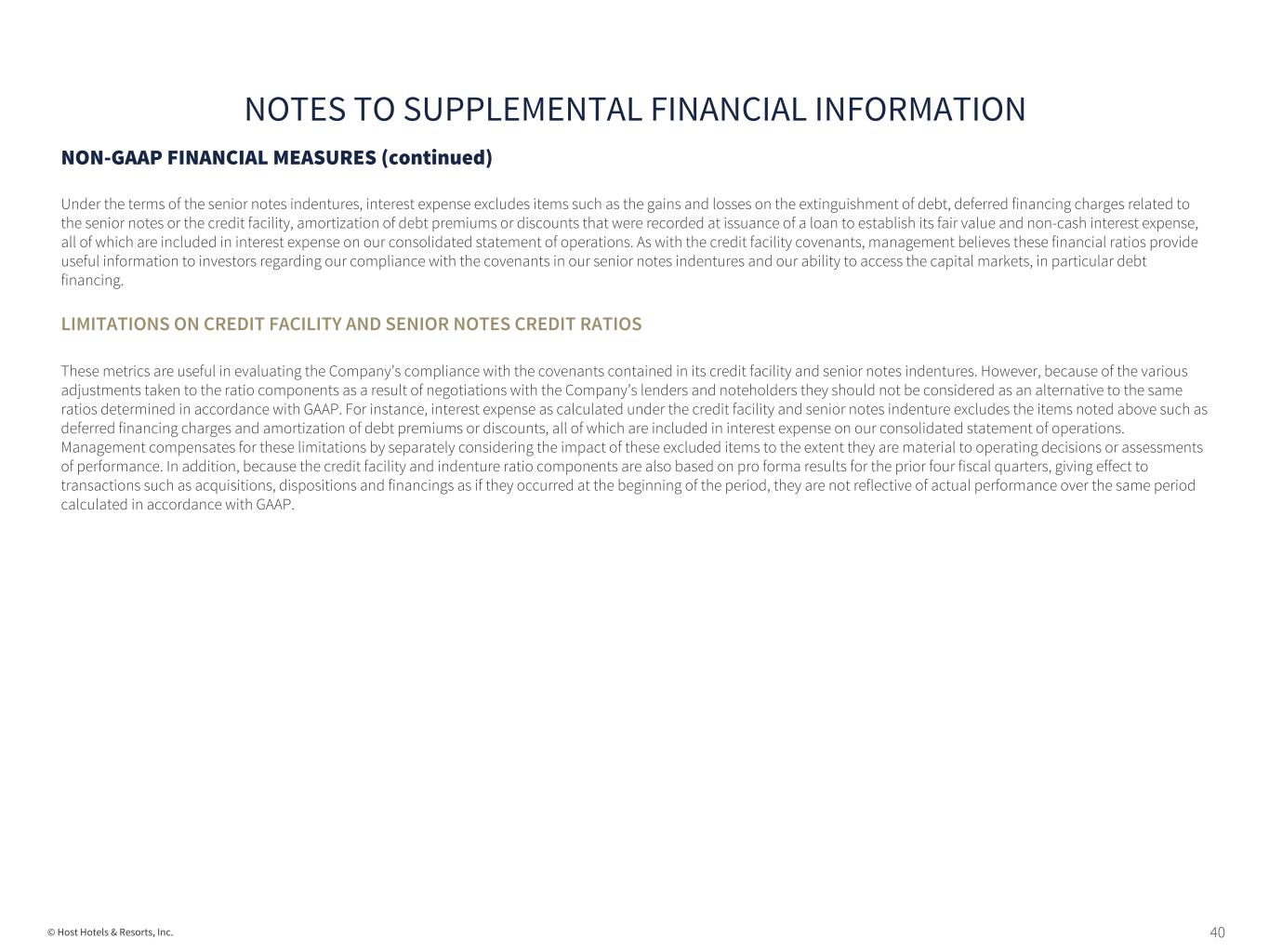 39© Host Hotels & Resorts, Inc. NON-GAAP FINANCIAL MEASURES (continued) We present these hotel operating results on a comparable hotel basis because we believe that doing so provides investors and management with useful information for evaluating the period-to-period performance of our hotels and facilitates comparisons with other hotel REITs and hotel owners. In particular, these measures assist management and investors in distinguishing whether increases or decreases in revenues and/or expenses are due to growth or decline of operations at comparable hotels (which represent the vast majority of our portfolio) or from other factors. While management believes that presentation of comparable hotel results is a supplemental measure that provides useful information in evaluating our ongoing performance, this measure is not used to allocate resources or to assess the operating performance of each of our hotels, as these decisions are based on data for individual hotels and are not based on comparable hotel results in the aggregate. For these reasons, we believe comparable hotel operating results, when combined with the presentation of GAAP operating profit, revenues and expenses, provide useful information to investors and management. CREDIT FACILITY – LEVERAGE, UNSECURED INTEREST COVERAGE AND CONSOLIDATED FIXED CHARGE COVERAGE RATIOS Host’s credit facility contains certain financial covenants, including allowable leverage, unsecured interest coverage and fixed charge ratios, which are determined using EBITDA as calculated under the terms of our credit facility (“Adjusted Credit Facility EBITDA”). The leverage ratio is defined as net debt plus preferred equity to Adjusted Credit Facility EBITDA. The unsecured interest coverage ratio is defined as unencumbered Adjusted Credit Facility EBITDA to unsecured consolidated interest expense. The fixed charge coverage ratio is defined as Adjusted Credit Facility EBITDA divided by fixed charges, which include interest expense, required debt amortization payments, cash taxes and preferred stock payments. These calculations are based on pro forma results for the prior four fiscal quarters giving effect to transactions such as acquisitions, dispositions and financings as if they occurred at the beginning of the period. The credit facility also incorporates by reference the ratio of unencumbered assets to unsecured indebtedness test from our senior notes indentures, calculated in the same manner, and the covenant is discussed below with the senior notes covenants. Additionally, total debt used in the calculation of our leverage ratio is based on a “net debt” concept, under which cash and cash equivalents in excess of $100 million are deducted from our total debt balance. Management believes these financial ratios provide useful information to investors regarding our compliance with the covenants in our credit facility and our ability to access the capital markets, in particular debt financing. SENIOR NOTES INDENTURE – INDEBTEDNESS TEST, SECURED INDEBTEDNESS TO TOTAL ASSETS TEST, EBITDA-TO-INTEREST COVERAGE RATIO AND RATIO OF UNENCUMBERED ASSETS TO UNSECURED INDEBTEDNESS Host’s senior notes indentures contains certain financial covenants, including allowable indebtedness, secured indebtedness to total assets, EBITDA-to-interest coverage and unencumbered assets to unsecured indebtedness. The indebtedness test is defined as adjusted indebtedness, which includes total debt adjusted for deferred financing costs, divided by adjusted total assets, which includes undepreciated real estate book values (“Adjusted Total Assets”). The secured indebtedness to total assets is defined as secured indebtedness, which includes mortgage debt and finance leases, divided by Adjusted Total Assets. The EBITDA-to-interest coverage ratio is defined as EBITDA as calculated under our senior notes indenture (“Adjusted Senior Notes EBITDA”) to interest expense as defined by our senior notes indenture. The ratio of unencumbered assets to unsecured indebtedness is defined as unencumbered adjusted assets, which includes Adjusted Total Assets less encumbered assets, divided by unsecured debt, which includes the aggregate principal amount of outstanding unsecured indebtedness plus contingent obligations. NOTES TO SUPPLEMENTAL FINANCIAL INFORMATION