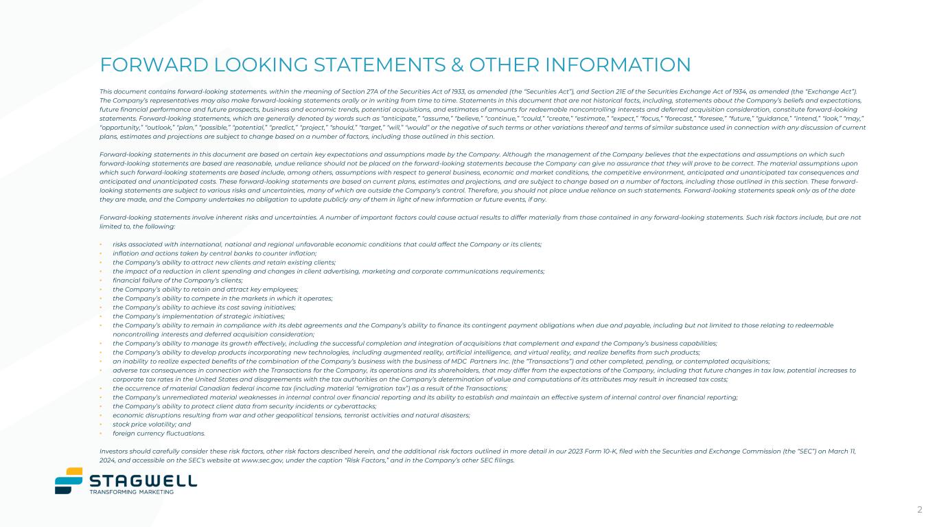 This document contains forward-looking statements. within the meaning of Section 27A of the Securities Act of 1933, as amended (the “Securities Act”), and Section 21E of the Securities Exchange Act of 1934, as amended (the “Exchange Act”). The Company’s representatives may also make forward-looking statements orally or in writing from time to time. Statements in this document that are not historical facts, including, statements about the Company’s beliefs and expectations, future financial performance and future prospects, business and economic trends, potential acquisitions, and estimates of amounts for redeemable noncontrolling interests and deferred acquisition consideration, constitute forward-looking statements. Forward-looking statements, which are generally denoted by words such as “anticipate,” “assume,” “believe,” “continue,” “could,” “create,” “estimate,” “expect,” “focus,” “forecast,” “foresee,” “future,” “guidance,” “intend,” “look,” “may,” “opportunity,” “outlook,” “plan,” “possible,” “potential,” “predict,” “project,” “should,” “target,” “will,” “would” or the negative of such terms or other variations thereof and terms of similar substance used in connection with any discussion of current plans, estimates and projections are subject to change based on a number of factors, including those outlined in this section. Forward-looking statements in this document are based on certain key expectations and assumptions made by the Company. Although the management of the Company believes that the expectations and assumptions on which such forward-looking statements are based are reasonable, undue reliance should not be placed on the forward-looking statements because the Company can give no assurance that they will prove to be correct. The material assumptions upon which such forward-looking statements are based include, among others, assumptions with respect to general business, economic and market conditions, the competitive environment, anticipated and unanticipated tax consequences and anticipated and unanticipated costs. These forward-looking statements are based on current plans, estimates and projections, and are subject to change based on a number of factors, including those outlined in this section. These forward- looking statements are subject to various risks and uncertainties, many of which are outside the Company’s control. Therefore, you should not place undue reliance on such statements. Forward-looking statements speak only as of the date they are made, and the Company undertakes no obligation to update publicly any of them in light of new information or future events, if any. Forward-looking statements involve inherent risks and uncertainties. A number of important factors could cause actual results to differ materially from those contained in any forward-looking statements. Such risk factors include, but are not limited to, the following: • risks associated with international, national and regional unfavorable economic conditions that could affect the Company or its clients; • inflation and actions taken by central banks to counter inflation; • the Company’s ability to attract new clients and retain existing clients; • the impact of a reduction in client spending and changes in client advertising, marketing and corporate communications requirements; • financial failure of the Company’s clients; • the Company’s ability to retain and attract key employees; • the Company’s ability to compete in the markets in which it operates; • the Company’s ability to achieve its cost saving initiatives; • the Company’s implementation of strategic initiatives; • the Company’s ability to remain in compliance with its debt agreements and the Company’s ability to finance its contingent payment obligations when due and payable, including but not limited to those relating to redeemable noncontrolling interests and deferred acquisition consideration; • the Company’s ability to manage its growth effectively, including the successful completion and integration of acquisitions that complement and expand the Company’s business capabilities; • the Company’s ability to develop products incorporating new technologies, including augmented reality, artificial intelligence, and virtual reality, and realize benefits from such products; • an inability to realize expected benefits of the combination of the Company’s business with the business of MDC Partners Inc. (the “Transactions”) and other completed, pending, or contemplated acquisitions; • adverse tax consequences in connection with the Transactions for the Company, its operations and its shareholders, that may differ from the expectations of the Company, including that future changes in tax law, potential increases to corporate tax rates in the United States and disagreements with the tax authorities on the Company’s determination of value and computations of its attributes may result in increased tax costs; • the occurrence of material Canadian federal income tax (including material “emigration tax”) as a result of the Transactions; • the Company’s unremediated material weaknesses in internal control over financial reporting and its ability to establish and maintain an effective system of internal control over financial reporting; • the Company’s ability to protect client data from security incidents or cyberattacks; • economic disruptions resulting from war and other geopolitical tensions, terrorist activities and natural disasters; • stock price volatility; and • foreign currency fluctuations. Investors should carefully consider these risk factors, other risk factors described herein, and the additional risk factors outlined in more detail in our 2023 Form 10-K, filed with the Securities and Exchange Commission (the “SEC”) on March 11, 2024, 