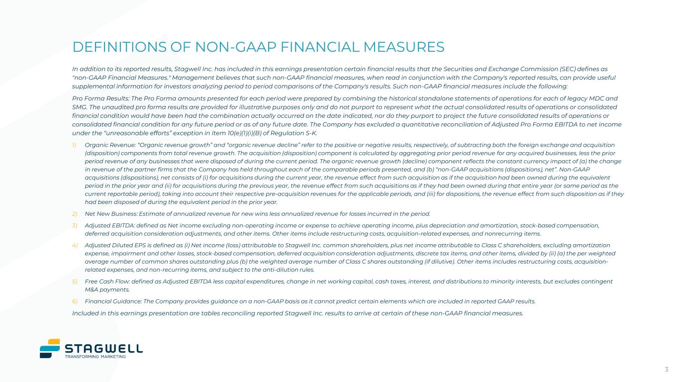 DEFINITIONS OF NON-GAAP FINANCIAL MEASURES 3 In addition to its reported results, Stagwell Inc. has included in this earnings presentation certain financial results that the Securities and Exchange Commission (SEC) defines as "non-GAAP Financial Measures." Management believes that such non-GAAP financial measures, when read in conjunction with the Company's reported results, can provide useful supplemental information for investors analyzing period to period comparisons of the Company's results. Such non-GAAP financial measures include the following: Pro Forma Results: The Pro Forma amounts presented for each period were prepared by combining the historical standalone statements of operations for each of legacy MDC and SMG. The unaudited pro forma results are provided for illustrative purposes only and do not purport to represent what the actual consolidated results of operations or consolidated financial condition would have been had the combination actually occurred on the date indicated, nor do they purport to project the future consolidated results of operations or consolidated financial condition for any future period or as of any future date. The Company has excluded a quantitative reconciliation of Adjusted Pro Forma EBITDA to net income under the “unreasonable efforts” exception in Item 10(e)(1)(i)(B) of Regulation S-K. 1) Organic Revenue: “Organic revenue growth” and “organic revenue decline” refer to the positive or negative results, respectively, of subtracting both the foreign exchange and acquisition (disposition) components from total revenue growth. The acquisition (disposition) component is calculated by aggregating prior period revenue for any acquired businesses, less the prior period revenue of any businesses that were disposed of during the current period. The organic revenue growth (decline) component reflects the constant currency impact of (a) the change in revenue of the partner firms that the Company has held throughout each of the comparable periods presented, and (b) “non-GAAP acquisitions (dispositions), net”. Non-GAAP acquisitions (dispositions), net consists of (i) for acquisitions during the current year, the revenue effect from such acquisition as if the acquisition had been owned during the equivalent period in the prior year and (ii) for acquisitions during the previous year, the revenue effect from such acquisitions as if they had been owned during that entire year (or same period as the current reportable period), taking into account their respective pre-acquisition revenues for the applicable periods, and (iii) for dispositions, the revenue effect from such disposition as if they had been disposed of during the equivalent period in the prior year. 2) Net New Business: Estimate of annualized revenue for new wins less annualized revenue for losses incurred in the period. 3) Adjusted EBITDA: defined as Net income excluding non-operating income or expense to achieve operating income, plus depreciation and amortization, stock-based compensation, deferred acquisition consideration adjustments, and other items. Other items include restructuring costs, acquisition-related expenses, and nonrecurring items. 4) Adjusted Diluted EPS is defined as (i) Net income (loss) attributable to Stagwell Inc. common shareholders, plus net income attributable to Class C shareholders, excluding amortization expense, impairment and other losses, stock-based compensation, deferred acquisition consideration adjustments, discrete tax items, and other items, divided by (ii) (a) the per weighted average number of common shares outstanding plus (b) the weighted average number of Class C shares outstanding (if dilutive). Other items includes restructuring costs, acquisition- related expenses, and non-recurring items, and subject to the anti-dilution rules. 5) Free Cash Flow: defined as Adjusted EBITDA less capital expenditures, change in net working capital, cash taxes, interest, and distributions to minority interests, but excludes contingent M&A payments. 6) Financial Guidance: The Company provides guidance on a non-GAAP basis as it cannot predict certain elements which are included in reported GAAP results. Included in this earnings presentation are tables reconciling reported Stagwell Inc. results to arrive at certain of these non-GAAP financial measures.