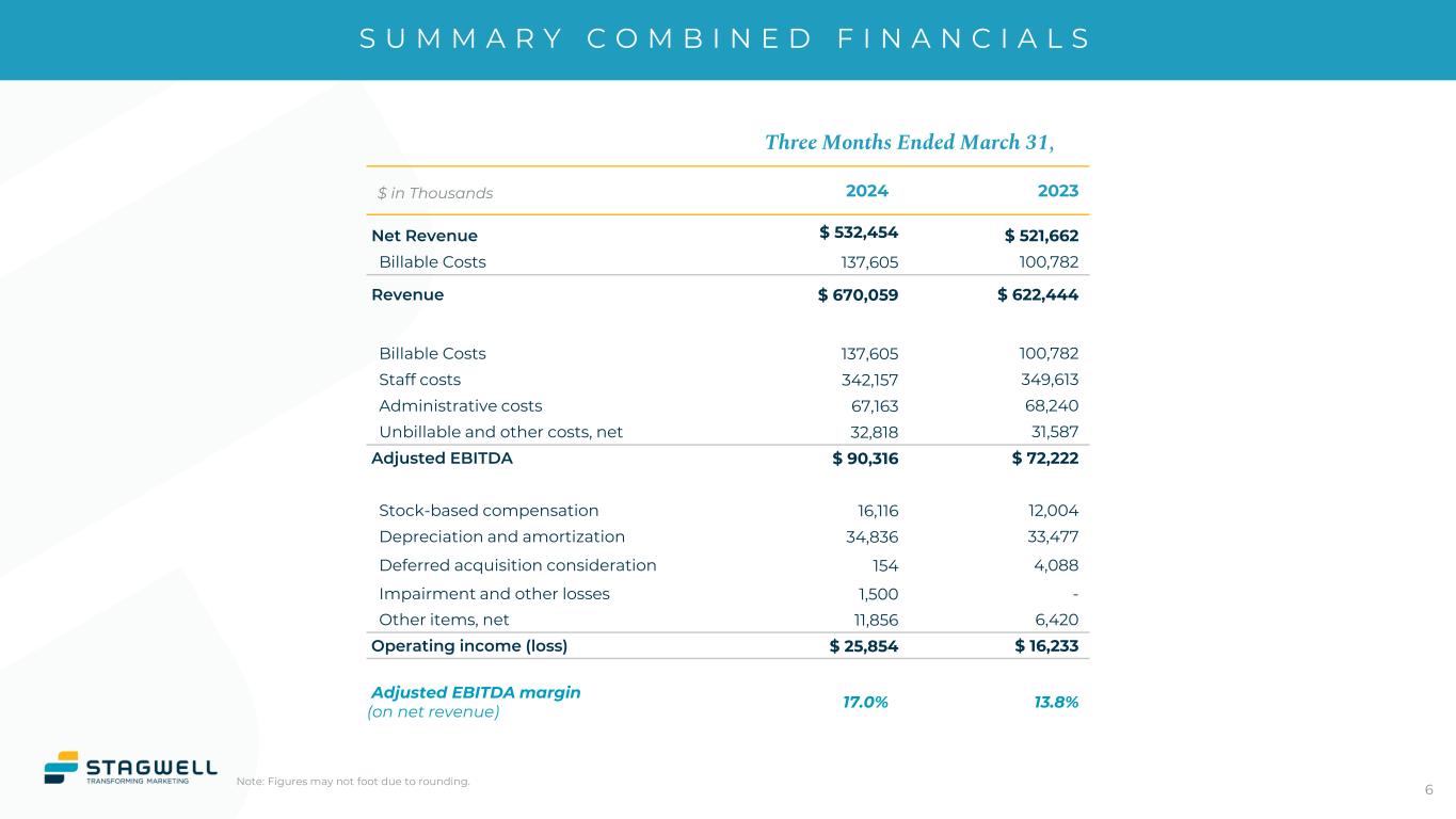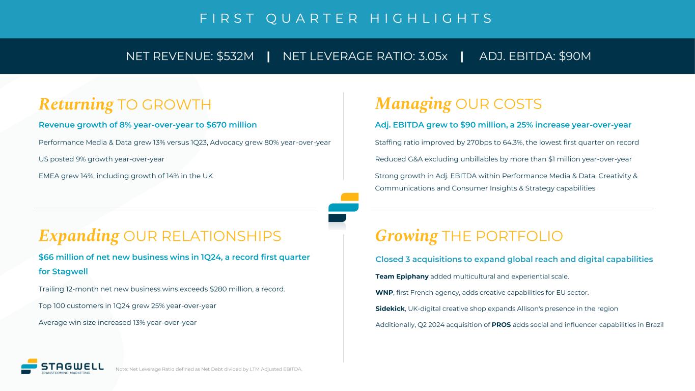 F I R S T Q U A R T E R H I G H L I G H T S NET REVENUE: $532M | NET LEVERAGE RATIO: 3.05x | ADJ. EBITDA: $90M Growing THE PORTFOLIO Returning TO GROWTH Expanding OUR RELATIONSHIPS Managing OUR COSTS Closed 3 acquisitions to expand global reach and digital capabilities Team Epiphany added multicultural and experiential scale. WNP, first French agency, adds creative capabilities for EU sector. Sidekick, UK-digital creative shop expands Allison's presence in the region Additionally, Q2 2024 acquisition of PROS adds social and influencer capabilities in Brazil Adj. EBITDA grew to $90 million, a 25% increase year-over-year Staffing ratio improved by 270bps to 64.3%, the lowest first quarter on record Reduced G&A excluding unbillables by more than $1 million year-over-year Strong growth in Adj. EBITDA within Performance Media & Data, Creativity & Communications and Consumer Insights & Strategy capabilities Revenue growth of 8% year-over-year to $670 million Performance Media & Data grew 13% versus 1Q23, Advocacy grew 80% year-over-year US posted 9% growth year-over-year EMEA grew 14%, including growth of 14% in the UK $66 million of net new business wins in 1Q24, a record first quarter for Stagwell Trailing 12-month net new business wins exceeds $280 million, a record. Top 100 customers in 1Q24 grew 25% year-over-year Average win size increased 13% year-over-year Note: Net Leverage Ratio defined as Net Debt divided by LTM Adjusted EBITDA.