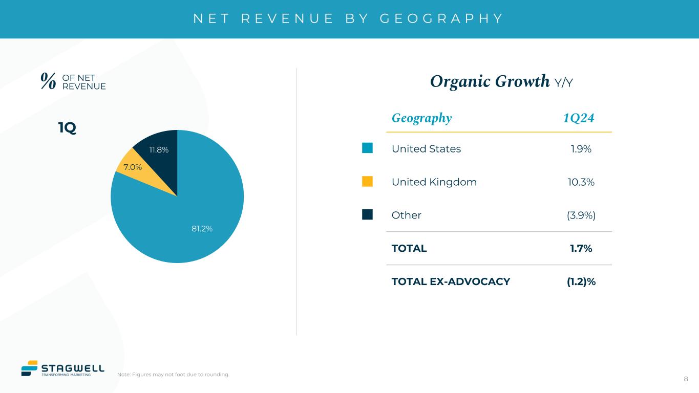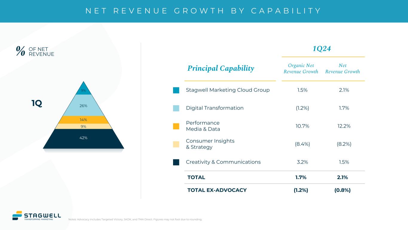 N E T R E V E N U E G R O W T H B Y C A P A B I L I T Y Notes: Advocacy includes Targeted Victory, SKDK, and TMA Direct. Figures may not foot due to rounding. 1Q24 Principal Capability Organic Net Revenue Growth Net Revenue Growth Stagwell Marketing Cloud Group 1.5% 2.1% Digital Transformation (1.2%) 1.7% Performance Media & Data 10.7% 12.2% Consumer Insights & Strategy (8.4%) (8.2%) Creativity & Communications 3.2% 1.5% TOTAL 1.7% 2.1% TOTAL EX-ADVOCACY (1.2%) (0.8%) % OF NET REVENUE 1Q 9% 24% 14% 46% 9% 26% 14% 9% 42%