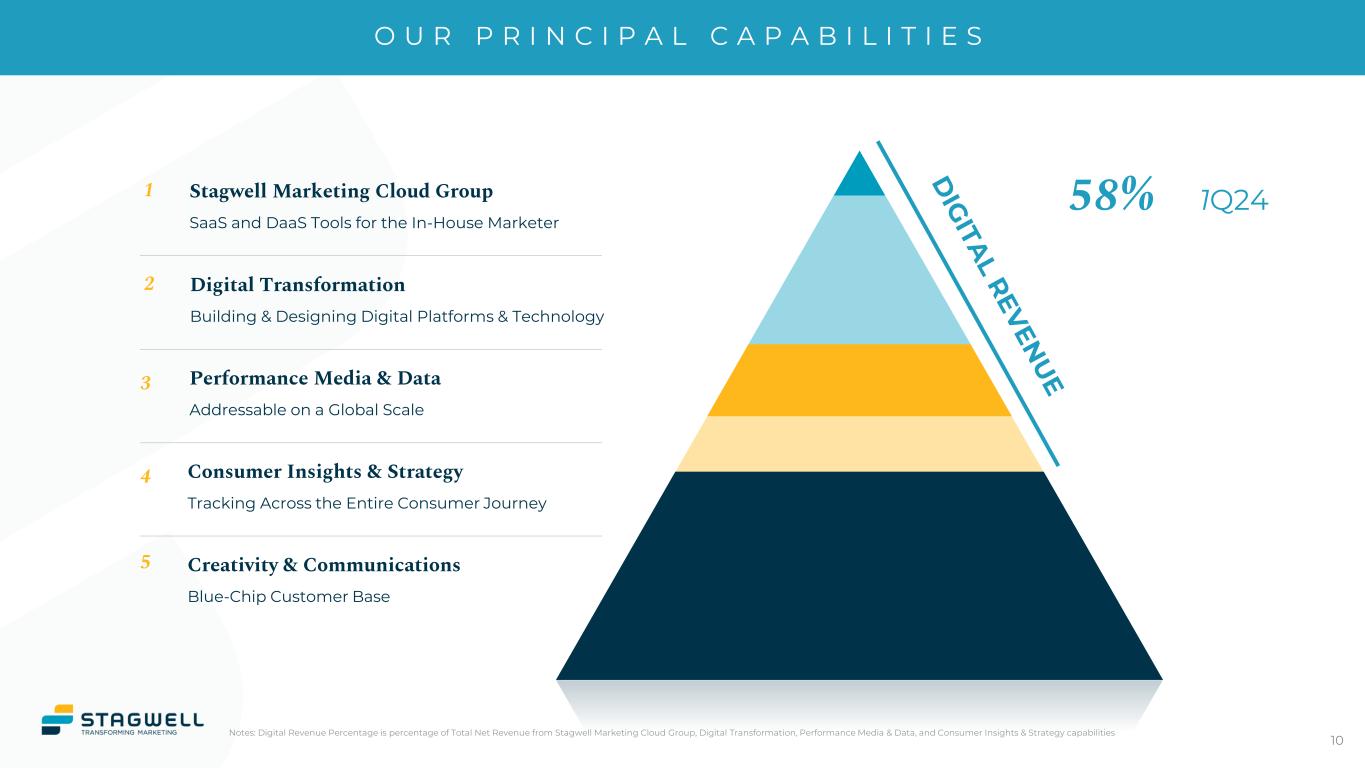 G L O B A L N E T W O R K 9 North America Latin America Europe Asia Pacific • Australia • China • Hong Kong • India • Indonesia • Japan • Malaysia • Philippines • Taiwan • Thailand • Singapore • South Korea Middle East & Africa • Austria • Belgium • Bulgaria • Italy • Latvia • Romania • Slovak Republic • Slovenia • Switzerland • Turkey • Ukraine • France • Germany • Netherlands • Poland • Spain • Sweden • United Kingdom • Argentina • Aruba • Bolivia • Brazil • Curacao • Colombia • Costa Rica • Dominican • Ecuador • El Salvador • Guatemala • Honduras • Jamaica • Nicaragua • Panama • Peru • Republic • Uruguay • Venezuela • Algeria • Bahrain • Egypt • Jordan • Kuwait • Lebanon • Libya • Morocco • Nigeria • Oman • Saudi Arabia • South Africa • Tunisia • United Arab Emirates Stagwell +Affiliates COUNTRIES 34+ 75+ EMPLOYEES 12K+ 21K+ Stagwell’s Affiliate Network Significantly Expands Our Global Footprint • Canada • USA • Mexico Note: As of March 31, 2024.