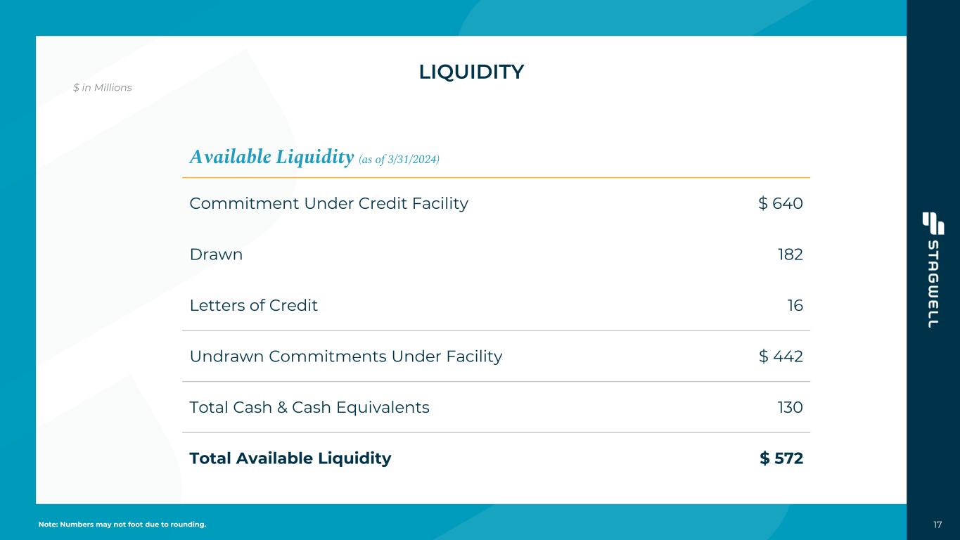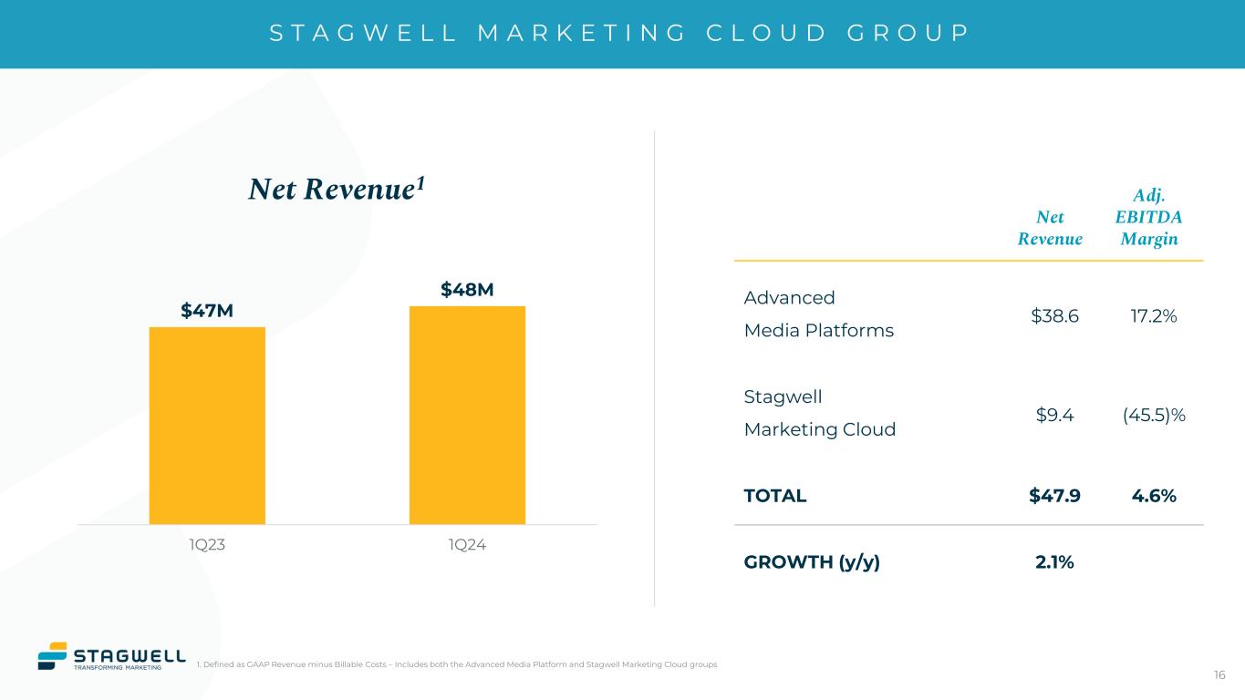 S T A G W E L L M A R K E T I N G C L O U D G R O U P 16 Net Revenue1 1. Defined as GAAP Revenue minus Billable Costs – Includes both the Advanced Media Platform and Stagwell Marketing Cloud groups Net Revenue Adj. EBITDA Margin Advanced Media Platforms $38.6 17.2% Stagwell Marketing Cloud $9.4 (45.5)% TOTAL $47.9 4.6% GROWTH (y/y) 2.1% $47M $48M 1Q23 1Q24