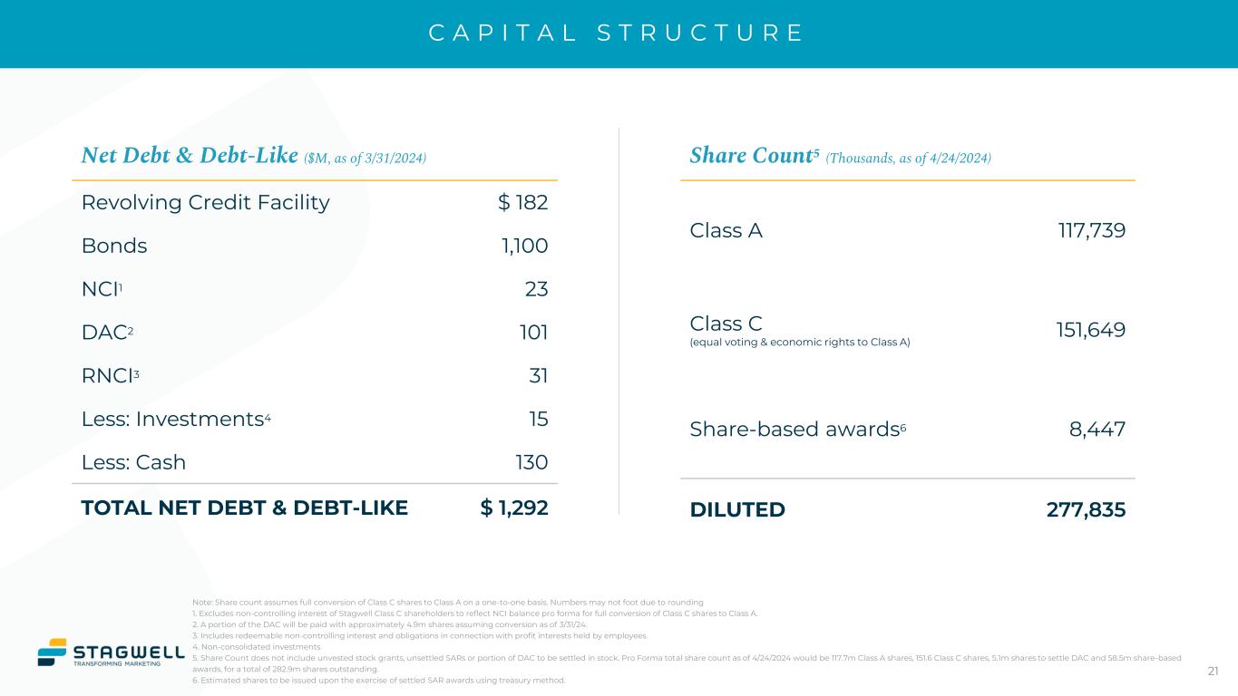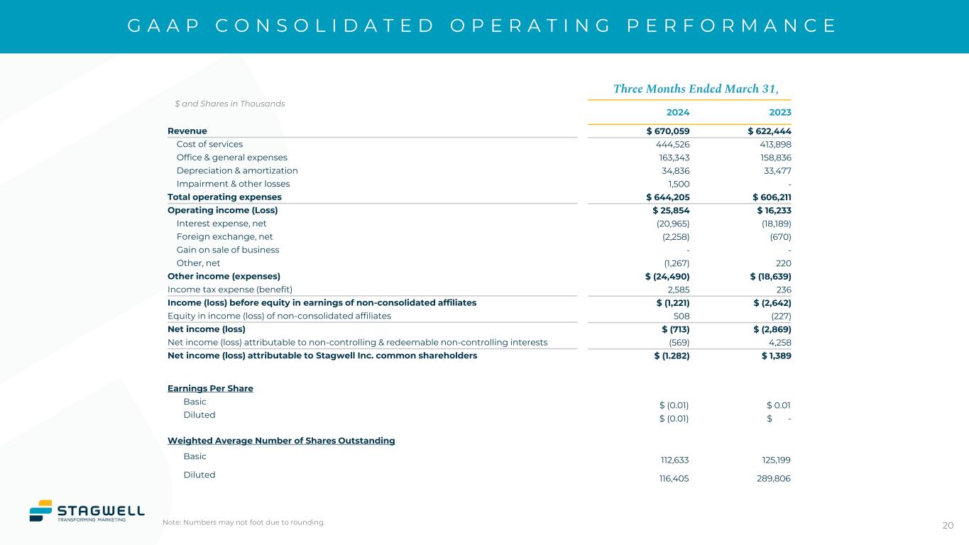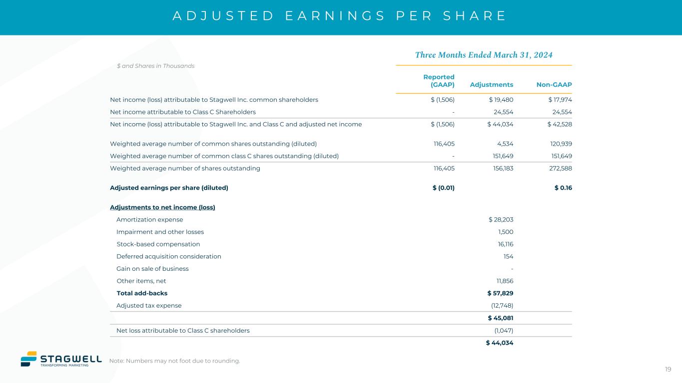 A D J U S T E D E A R N I N G S P E R S H A R E Three Months Ended March 31, 2024 Reported (GAAP) Adjustments Non-GAAP Net income (loss) attributable to Stagwell Inc. common shareholders $ (1,506) $ 19,480 $ 17,974 Net income attributable to Class C Shareholders - 24,554 24,554 Net income (loss) attributable to Stagwell Inc. and Class C and adjusted net income $ (1,506) $ 44,034 $ 42,528 Weighted average number of common shares outstanding (diluted) 116,405 4,534 120,939 Weighted average number of common class C shares outstanding (diluted) - 151,649 151,649 Weighted average number of shares outstanding 116,405 156,183 272,588 Adjusted earnings per share (diluted) $ (0.01) $ 0.16 Adjustments to net income (loss) Amortization expense $ 28,203 Impairment and other losses 1,500 Stock-based compensation 16,116 Deferred acquisition consideration 154 Gain on sale of business - Other items, net 11,856 Total add-backs $ 57,829 Adjusted tax expense (12,748) $ 45,081 Net loss attributable to Class C shareholders (1,047) $ 44,034 19 $ and Shares in Thousands Note: Numbers may not foot due to rounding.