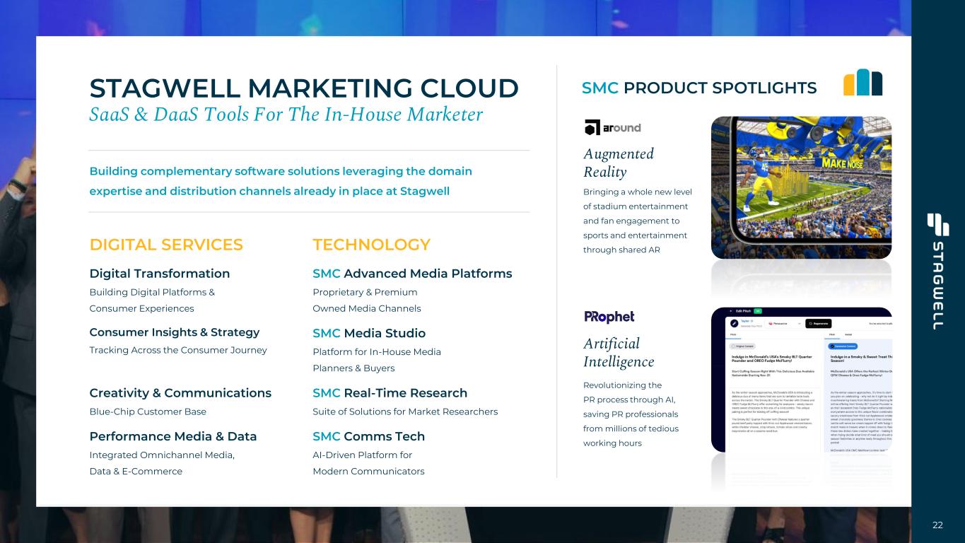 C A P I T A L S T R U C T U R E Note: Share count assumes full conversion of Class C shares to Class A on a one-to-one basis. Numbers may not foot due to rounding 1. Excludes non-controlling interest of Stagwell Class C shareholders to reflect NCI balance pro forma for full conversion of Class C shares to Class A. 2. A portion of the DAC will be paid with approximately 4.9m shares assuming conversion as of 3/31/24. 3. Includes redeemable non-controlling interest and obligations in connection with profit interests held by employees. 4. Non-consolidated investments 5. Share Count does not include unvested stock grants, unsettled SARs or portion of DAC to be settled in stock. Pro Forma total share count as of 4/24/2024 would be 117.7m Class A shares, 151.6 Class C shares, 5.1m shares to settle DAC and 58.5m share-based awards, for a total of 282.9m shares outstanding. 6. Estimated shares to be issued upon the exercise of settled SAR awards using treasury method. Net Debt & Debt-Like ($M, as of 3/31/2024) Revolving Credit Facility $ 182 Bonds 1,100 NCI1 23 DAC2 101 RNCI3 31 Less: Investments4 15 Less: Cash 130 TOTAL NET DEBT & DEBT-LIKE $ 1,292 Share Count5 (Thousands, as of 4/24/2024) Class A 117,739 Class C (equal voting & economic rights to Class A) 151,649 Share-based awards6 8,447 DILUTED 277,835 21