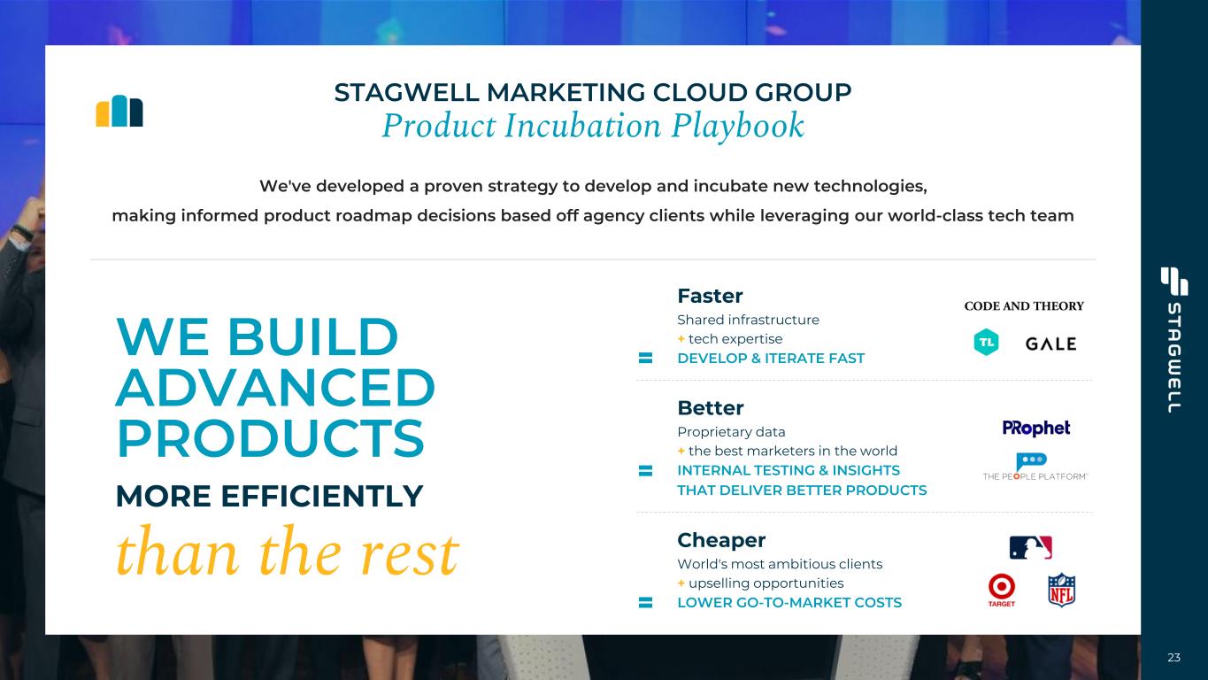 22 DIGITAL SERVICES TECHNOLOGY Digital Transformation Building Digital Platforms & Consumer Experiences SMC Advanced Media Platforms Proprietary & Premium Owned Media Channels Consumer Insights & Strategy Tracking Across the Consumer Journey SMC Media Studio Platform for In-House Media Planners & Buyers Creativity & Communications Blue-Chip Customer Base SMC Real-Time Research Suite of Solutions for Market Researchers Performance Media & Data Integrated Omnichannel Media, Data & E-Commerce SMC Comms Tech AI-Driven Platform for Modern Communicators Building complementary software solutions leveraging the domain expertise and distribution channels already in place at Stagwell STAGWELL MARKETING CLOUD SaaS & DaaS Tools For The In-House Marketer SMC PRODUCT SPOTLIGHTS Augmented Reality Bringing a whole new level of stadium entertainment and fan engagement to sports and entertainment through shared AR Artificial Intelligence Revolutionizing the PR process through AI, saving PR professionals from millions of tedious working hours