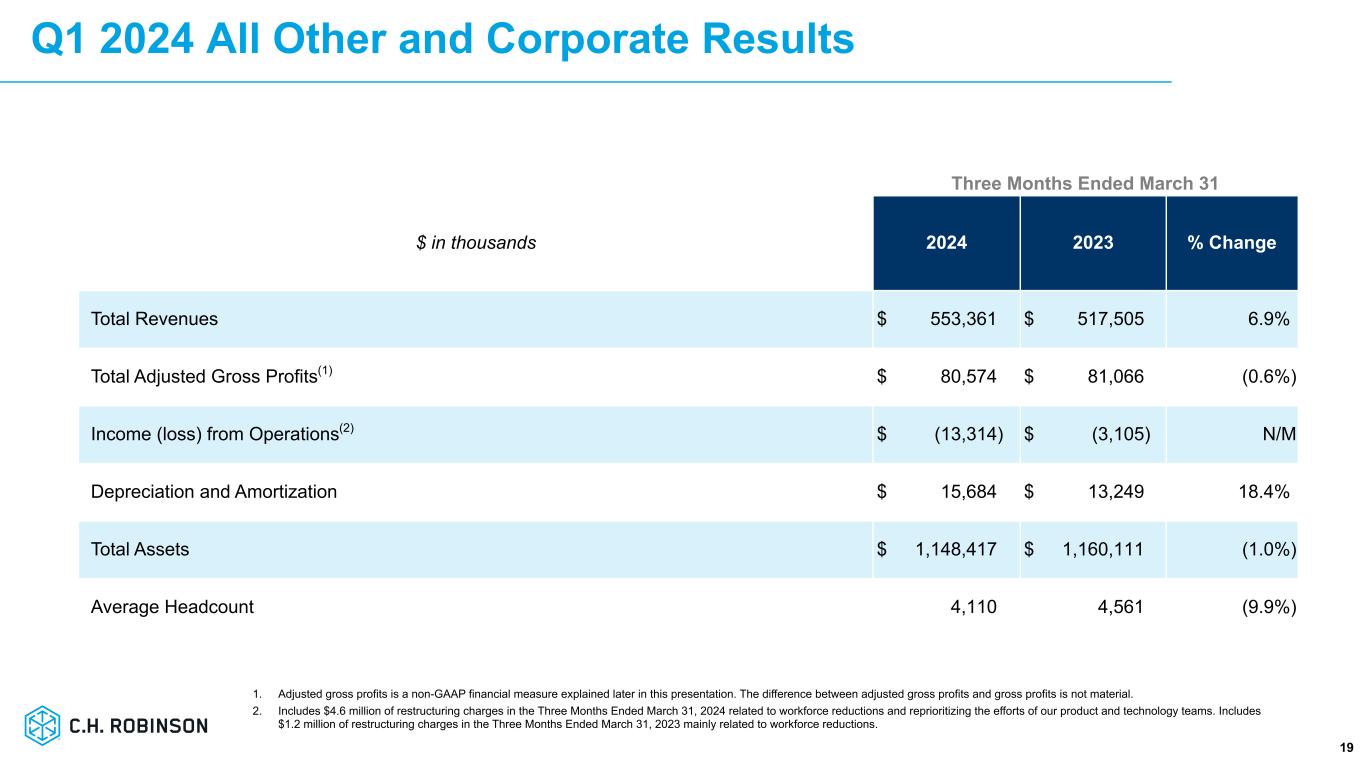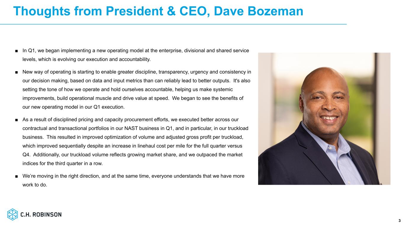 "In what continues to be a difficult environment, our resilient team of freight experts is responding to the challenge and embracing the new operating model and the innovative tools that we continue to arm them with. Our people have a powerful desire to win, and I thank them for their tireless efforts. They continue to be a differentiator for us and for our customers and carriers, and I’m confident in the team's willingness and ability to drive a higher level of discipline in our operational execution. We’re moving in the right direction, and at the same time, everyone understands that we have more work to do," Bozeman concluded.