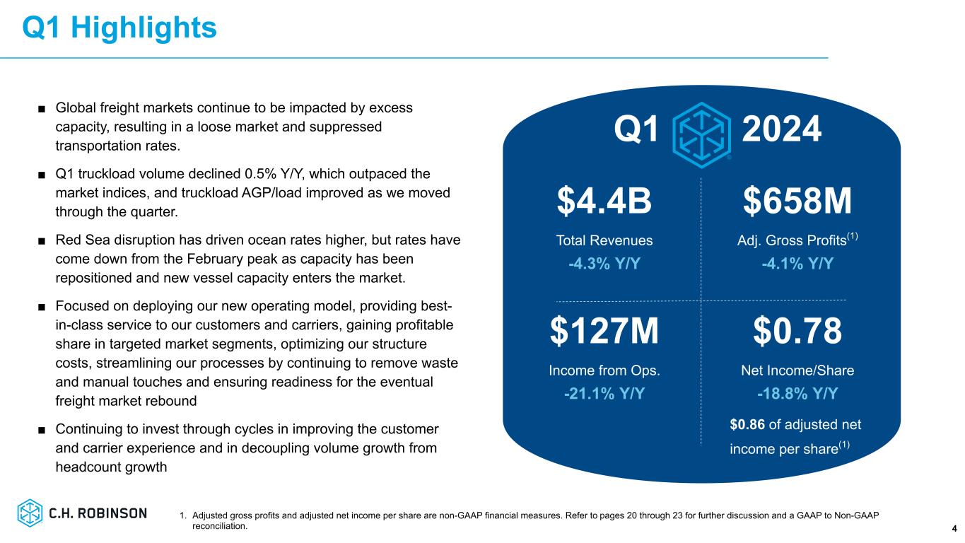 "As a result of disciplined pricing and capacity procurement efforts, we executed better across our contractual and transactional portfolios in our NAST business, and in particular, in our truckload business in the first quarter. This resulted in improved optimization of volume and adjusted gross profit per truckload, which improved sequentially despite an increase in our linehaul cost per mile for the full quarter versus the fourth quarter of 2023. Additionally, our first quarter truckload volume reflects growing market share, and we outpaced the market indices for the third quarter in a row," added Bozeman.