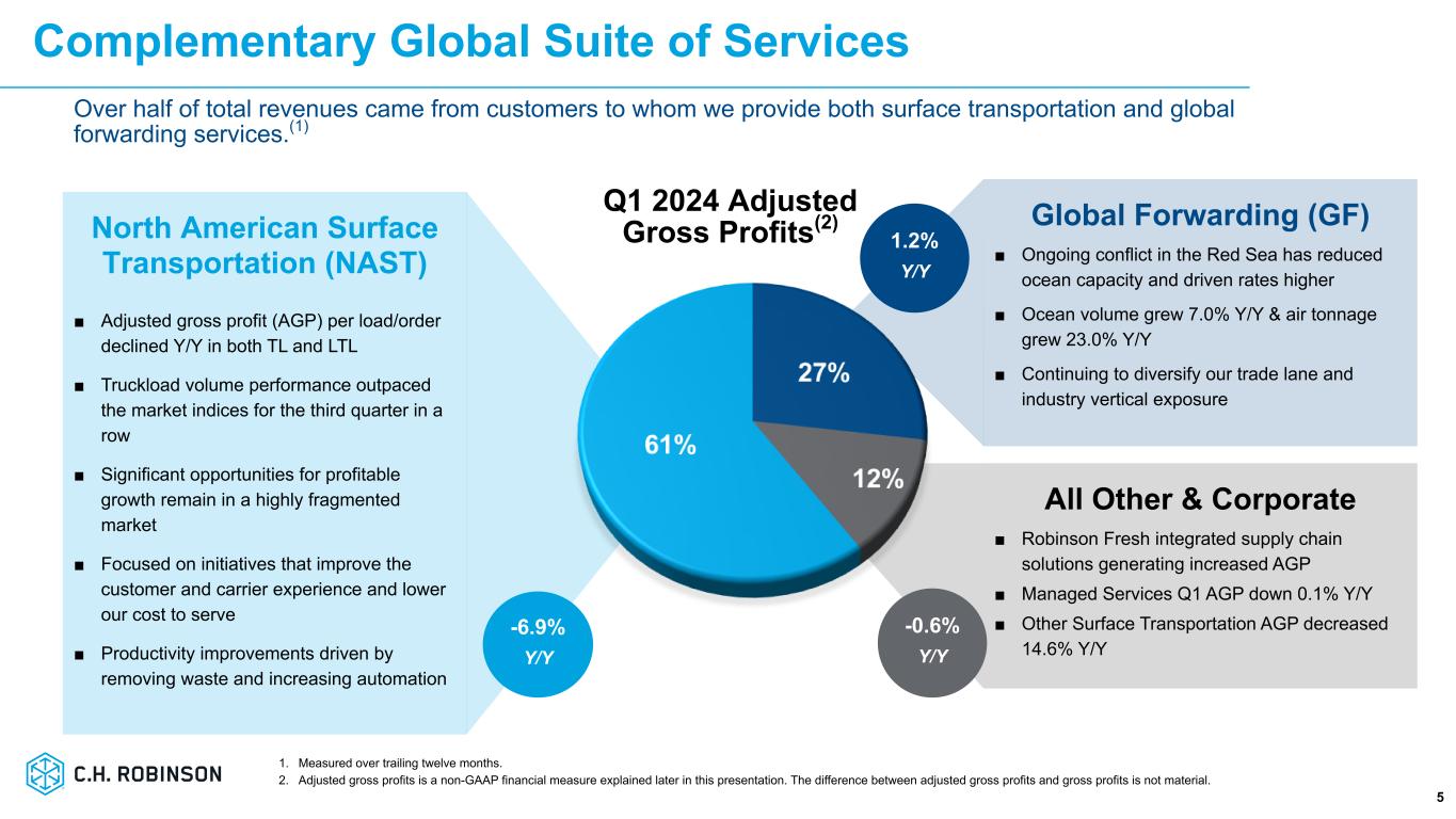 Q1 Highlights 4 ■ Global freight markets continue to be impacted by excess capacity, resulting in a loose market and suppressed transportation rates. ■ Q1 truckload volume declined 0.5% Y/Y, which outpaced the market indices, and truckload AGP/load improved as we moved through the quarter. ■ Red Sea disruption has driven ocean rates higher, but rates have come down from the February peak as capacity has been repositioned and new vessel capacity enters the market. ■ Focused on deploying our new operating model, providing best- in-class service to our customers and carriers, gaining profitable share in targeted market segments, optimizing our structure costs, streamlining our processes by continuing to remove waste and manual touches and ensuring readiness for the eventual freight market rebound ■ Continuing to invest through cycles in improving the customer and carrier experience and in decoupling volume growth from headcount growth $4.4B Total Revenues -4.3% Y/Y $658M Adj. Gross Profits(1) -4.1% Y/Y $127M Income from Ops. -21.1% Y/Y $0.78 Net Income/Share -18.8% Y/Y Q1 2024 1. Adjusted gross profits and adjusted net income per share are non-GAAP financial measures. Refer to pages 20 through 23 for further discussion and a GAAP to Non-GAAP reconciliation. $0.86 of adjusted net income per share(1)