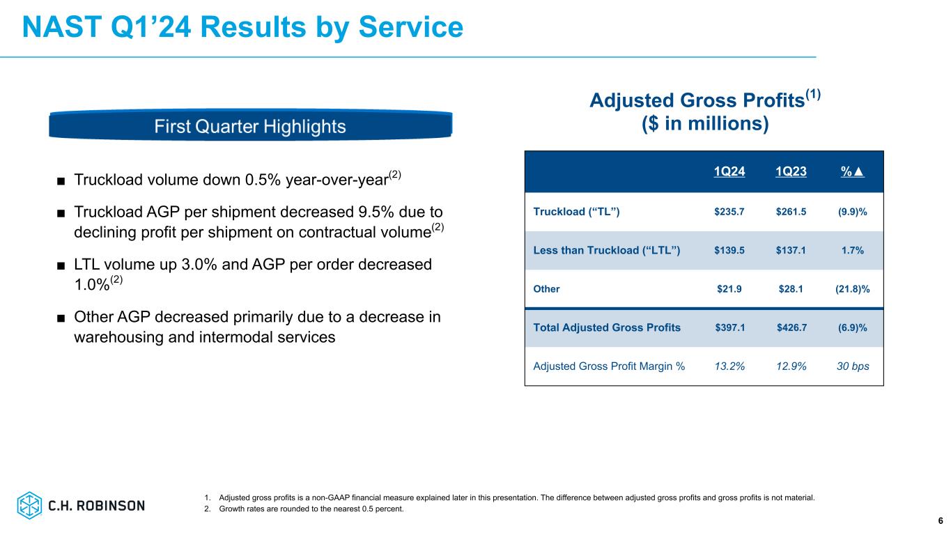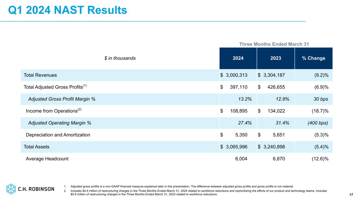 First quarter total revenues for the NAST segment totaled $3.0 billion, a decrease of 9.2% over the prior year, primarily driven by lower truckload pricing, reflecting an oversupply of truckload capacity compared to freight demand. NAST adjusted gross profits decreased 6.9% in the quarter to $397.1 million. Adjusted gross profits in truckload decreased 9.9% due to a 9.5% decrease in adjusted gross profit per shipment and a 0.5% decline in truckload shipments. Our average truckload linehaul rate per mile charged to our customers, which excludes fuel surcharges, decreased approximately 7.5% in the quarter compared to the prior year, while truckload linehaul cost per mile, excluding fuel surcharges, also decreased approximately 7.5%, resulting in an 8.5% decrease in truckload adjusted gross profit per mile. LTL adjusted gross profits increased 1.7% versus the year-ago period, driven by a 3.0% increase in LTL volume, partially offset by a 1.0% decrease in adjusted gross profit per order. NAST overall volume growth increased 1.5% for the quarter. Operating expenses decreased 1.5%, primarily due to lower technology expenses which were partially offset by a benefit in the prior year from lower credit losses. NAST average employee headcount was down 12.6% in the quarter. Income from operations decreased 18.7% to $108.9 million, and adjusted operating margin declined 400 basis points to 27.4%.