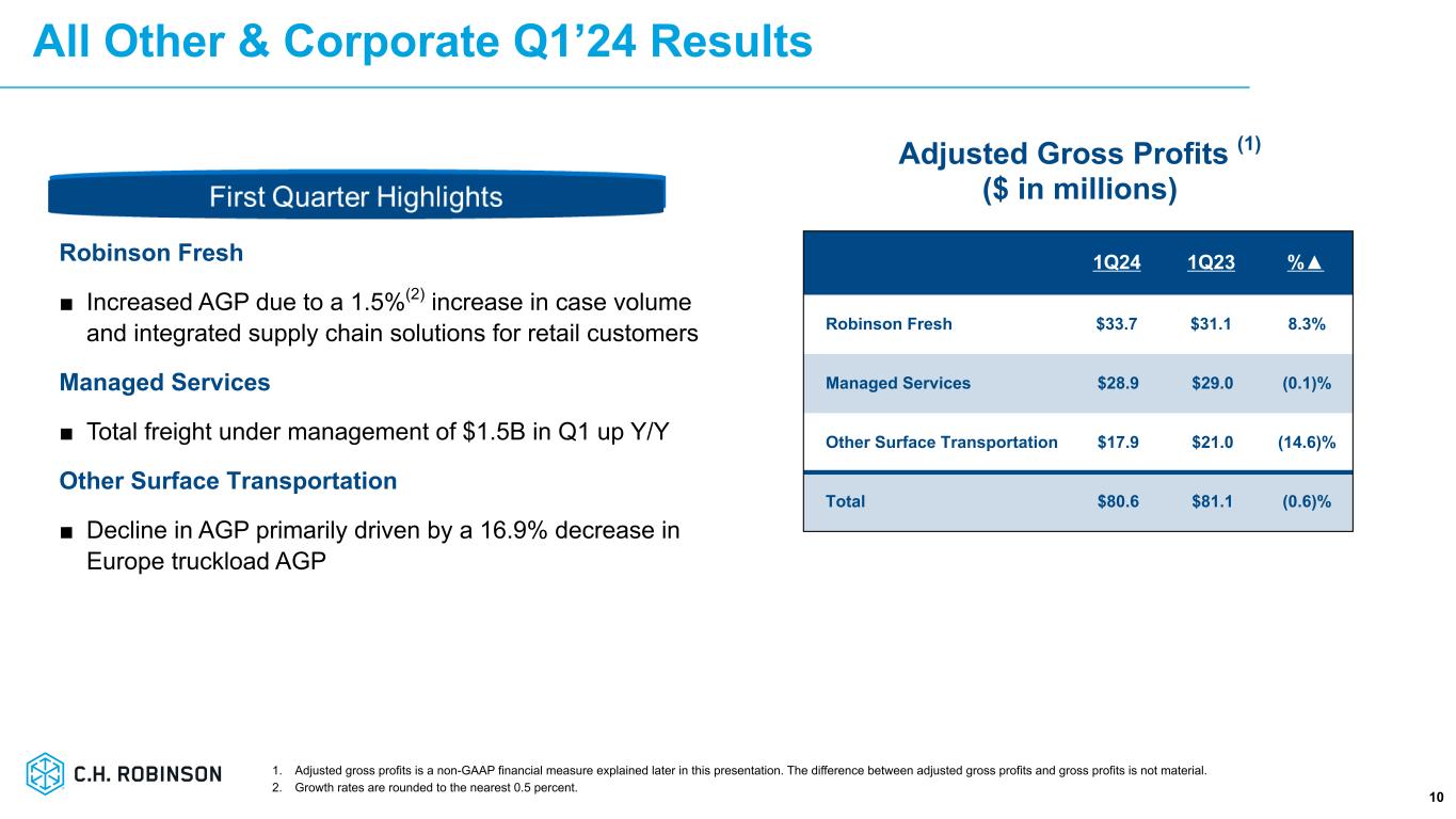 Global Forwarding Q1’24 Results by Service 9 1Q24 1Q23 %▲ Ocean $112.9 $110.1 2.5% Air $30.2 $30.9 (2.4)% Customs $26.1 $23.3 11.8% Other $10.8 $13.6 (19.4)% Total Adjusted Gross Profits $180.0 $177.9 1.2% Adjusted Gross Profit Margin % 21.0% 22.5% (150 bps) Adjusted Gross Profits (1) ($ in millions) ■ Ongoing conflict in the Red Sea is causing transit interruptions and vessel re-routing, which has reduced ocean capacity and driven rates higher on a sequential basis ■ Ocean AGP increased due to a 7.0% increase in shipments, partially offset by a 4.0% decrease in AGP per shipment(2) ■ Air AGP decreased due to a 20.5% decrease in AGP per metric ton shipped, partially offset by a 23.0% increase in metric tons shipped(2) ■ Customs AGP increased due to an 8.5% increase in volume and a 3.5% increase in AGP per transaction(2) 1. Adjusted gross profits is a non-GAAP financial measure explained later in this presentation. The difference between adjusted gross profits and gross profits is not material. 2. Growth rates are rounded to the nearest 0.5 percent.