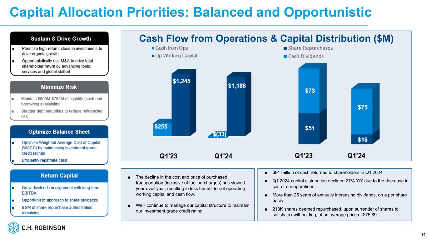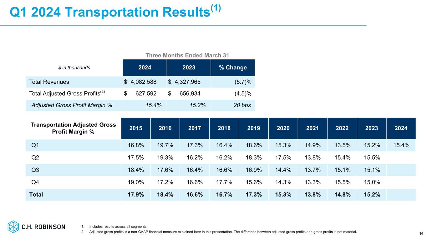 Eden Prairie, MN, May 1, 2024 - C.H. Robinson Worldwide, Inc. (“C.H. Robinson”) (Nasdaq: CHRW) today reported financial results for the quarter ended March 31, 2024.