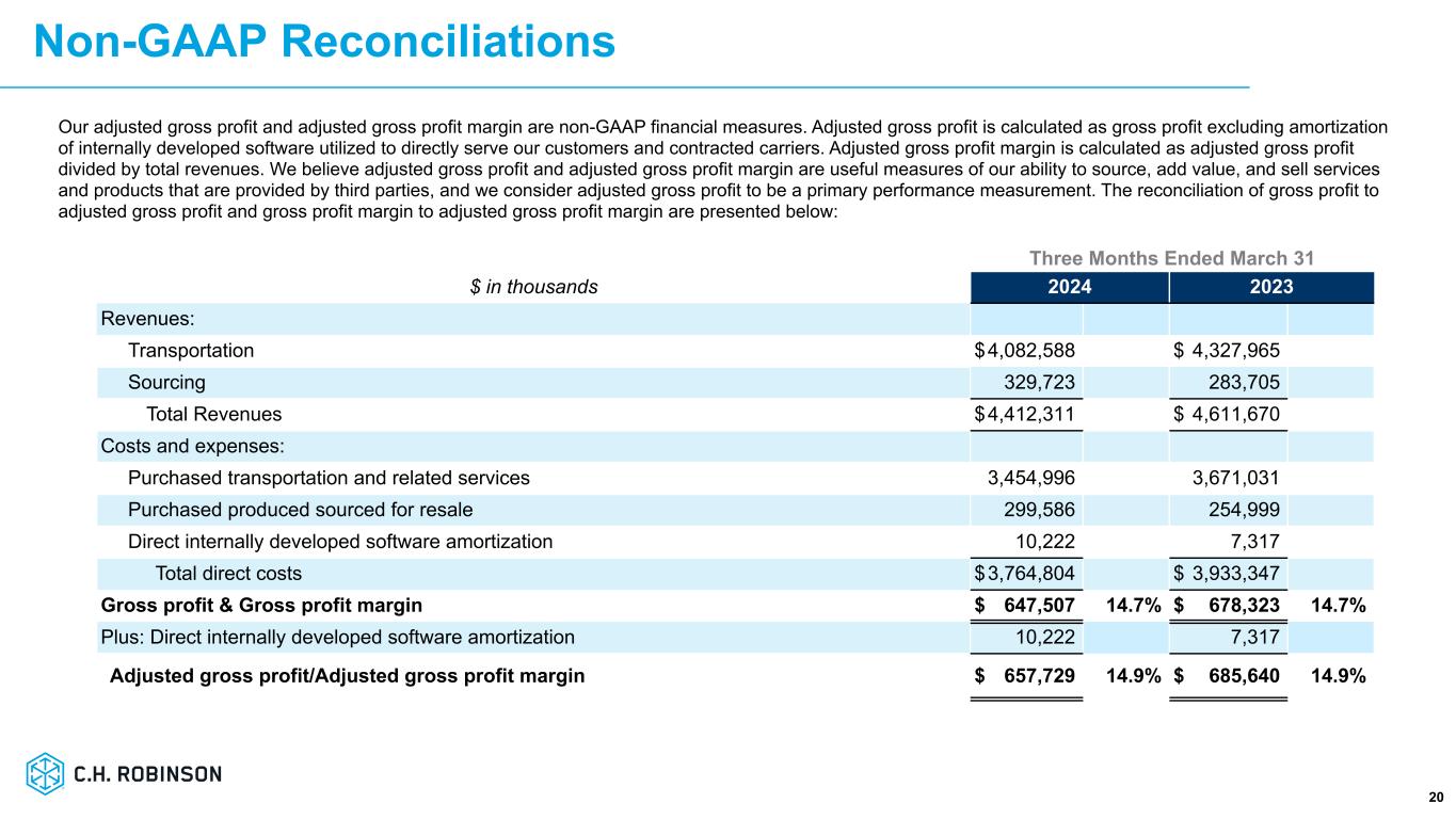 20 Our adjusted gross profit and adjusted gross profit margin are non-GAAP financial measures. Adjusted gross profit is calculated as gross profit excluding amortization of internally developed software utilized to directly serve our customers and contracted carriers. Adjusted gross profit margin is calculated as adjusted gross profit divided by total revenues. We believe adjusted gross profit and adjusted gross profit margin are useful measures of our ability to source, add value, and sell services and products that are provided by third parties, and we consider adjusted gross profit to be a primary performance measurement. The reconciliation of gross profit to adjusted gross profit and gross profit margin to adjusted gross profit margin are presented below: Three Months Ended March 31 $ in thousands 2024 2023 Revenues: Transportation $ 4,082,588 $ 4,327,965 Sourcing 329,723 283,705 Total Revenues $ 4,412,311 $ 4,611,670 Costs and expenses: Purchased transportation and related services 3,454,996 3,671,031 Purchased produced sourced for resale 299,586 254,999 Direct internally developed software amortization 10,222 7,317 Total direct costs $ 3,764,804 $ 3,933,347 Gross profit & Gross profit margin $ 647,507 14.7% $ 678,323 14.7% Plus: Direct internally developed software amortization 10,222 7,317 Adjusted gross profit/Adjusted gross profit margin $ 657,729 14.9% $ 685,640 14.9% Non-GAAP Reconciliations