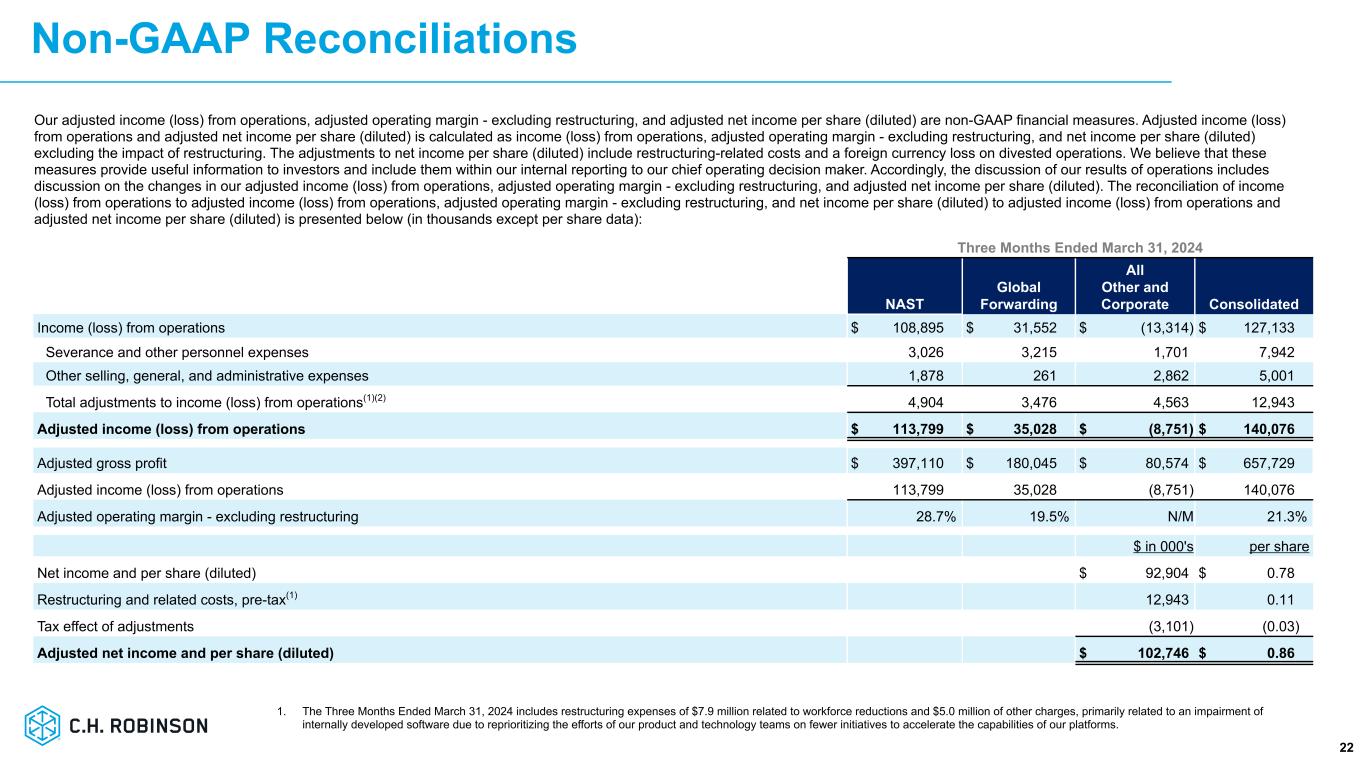 Non-GAAP Reconciliations 23 Our adjusted income (loss) from operations, adjusted operating margin - excluding restructuring, and adjusted net income per share (diluted) are non-GAAP financial measures. Adjusted income (loss) from operations and adjusted net income per share (diluted) is calculated as income (loss) from operations, adjusted operating margin - excluding restructuring, and net income per share (diluted) excluding the impact of restructuring. The adjustments to net income per share (diluted) include restructuring-related costs and a foreign currency loss on divested operations. We believe that these measures provide useful information to investors and include them within our internal reporting to our chief operating decision maker. Accordingly, the discussion of our results of operations includes discussion on the changes in our adjusted income (loss) from operations, adjusted operating margin - excluding restructuring, and adjusted net income per share (diluted). The reconciliation of income (loss) from operations to adjusted income (loss) from operations, adjusted operating margin - excluding restructuring, and net income per share (diluted) to adjusted income (loss) from operations and adjusted net income per share (diluted) is presented below (in thousands except per share data): Three Months Ended March 31, 2023 NAST Global Forwarding All Other and Corporate Consolidated Income (loss) from operations $ 134,022 $ 30,116 $ (3,105) $ 161,033 Severance and other personnel expenses 829 1,538 1,231 3,598 Other selling, general, and administrative expenses — 124 — 124 Total adjustments to income (loss) from operations(1) 829 1,662 1,231 3,722 Adjusted income (loss) from operations $ 134,851 $ 31,778 $ (1,874) $ 164,755 Adjusted gross profit $ 426,655 $ 177,919 $ 81,066 $ 685,640 Adjusted income (loss) from operations 134,851 31,778 (1,874) 164,755 Adjusted operating margin - excluding restructuring 31.6% 17.9% N/M 24.0% $ in 000's per share Net income and per share (diluted) $ 114,891 $ 0.96 Restructuring and related costs, pre-tax(1) 3,722 0.03 Foreign currency loss on divested operations, pre-tax 1,757 0.02 Tax effect of adjustments (894) (0.01) Adjusted net income and per share (diluted) $ 119,476 $ 1.00 1. The Three Months Ended March 31, 2023 includes restructuring expenses of $3.6 million related to workforce reductions and $0.1 million of other charges.
