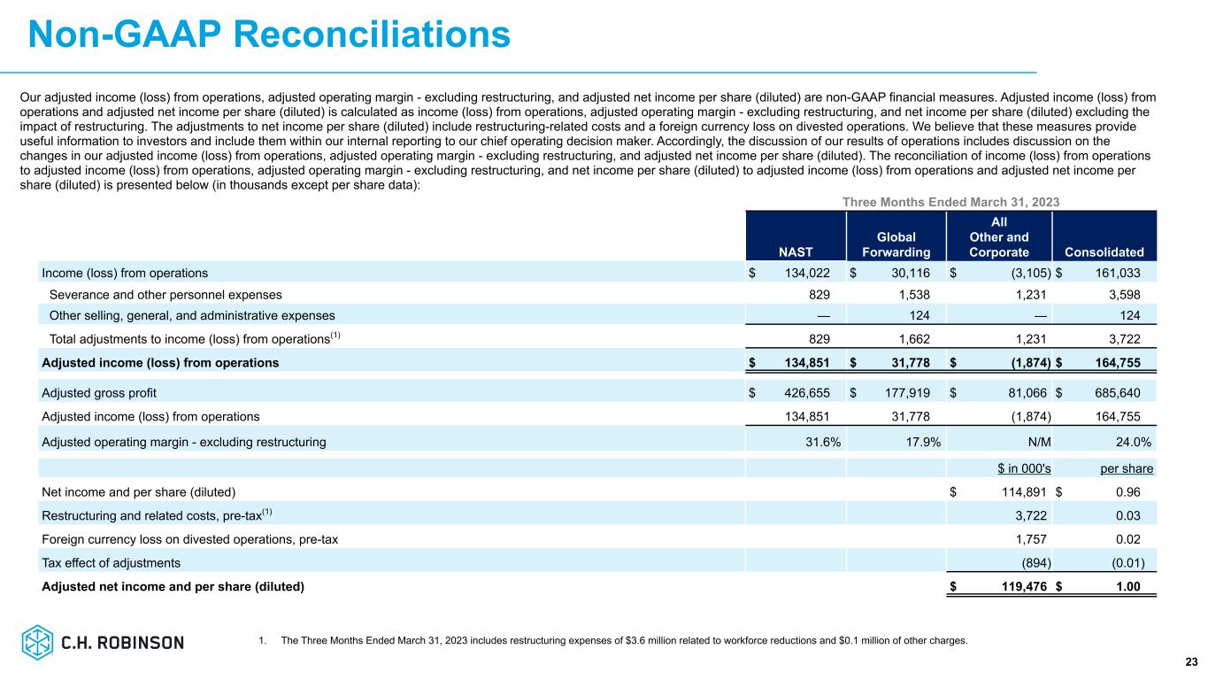 Non-GAAP Reconciliations 22 Our adjusted income (loss) from operations, adjusted operating margin - excluding restructuring, and adjusted net income per share (diluted) are non-GAAP financial measures. Adjusted income (loss) from operations and adjusted net income per share (diluted) is calculated as income (loss) from operations, adjusted operating margin - excluding restructuring, and net income per share (diluted) excluding the impact of restructuring. The adjustments to net income per share (diluted) include restructuring-related costs and a foreign currency loss on divested operations. We believe that these measures provide useful information to investors and include them within our internal reporting to our chief operating decision maker. Accordingly, the discussion of our results of operations includes discussion on the changes in our adjusted income (loss) from operations, adjusted operating margin - excluding restructuring, and adjusted net income per share (diluted). The reconciliation of income (loss) from operations to adjusted income (loss) from operations, adjusted operating margin - excluding restructuring, and net income per share (diluted) to adjusted income (loss) from operations and adjusted net income per share (diluted) is presented below (in thousands except per share data): Three Months Ended March 31, 2024 NAST Global Forwarding All Other and Corporate Consolidated Income (loss) from operations $ 108,895 $ 31,552 $ (13,314) $ 127,133 Severance and other personnel expenses 3,026 3,215 1,701 7,942 Other selling, general, and administrative expenses 1,878 261 2,862 5,001 Total adjustments to income (loss) from operations(1)(2) 4,904 3,476 4,563 12,943 Adjusted income (loss) from operations $ 113,799 $ 35,028 $ (8,751) $ 140,076 Adjusted gross profit $ 397,110 $ 180,045 $ 80,574 $ 657,729 Adjusted income (loss) from operations 113,799 35,028 (8,751) 140,076 Adjusted operating margin - excluding restructuring 28.7% 19.5% N/M 21.3% $ in 000's per share Net income and per share (diluted) $ 92,904 $ 0.78 Restructuring and related costs, pre-tax(1) 12,943 0.11 Tax effect of adjustments (3,101) (0.03) Adjusted net income and per share (diluted) $ 102,746 $ 0.86 1. The Three Months Ended March 31, 2024 includes restructuring expenses of $7.9 million related to workforce reductions and $5.0 million of other charges, primarily related to an impairment of internally developed software due to reprioritizing the efforts of our product and technology teams on fewer initiatives to accelerate the capabilities of our platforms.