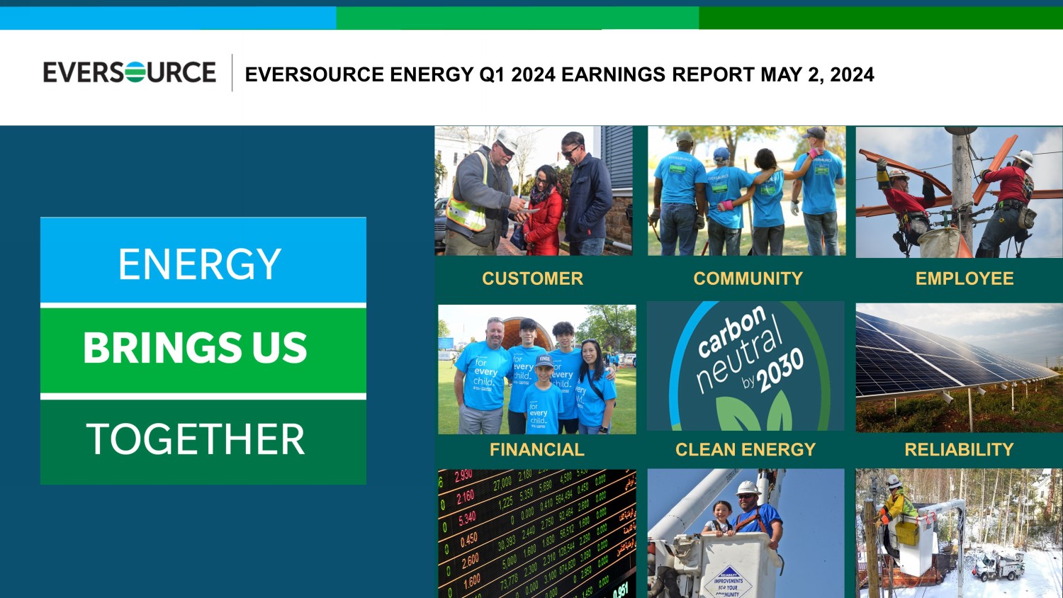 EVERSOURCE ENERGY Q1 2024 EARNINGS REPORT EVERSOURCE ENERGY Q1 2024 EARNINGS REPORT MAY 2, 2024 CUSTOMER COMMUNITY FINANCIAL EMPLOYEE CLEAN ENERGY RELIABILITY