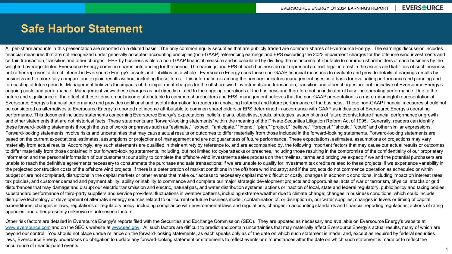 EVERSOURCE ENERGY Q1 2024 EARNINGS REPORT Safe Harbor Statement 1 All per - share amounts in this presentation are reported on a diluted basis. The only common equity securities that are publicly traded are common shares of Eversource Energy. The earnings discussion includes financial measures that are not recognized under generally accepted accounting principles (non - GAAP) referencing earnings and EP S excluding the 2023 impairment charges for the offshore wind investments and certain transaction, transition and other charges. EPS by business is also a non - GAAP financial measure and is calculated by di viding the net income attributable to common shareholders of each business by the weighted average diluted Eversource Energy common shares outstanding for the period. The earnings and EPS of each business do no t represent a direct legal interest in the assets and liabilities of such business, but rather represent a direct interest in Eversource Energy’s assets and liabilities as a whole. Eversource Energy uses thes e n on - GAAP financial measures to evaluate and provide details of earnings results by business and to more fully compare and explain results without including these items. This information is among the primary ind icators management uses as a basis for evaluating performance and planning and forecasting of future periods. Management believes the impacts of the impairment charges for the offshore wind investments an d t ransaction; transition and other charges are not indicative of Eversource Energy’s ongoing costs and performance. Management views these charges as not directly related to the ongoing operations of the busin ess and therefore not an indicator of baseline operating performance. Due to the nature and significance of the effect of these items on net income attributable to common shareholders and EPS, management be lie ves that the non - GAAP presentation is a more meaningful representation of Eversource Energy’s financial performance and provides additional and useful information to readers in analyzing historical a nd future performance of the business. These non - GAAP financial measures should not be considered as alternatives to Eversource Energy’s reported net income attributable to common shareholders or EPS determine d i n accordance with GAAP as indicators of Eversource Energy’s operating performance. This document includes statements concerning Eversource Energy’s expectations, beliefs, plans, objectives, goals , s trategies, assumptions of future events, future financial performance or growth and other statements that are not historical facts. These statements are “forward - looking statements” within the meaning of the Private Securities Litigation Reform Act of 1995. Generally, readers can identify these forward - looking statements through the use of words or phrases such as “estimate,” “expect,” “anticipate,” “intend,” “plan ,” “project,” “believe,” “forecast,” “should,” “could” and other similar expressions. Forward - looking statements involve risks and uncertainties that may cause actual results or outcomes to differ materially from t hose included in the forward - looking statements. Forward - looking statements are based on the current expectations, estimates, assumptions or projections of management and are not guarantees of future perfo rma nce. These expectations, estimates, assumptions or projections may vary materially from actual results. Accordingly, any such statements are qualified in their entirety by reference to, and are acc omp anied by, the following important factors that may cause our actual results or outcomes to differ materially from those contained in our forward - looking statements, including, but not limited to: cyberattacks or brea ches, including those resulting in the compromise of the confidentiality of our proprietary information and the personal information of our customers; our ability to complete the offshore wind investments sales proces s o n the timelines, terms and pricing we expect; if we and the potential purchasers are unable to reach the definitive agreements necessary to consummate the purchase and sale transactions; if we are unable to qua lif y for investment tax credits related to these projects; if we experience variability in the projected construction costs of the offshore wind projects, if there is a deterioration of market conditions in the offsh ore wind industry; and if the projects do not commence operation as scheduled or within budget or are not completed, disruptions in the capital markets or other events that make our access to necessary capital mor e d ifficult or costly; changes in economic conditions, including impact on interest rates, tax policies, and customer demand and payment ability; ability or inability to commence and complete our major strategic deve lop ment projects and opportunities; acts of war or terrorism, physical attacks or grid disturbances that may damage and disrupt our electric transmission and electric, natural gas, and water distribution systems; ac tions or inaction of local, state and federal regulatory, public policy and taxing bodies; substandard performance of third - party suppliers and service providers; fluctuations in weather patterns, including extreme weat her due to climate change; changes in business conditions, which could include disruptive technology or development of alternative energy sources related to our current or future business model; contamina tio n of, or disruption in, our water supplies; changes in levels or timing of capital expenditures; changes in laws, regulations or regulatory policy, including compliance with environmental laws and regulations ; c hanges in accounting standards and financial reporting regulations; actions of rating agencies; and other presently unknown or unforeseen factors. Other risk factors are detailed in Eversource Energy’s reports filed with the S