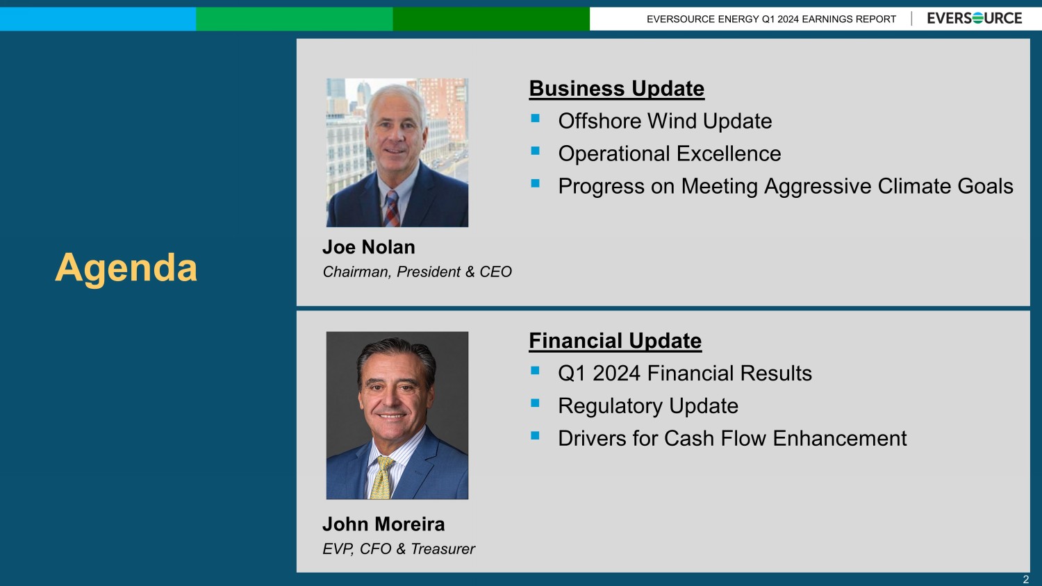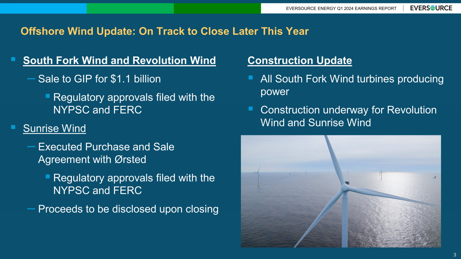 EVERSOURCE ENERGY Q1 2024 EARNINGS REPORT Agenda Business Update ▪ Offshore Wind Update ▪ Operational Excellence ▪ Progress on Meeting Aggressive Climate Goals 2 Joe Nolan Chairman, President & CEO John Moreira EVP, CFO & Treasurer Financial Update ▪ Q1 2024 Financial Results ▪ Regulatory Update ▪ Drivers for Cash Flow Enhancement