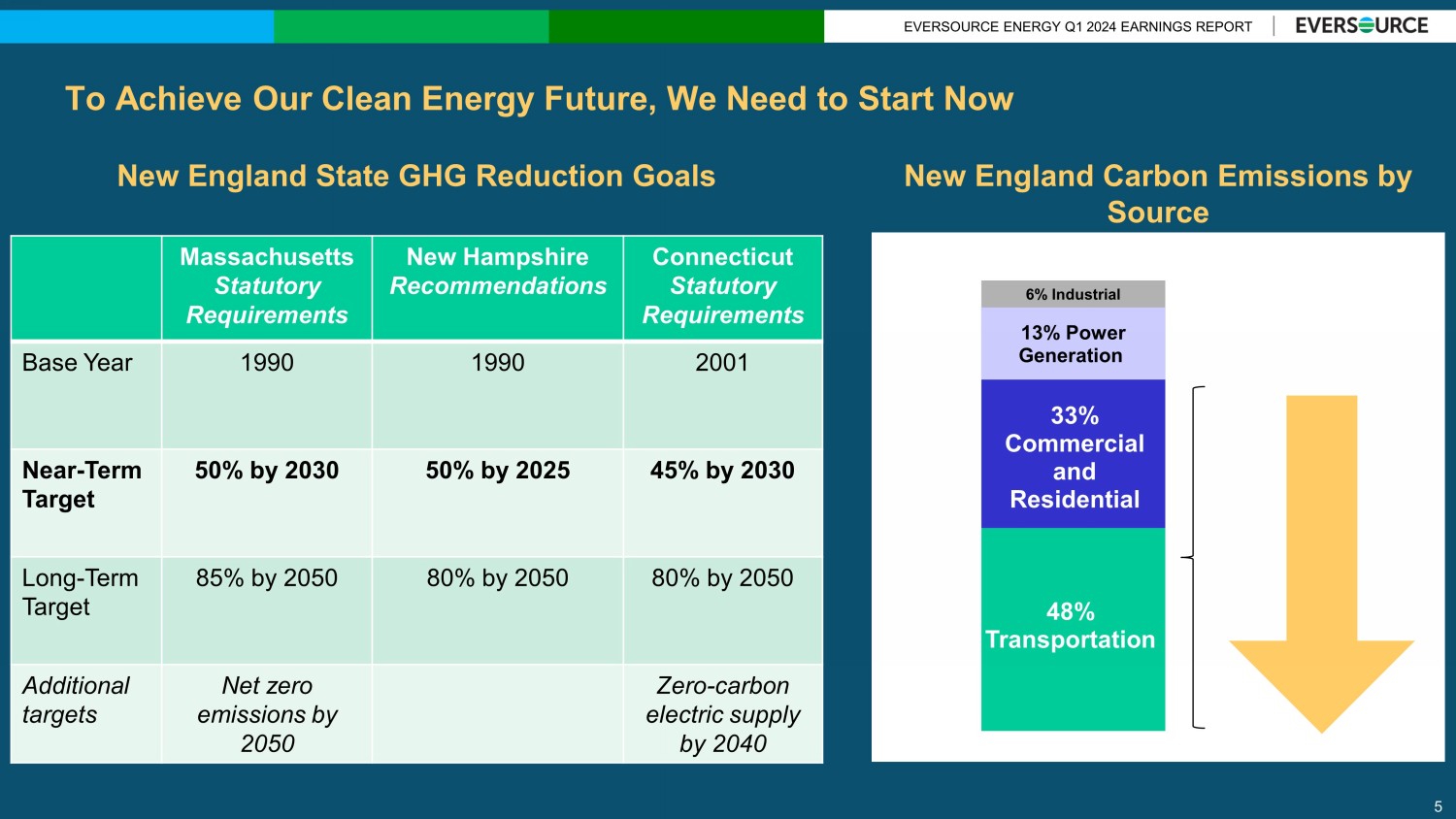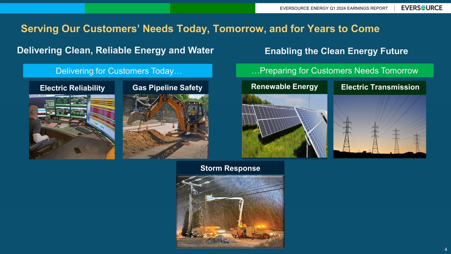 EVERSOURCE ENERGY Q1 2024 EARNINGS REPORT Serving Our Customers’ Needs Today, Tomorrow, and for Years to Come Delivering for Customers Today… Enabling the Clean Energy Future Delivering Clean, Reliable Energy and Water …Preparing for Customers Needs Tomorrow Electric Reliability Gas Pipeline Safety Renewable Energy Electric Transmission Storm Response 4