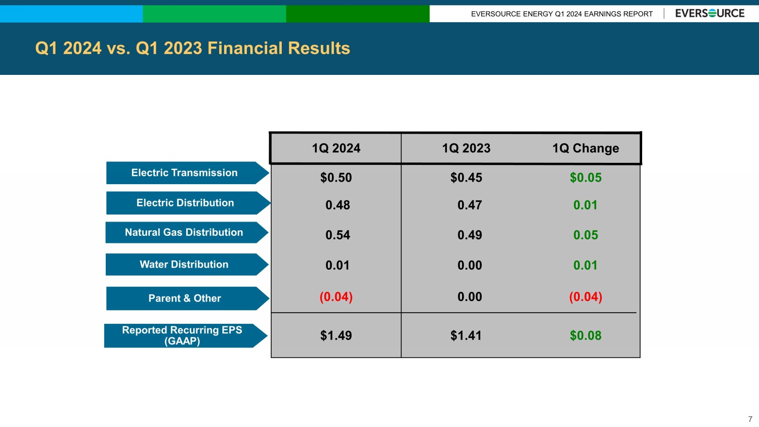 EVERSOURCE ENERGY Q1 2024 EARNINGS REPORT Electric Sector Modernization Plan A Comprehensive Roadmap to Achieve Massachusetts’ Clean Energy Goals 6 SYSTEM PLANNING PROCESS Incorporated MA’s anticipated demand growth assumptions for EV adoption and electric heating Analyzed expected growth by region, community and circuit Identified areas where system upgrades are needed, focusing first on lowest - cost options and non - wires alternatives Leveraged formal stakeholder engagement process to seek communities’ perspectives before projects proceed to siting PLAN TO ENHANCE THE GRID & ENABLE CLEAN ENERGY IDENTIFIES NEEDED INVESTMENTS OVER THE NEXT 10 YEARS to support clean energy resources and drive improvements in grid reliability and resiliency Increases electrification hosting capacity by 180% over the next decade Allows for the adoption of 2.5 million electric vehicles statewide and 1 million heat pumps, meeting over 80% of the state’s 2050 goals Enables 5.8 GW of solar, exceeding the state’s 2040 goals, and reaching over 63% of its 2050 goals