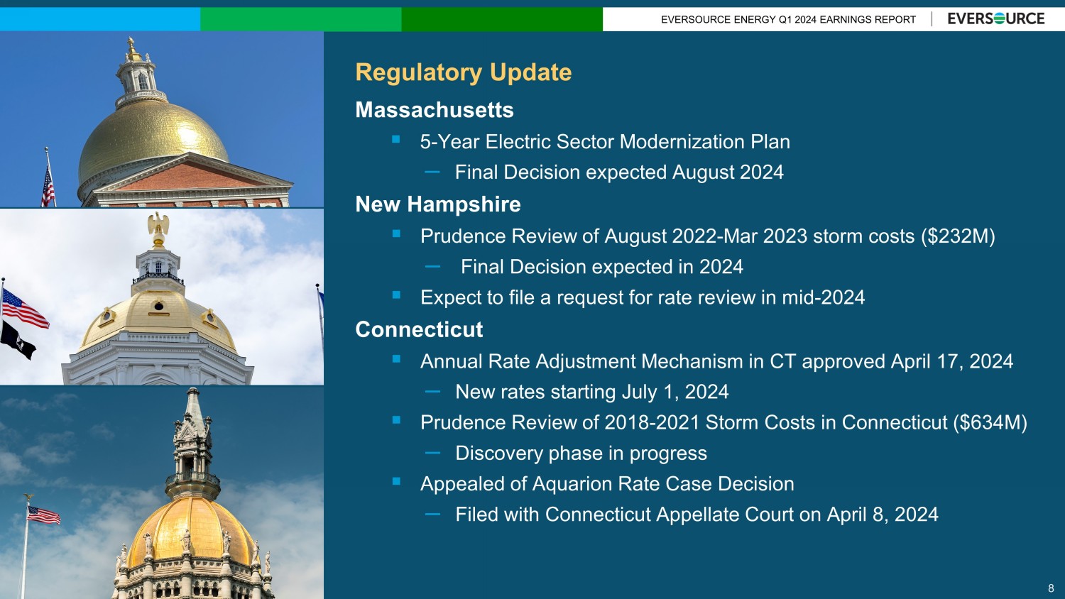 EVERSOURCE ENERGY Q1 2024 EARNINGS REPORT Q1 2024 vs. Q1 2023 Financial Results 7 1Q 2024 1Q 2023 1Q Change $0.50 $0.45 $0.05 0.48 0.47 0.01 0.54 0.49 0.05 0.01 0.00 0.01 (0.04) 0.00 (0.04) $1.49 $1.41 $0.08 Electric Transmission Electric Distribution Natural Gas Distribution Water Distribution Parent & Other Reported Recurring EPS (GAAP)