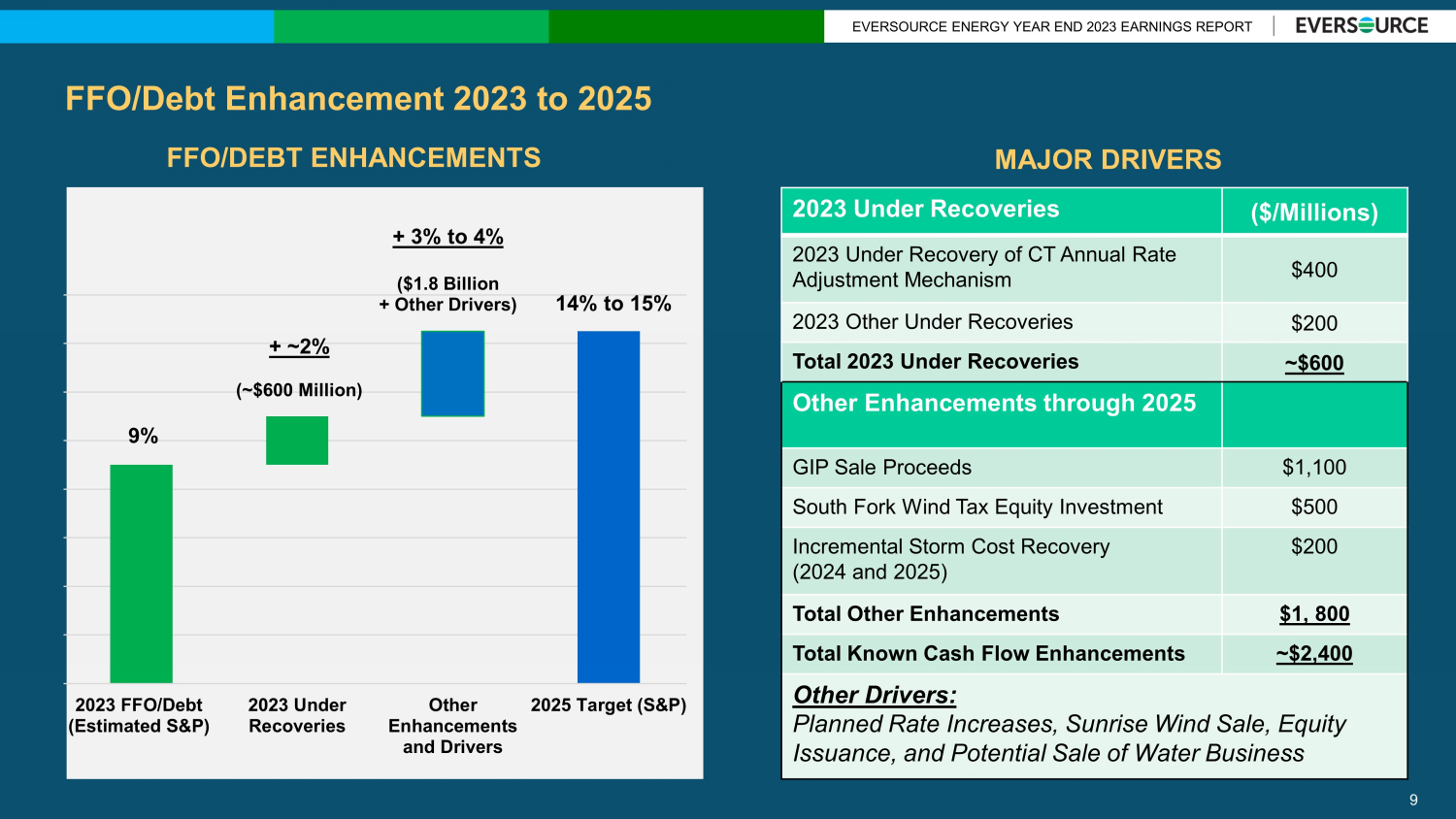 EVERSOURCE ENERGY Q1 2024 EARNINGS REPORT Regulatory Update Massachusetts ▪ 5 - Year Electric Sector Modernization Plan – Final Decision expected August 2024 New Hampshire ▪ Prudence Review of August 2022 - Mar 2023 storm costs ($232M) – Final Decision expected in 2024 ▪ Expect to file a request for rate review in mid - 2024 Connecticut ▪ Annual Rate Adjustment Mechanism in CT approved April 17, 2024 – New rates starting July 1, 2024 ▪ Prudence Review of 2018 - 2021 Storm Costs in Connecticut ($634M) – Discovery phase in progress ▪ Appealed of Aquarion Rate Case Decision – Filed with Connecticut Appellate Court on April 8, 2024 8