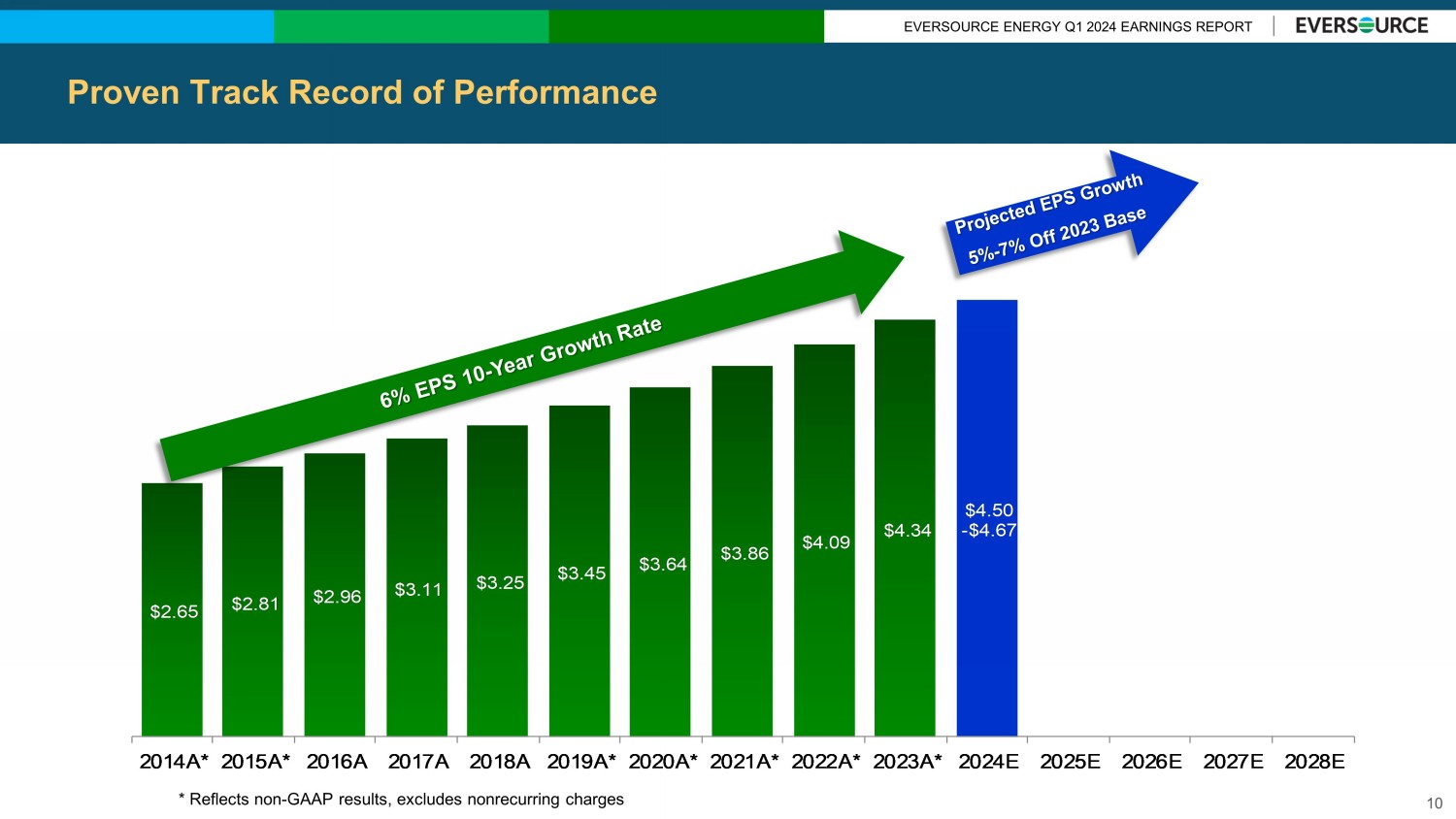 EVERSOURCE ENERGY YEAR END 2023 EARNINGS REPORT FFO/Debt Enhancement 2023 to 2025 9 FFO/DEBT ENHANCEMENTS 9% + ~2% (~$600 Million) + 3% to 4% ($1.8 Billion + Other Drivers) 14% to 15% 2023 FFO/Debt (Estimated S&P) 2023 Under Recoveries Other Enhancements and Drivers 2025 Target (S&P) 2023 Under Recoveries ($/Millions) 2023 Under Recovery of CT Annual Rate Adjustment Mechanism $400 2023 Other Under Recoveries $200 Total 2023 Under Recoveries ~$600 Other Enhancements through 2025 GIP Sale Proceeds $1,100 South Fork Wind Tax Equity Investment $500 Incremental Storm Cost Recovery (2024 and 2025) $200 Total Other Enhancements $1, 800 Total Known Cash Flow Enhancements ~$2,400 Other Drivers: Planned Rate Increases, Sunrise Wind Sale, Equity Issuance, and Potential Sale of Water Business MAJOR DRIVERS