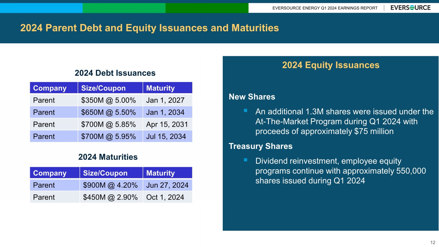 EVERSOURCE ENERGY Q1 2024 EARNINGS REPORT 2024 Parent Debt and Equity Issuances and Maturities Company Size/Coupon Maturity Parent $900M @ 4.20% Jun 27, 2024 Parent $450M @ 2.90% Oct 1, 2024 2024 Debt Issuances 2024 Maturities Company Size/Coupon Maturity Parent $350M @ 5.00% Jan 1, 2027 Parent $650M @ 5.50% Jan 1, 2034 Parent $700M @ 5.85% Apr 15, 2031 Parent $700M @ 5.95% Jul 15, 2034 New Shares ▪ An additional 1.3M shares were issued under the At - The - Market Program during Q1 2024 with proceeds of approximately $75 million Treasury Shares ▪ Dividend reinvestment, employee equity programs continue with approximately 5 50 ,000 shares issued during Q1 2024 2024 Equity Issuances 12