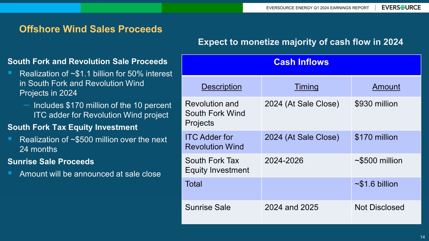 EVERSOURCE ENERGY Q1 2024 EARNINGS REPORT $1,115 $1,207 $1,448 $1,200 $1,207 $1,053 $1,166 $1,146 $1,244 $1,354 $1,772 $2,009 $1,869 $2,051 $2,006 $1,770 $799 $804 $998 $1,044 $1,087 $1,142 $1,089 $1,079 $144 $155 $162 $169 $204 $218 $234 $251 $239 $266 $213 $225 $234 $223 $202 $239 $3,541 $3,786 $4,593 $4,647 $4,601 $4,687 $4,697 $4,485 $0 $500 $1,000 $1,500 $2,000 $2,500 $3,000 $3,500 $4,000 $4,500 $5,000 2021A 2022A 2023A 2024E 2025E 2026E 2027E 2028E Transmission Electric Distribution Natural Gas Distribution Water IT and Facilities $ In Millions $23.1 Billion 2024 - 2028 Projected Capital Expenditures for Core Businesses 13