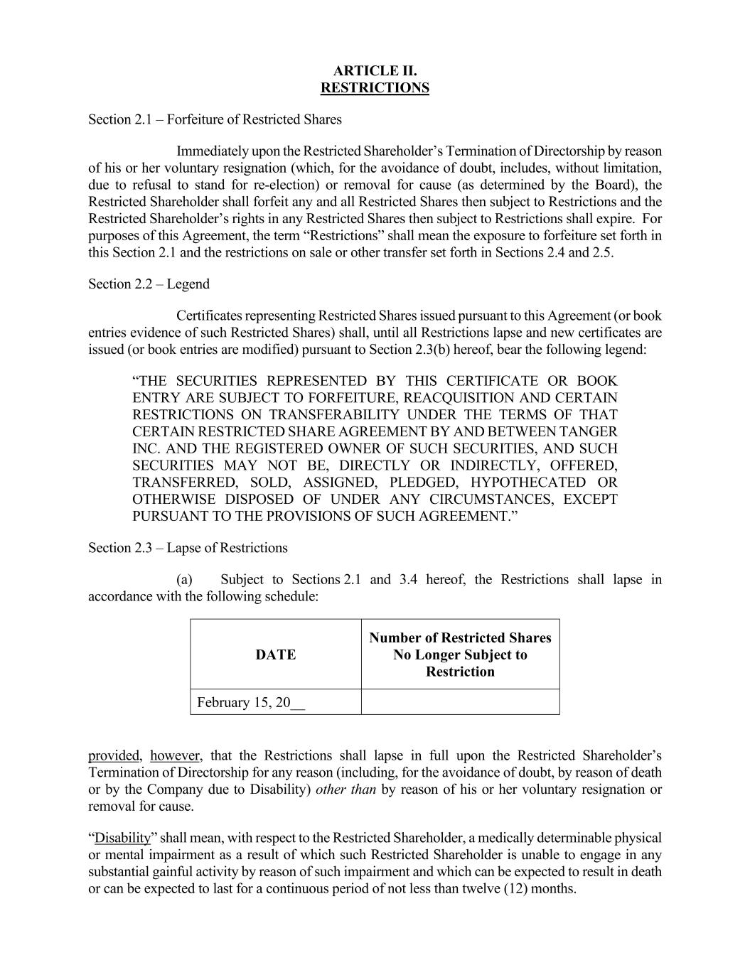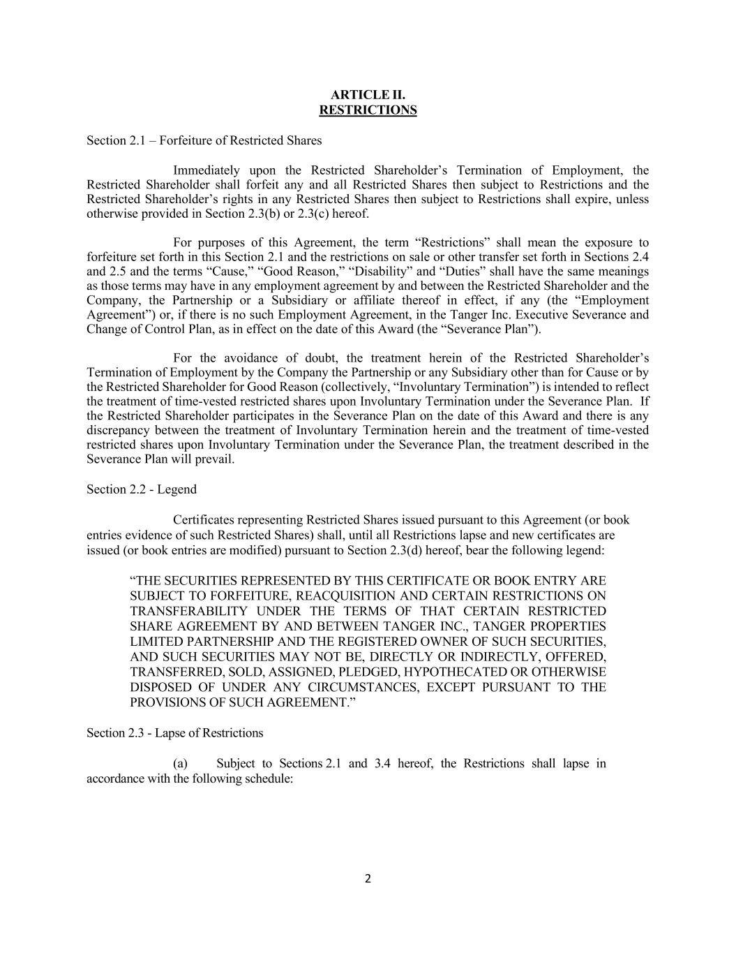 2 ARTICLE II. RESTRICTIONS Section 2.1 – Forfeiture of Restricted Shares Immediately upon the Restricted Shareholder’s Termination of Employment, the Restricted Shareholder shall forfeit any and all Restricted Shares then subject to Restrictions and the Restricted Shareholder’s rights in any Restricted Shares then subject to Restrictions shall expire, unless otherwise provided in Section 2.3(b) or 2.3(c) hereof. For purposes of this Agreement, the term “Restrictions” shall mean the exposure to forfeiture set forth in this Section 2.1 and the restrictions on sale or other transfer set forth in Sections 2.4 and 2.5 and the terms “Cause,” “Good Reason,” “Disability” and “Duties” shall have the same meanings as those terms may have in any employment agreement by and between the Restricted Shareholder and the Company, the Partnership or a Subsidiary or affiliate thereof in effect, if any (the “Employment Agreement”) or, if there is no such Employment Agreement, in the Tanger Inc. Executive Severance and Change of Control Plan, as in effect on the date of this Award (the “Severance Plan”). For the avoidance of doubt, the treatment herein of the Restricted Shareholder’s Termination of Employment by the Company the Partnership or any Subsidiary other than for Cause or by the Restricted Shareholder for Good Reason (collectively, “Involuntary Termination”) is intended to reflect the treatment of time-vested restricted shares upon Involuntary Termination under the Severance Plan. If the Restricted Shareholder participates in the Severance Plan on the date of this Award and there is any discrepancy between the treatment of Involuntary Termination herein and the treatment of time-vested restricted shares upon Involuntary Termination under the Severance Plan, the treatment described in the Severance Plan will prevail. Section 2.2 - Legend Certificates representing Restricted Shares issued pursuant to this Agreement (or book entries evidence of such Restricted Shares) shall, until all Restrictions lapse and new certificates are issued (or book entries are modified) pursuant to Section 2.3(d) hereof, bear the following legend: “THE SECURITIES REPRESENTED BY THIS CERTIFICATE OR BOOK ENTRY ARE SUBJECT TO FORFEITURE, REACQUISITION AND CERTAIN RESTRICTIONS ON TRANSFERABILITY UNDER THE TERMS OF THAT CERTAIN RESTRICTED SHARE AGREEMENT BY AND BETWEEN TANGER INC., TANGER PROPERTIES LIMITED PARTNERSHIP AND THE REGISTERED OWNER OF SUCH SECURITIES, AND SUCH SECURITIES MAY NOT BE, DIRECTLY OR INDIRECTLY, OFFERED, TRANSFERRED, SOLD, ASSIGNED, PLEDGED, HYPOTHECATED OR OTHERWISE DISPOSED OF UNDER ANY CIRCUMSTANCES, EXCEPT PURSUANT TO THE PROVISIONS OF SUCH AGREEMENT.” Section 2.3 - Lapse of Restrictions (a) Subject to Sections 2.1 and 3.4 hereof, the Restrictions shall lapse in accordance with the following schedule: