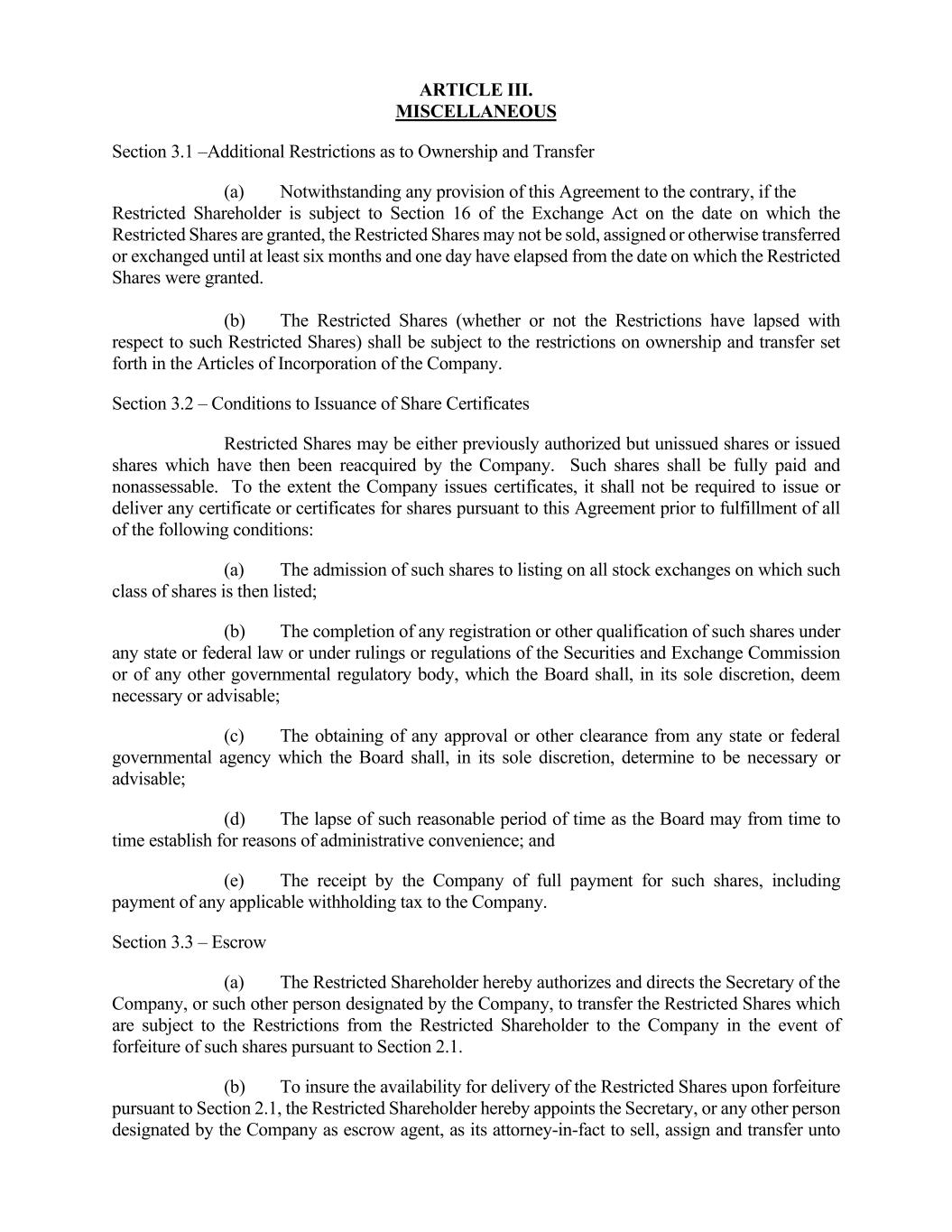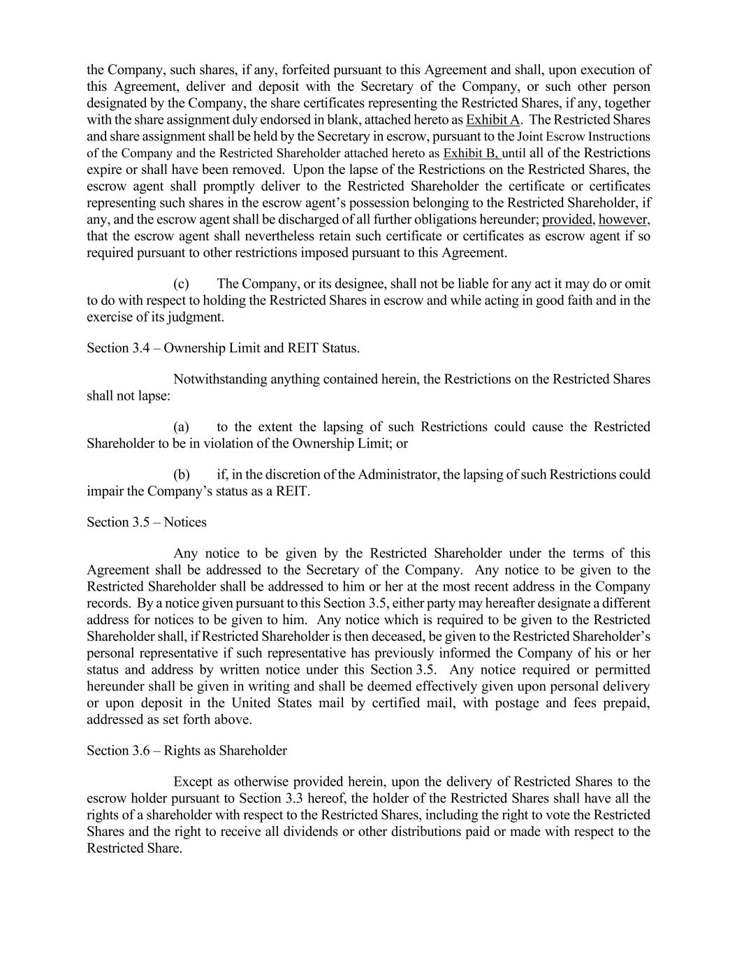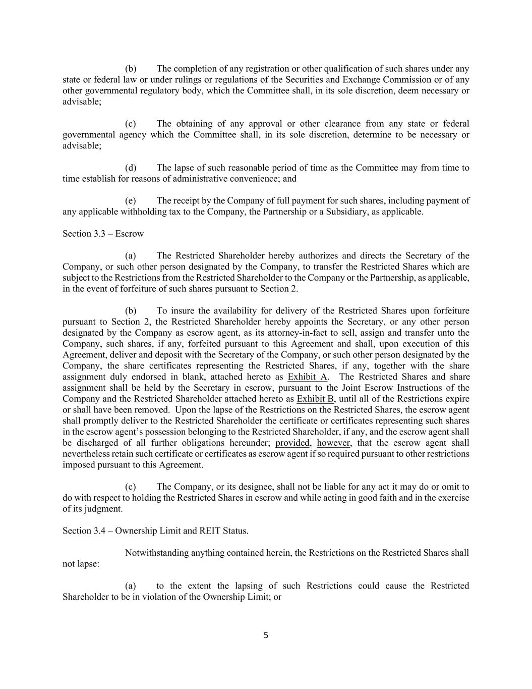 5 (b) The completion of any registration or other qualification of such shares under any state or federal law or under rulings or regulations of the Securities and Exchange Commission or of any other governmental regulatory body, which the Committee shall, in its sole discretion, deem necessary or advisable; (c) The obtaining of any approval or other clearance from any state or federal governmental agency which the Committee shall, in its sole discretion, determine to be necessary or advisable; (d) The lapse of such reasonable period of time as the Committee may from time to time establish for reasons of administrative convenience; and (e) The receipt by the Company of full payment for such shares, including payment of any applicable withholding tax to the Company, the Partnership or a Subsidiary, as applicable. Section 3.3 – Escrow (a) The Restricted Shareholder hereby authorizes and directs the Secretary of the Company, or such other person designated by the Company, to transfer the Restricted Shares which are subject to the Restrictions from the Restricted Shareholder to the Company or the Partnership, as applicable, in the event of forfeiture of such shares pursuant to Section 2. (b) To insure the availability for delivery of the Restricted Shares upon forfeiture pursuant to Section 2, the Restricted Shareholder hereby appoints the Secretary, or any other person designated by the Company as escrow agent, as its attorney-in-fact to sell, assign and transfer unto the Company, such shares, if any, forfeited pursuant to this Agreement and shall, upon execution of this Agreement, deliver and deposit with the Secretary of the Company, or such other person designated by the Company, the share certificates representing the Restricted Shares, if any, together with the share assignment duly endorsed in blank, attached hereto as Exhibit A. The Restricted Shares and share assignment shall be held by the Secretary in escrow, pursuant to the Joint Escrow Instructions of the Company and the Restricted Shareholder attached hereto as Exhibit B, until all of the Restrictions expire or shall have been removed. Upon the lapse of the Restrictions on the Restricted Shares, the escrow agent shall promptly deliver to the Restricted Shareholder the certificate or certificates representing such shares in the escrow agent’s possession belonging to the Restricted Shareholder, if any, and the escrow agent shall be discharged of all further obligations hereunder; provided, however, that the escrow agent shall nevertheless retain such certificate or certificates as escrow agent if so required pursuant to other restrictions imposed pursuant to this Agreement. (c) The Company, or its designee, shall not be liable for any act it may do or omit to do with respect to holding the Restricted Shares in escrow and while acting in good faith and in the exercise of its judgment. Section 3.4 – Ownership Limit and REIT Status. Notwithstanding anything contained herein, the Restrictions on the Restricted Shares shall not lapse: (a) to the extent the lapsing of such Restrictions could cause the Restricted Shareholder to be in violation of the Ownership Limit; or