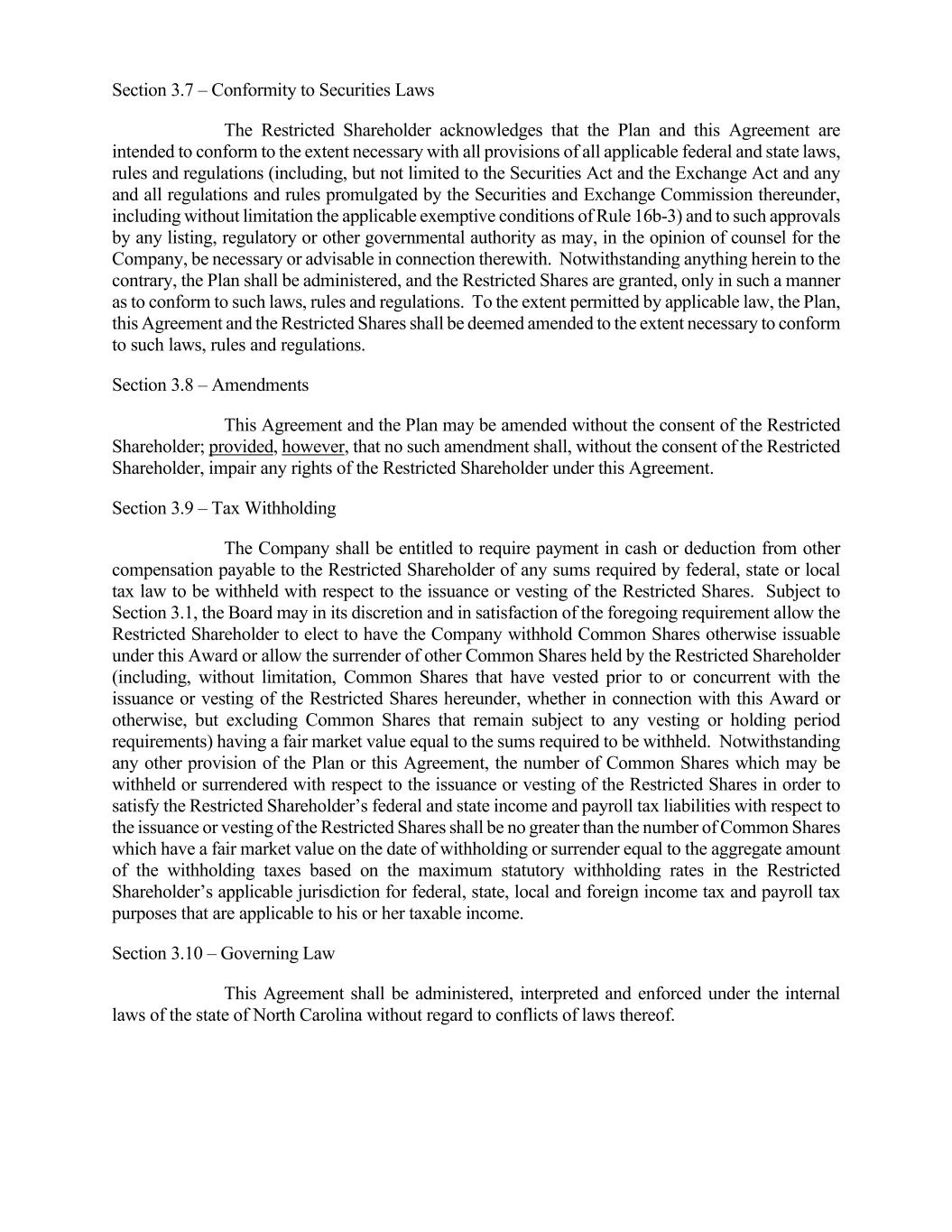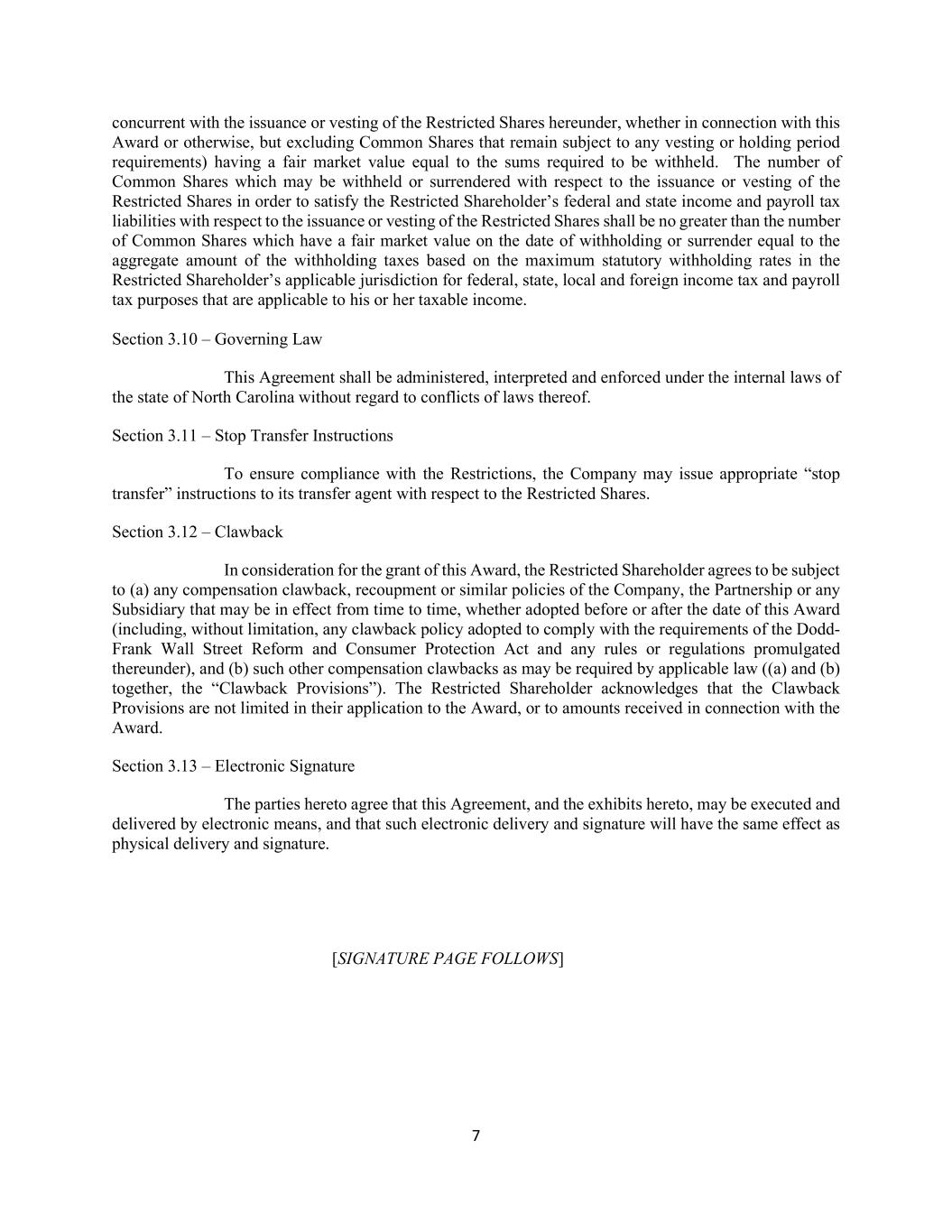 7 concurrent with the issuance or vesting of the Restricted Shares hereunder, whether in connection with this Award or otherwise, but excluding Common Shares that remain subject to any vesting or holding period requirements) having a fair market value equal to the sums required to be withheld. The number of Common Shares which may be withheld or surrendered with respect to the issuance or vesting of the Restricted Shares in order to satisfy the Restricted Shareholder’s federal and state income and payroll tax liabilities with respect to the issuance or vesting of the Restricted Shares shall be no greater than the number of Common Shares which have a fair market value on the date of withholding or surrender equal to the aggregate amount of the withholding taxes based on the maximum statutory withholding rates in the Restricted Shareholder’s applicable jurisdiction for federal, state, local and foreign income tax and payroll tax purposes that are applicable to his or her taxable income. Section 3.10 – Governing Law This Agreement shall be administered, interpreted and enforced under the internal laws of the state of North Carolina without regard to conflicts of laws thereof. Section 3.11 – Stop Transfer Instructions To ensure compliance with the Restrictions, the Company may issue appropriate “stop transfer” instructions to its transfer agent with respect to the Restricted Shares. Section 3.12 – Clawback In consideration for the grant of this Award, the Restricted Shareholder agrees to be subject to (a) any compensation clawback, recoupment or similar policies of the Company, the Partnership or any Subsidiary that may be in effect from time to time, whether adopted before or after the date of this Award (including, without limitation, any clawback policy adopted to comply with the requirements of the Dodd- Frank Wall Street Reform and Consumer Protection Act and any rules or regulations promulgated thereunder), and (b) such other compensation clawbacks as may be required by applicable law ((a) and (b) together, the “Clawback Provisions”). The Restricted Shareholder acknowledges that the Clawback Provisions are not limited in their application to the Award, or to amounts received in connection with the Award. Section 3.13 – Electronic Signature The parties hereto agree that this Agreement, and the exhibits hereto, may be executed and delivered by electronic means, and that such electronic delivery and signature will have the same effect as physical delivery and signature. [SIGNATURE PAGE FOLLOWS]