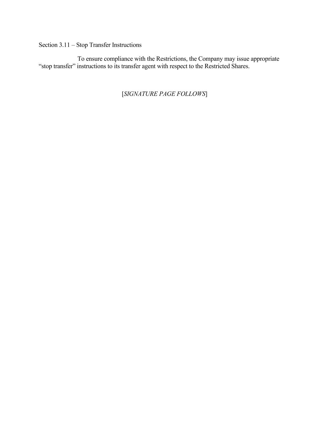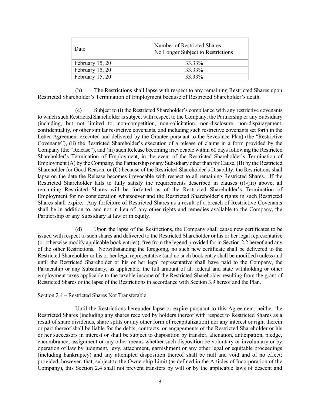 3 Date Number of Restricted Shares No Longer Subject to Restrictions February 15, 20__ 33.33% February 15, 20 33.33% February 15, 20 33.33% (b) The Restrictions shall lapse with respect to any remaining Restricted Shares upon Restricted Shareholder’s Termination of Employment because of Restricted Shareholder’s death. (c) Subject to (i) the Restricted Shareholder’s compliance with any restrictive covenants to which such Restricted Shareholder is subject with respect to the Company, the Partnership or any Subsidiary (including, but not limited to, non-competition, non-solicitation, non-disclosure, non-disparagement, confidentiality, or other similar restrictive covenants, and including such restrictive covenants set forth in the Letter Agreement executed and delivered by the Grantee pursuant to the Severance Plan) (the “Restrictive Covenants”), (ii) the Restricted Shareholder’s execution of a release of claims in a form provided by the Company (the “Release”), and (iii) such Release becoming irrevocable within 60 days following the Restricted Shareholder’s Termination of Employment, in the event of the Restricted Shareholder’s Termination of Employment (A) by the Company, the Partnership or any Subsidiary other than for Cause, (B) by the Restricted Shareholder for Good Reason, or (C) because of the Restricted Shareholder’s Disability, the Restrictions shall lapse on the date the Release becomes irrevocable with respect to all remaining Restricted Shares. If the Restricted Shareholder fails to fully satisfy the requirements described in clauses (i)-(iii) above, all remaining Restricted Shares will be forfeited as of the Restricted Shareholder’s Termination of Employment for no consideration whatsoever and the Restricted Shareholder’s rights in such Restricted Shares shall expire. Any forfeiture of Restricted Shares as a result of a breach of Restrictive Covenants shall be in addition to, and not in lieu of, any other rights and remedies available to the Company, the Partnership or any Subsidiary at law or in equity. (d) Upon the lapse of the Restrictions, the Company shall cause new certificates to be issued with respect to such shares and delivered to the Restricted Shareholder or his or her legal representative (or otherwise modify applicable book entries), free from the legend provided for in Section 2.2 hereof and any of the other Restrictions. Notwithstanding the foregoing, no such new certificate shall be delivered to the Restricted Shareholder or his or her legal representative (and no such book entry shall be modified) unless and until the Restricted Shareholder or his or her legal representative shall have paid to the Company, the Partnership or any Subsidiary, as applicable, the full amount of all federal and state withholding or other employment taxes applicable to the taxable income of the Restricted Shareholder resulting from the grant of Restricted Shares or the lapse of the Restrictions in accordance with Section 3.9 hereof and the Plan. Section 2.4 – Restricted Shares Not Transferable Until the Restrictions hereunder lapse or expire pursuant to this Agreement, neither the Restricted Shares (including any shares received by holders thereof with respect to Restricted Shares as a result of share dividends, share splits or any other form of recapitalization) nor any interest or right therein or part thereof shall be liable for the debts, contracts, or engagements of the Restricted Shareholder or his or her successors in interest or shall be subject to disposition by transfer, alienation, anticipation, pledge, encumbrance, assignment or any other means whether such disposition be voluntary or involuntary or by operation of law by judgment, levy, attachment, garnishment or any other legal or equitable proceedings (including bankruptcy) and any attempted disposition thereof shall be null and void and of no effect; provided, however, that, subject to the Ownership Limit (as defined in the Articles of Incorporation of the Company), this Section 2.4 shall not prevent transfers by will or by the applicable laws of descent and