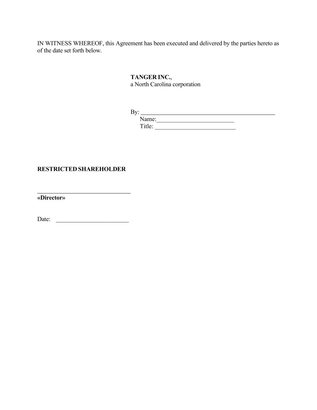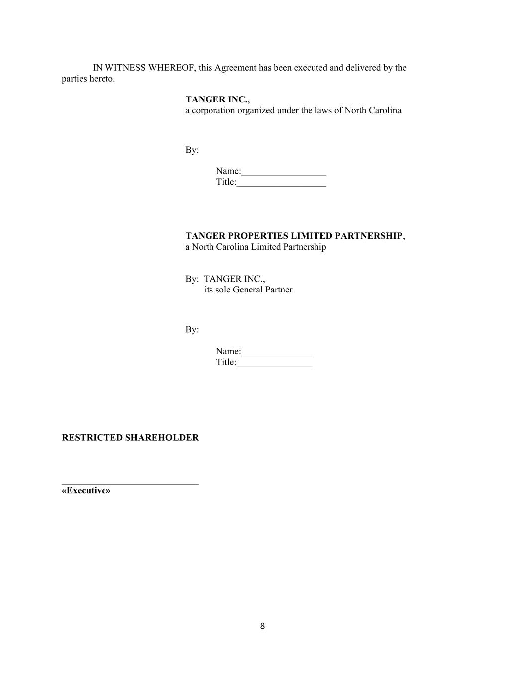 8 IN WITNESS WHEREOF, this Agreement has been executed and delivered by the parties hereto. TANGER INC., a corporation organized under the laws of North Carolina By: Name:__________________ Title:___________________ TANGER PROPERTIES LIMITED PARTNERSHIP, a North Carolina Limited Partnership By: TANGER INC., its sole General Partner By: Name:_______________ Title:________________ RESTRICTED SHAREHOLDER _____________________________ «Executive»