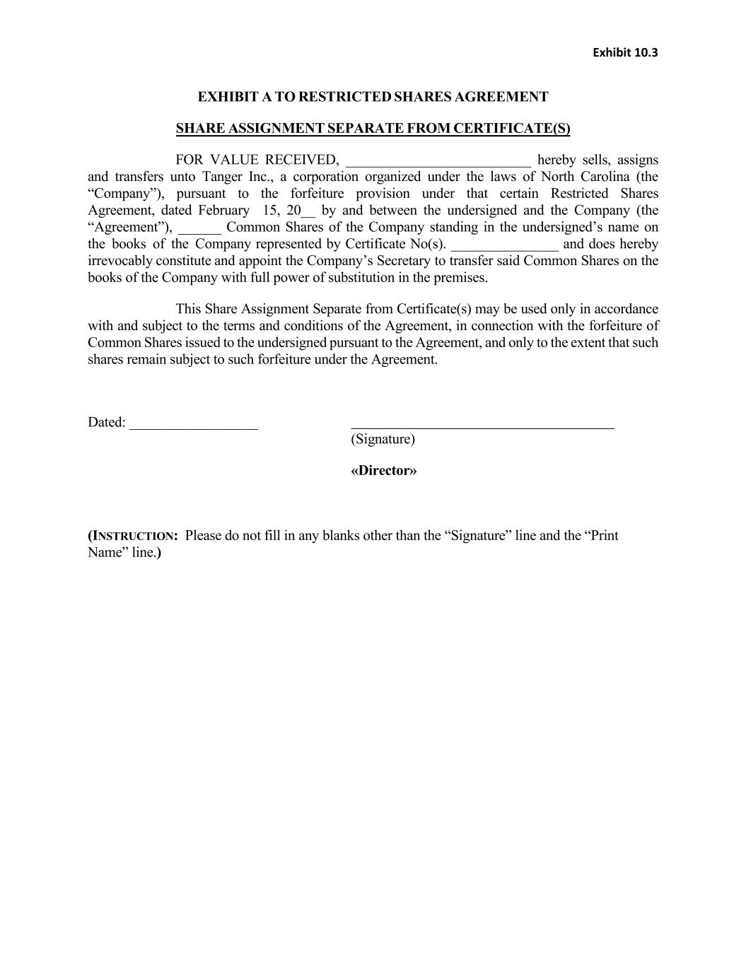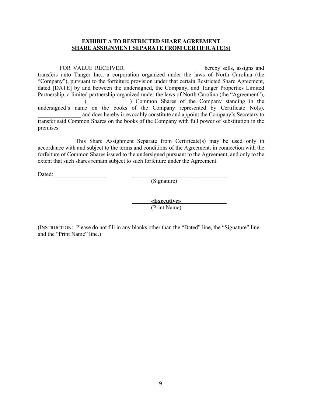9 EXHIBIT A TO RESTRICTED SHARE AGREEMENT SHARE ASSIGNMENT SEPARATE FROM CERTIFICATE(S) FOR VALUE RECEIVED, __________________________ hereby sells, assigns and transfers unto Tanger Inc., a corporation organized under the laws of North Carolina (the “Company”), pursuant to the forfeiture provision under that certain Restricted Share Agreement, dated [DATE] by and between the undersigned, the Company, and Tanger Properties Limited Partnership, a limited partnership organized under the laws of North Carolina (the “Agreement”), _______________ (_______________) Common Shares of the Company standing in the undersigned’s name on the books of the Company represented by Certificate No(s). _______________ and does hereby irrevocably constitute and appoint the Company’s Secretary to transfer said Common Shares on the books of the Company with full power of substitution in the premises. This Share Assignment Separate from Certificate(s) may be used only in accordance with and subject to the terms and conditions of the Agreement, in connection with the forfeiture of Common Shares issued to the undersigned pursuant to the Agreement, and only to the extent that such shares remain subject to such forfeiture under the Agreement. Dated: __________________ _________________________________ (Signature) «Executive» (Print Name) (INSTRUCTION: Please do not fill in any blanks other than the “Dated” line, the “Signature” line and the “Print Name” line.)