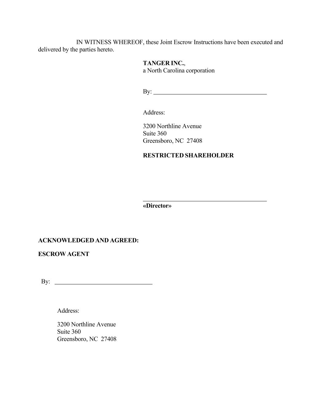 IN WITNESS WHEREOF, these Joint Escrow Instructions have been executed and delivered by the parties hereto. TANGER INC., a North Carolina corporation By: Address: 3200 Northline Avenue Suite 360 Greensboro, NC 27408 RESTRICTED SHAREHOLDER «Director» ACKNOWLEDGED AND AGREED: ESCROW AGENT By: Address: 3200 Northline Avenue Suite 360 Greensboro, NC 27408