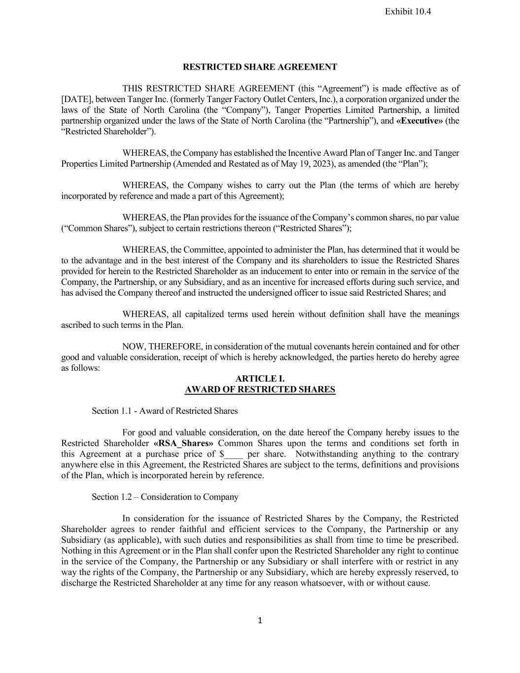 1 RESTRICTED SHARE AGREEMENT THIS RESTRICTED SHARE AGREEMENT (this “Agreement”) is made effective as of [DATE], between Tanger Inc. (formerly Tanger Factory Outlet Centers, Inc.), a corporation organized under the laws of the State of North Carolina (the “Company”), Tanger Properties Limited Partnership, a limited partnership organized under the laws of the State of North Carolina (the “Partnership”), and «Executive» (the “Restricted Shareholder”). WHEREAS, the Company has established the Incentive Award Plan of Tanger Inc. and Tanger Properties Limited Partnership (Amended and Restated as of May 19, 2023), as amended (the “Plan”); WHEREAS, the Company wishes to carry out the Plan (the terms of which are hereby incorporated by reference and made a part of this Agreement); WHEREAS, the Plan provides for the issuance of the Company’s common shares, no par value (“Common Shares”), subject to certain restrictions thereon (“Restricted Shares”); WHEREAS, the Committee, appointed to administer the Plan, has determined that it would be to the advantage and in the best interest of the Company and its shareholders to issue the Restricted Shares provided for herein to the Restricted Shareholder as an inducement to enter into or remain in the service of the Company, the Partnership, or any Subsidiary, and as an incentive for increased efforts during such service, and has advised the Company thereof and instructed the undersigned officer to issue said Restricted Shares; and WHEREAS, all capitalized terms used herein without definition shall have the meanings ascribed to such terms in the Plan. NOW, THEREFORE, in consideration of the mutual covenants herein contained and for other good and valuable consideration, receipt of which is hereby acknowledged, the parties hereto do hereby agree as follows: ARTICLE I. AWARD OF RESTRICTED SHARES Section 1.1 - Award of Restricted Shares For good and valuable consideration, on the date hereof the Company hereby issues to the Restricted Shareholder «RSA_Shares» Common Shares upon the terms and conditions set forth in this Agreement at a purchase price of $____ per share. Notwithstanding anything to the contrary anywhere else in this Agreement, the Restricted Shares are subject to the terms, definitions and provisions of the Plan, which is incorporated herein by reference. Section 1.2 – Consideration to Company In consideration for the issuance of Restricted Shares by the Company, the Restricted Shareholder agrees to render faithful and efficient services to the Company, the Partnership or any Subsidiary (as applicable), with such duties and responsibilities as shall from time to time be prescribed. Nothing in this Agreement or in the Plan shall confer upon the Restricted Shareholder any right to continue in the service of the Company, the Partnership or any Subsidiary or shall interfere with or restrict in any way the rights of the Company, the Partnership or any Subsidiary, which are hereby expressly reserved, to discharge the Restricted Shareholder at any time for any reason whatsoever, with or without cause. Exhibit 10.4