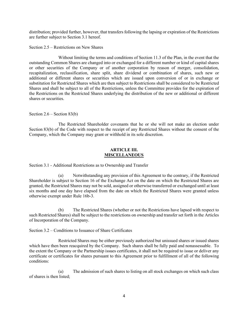 4 distribution; provided further, however, that transfers following the lapsing or expiration of the Restrictions are further subject to Section 3.1 hereof. Section 2.5 – Restrictions on New Shares Without limiting the terms and conditions of Section 11.3 of the Plan, in the event that the outstanding Common Shares are changed into or exchanged for a different number or kind of capital shares or other securities of the Company or of another corporation by reason of merger, consolidation, recapitalization, reclassification, share split, share dividend or combination of shares, such new or additional or different shares or securities which are issued upon conversion of or in exchange or substitution for Restricted Shares which are then subject to Restrictions shall be considered to be Restricted Shares and shall be subject to all of the Restrictions, unless the Committee provides for the expiration of the Restrictions on the Restricted Shares underlying the distribution of the new or additional or different shares or securities. Section 2.6 – Section 83(b) The Restricted Shareholder covenants that he or she will not make an election under Section 83(b) of the Code with respect to the receipt of any Restricted Shares without the consent of the Company, which the Company may grant or withhold in its sole discretion. ARTICLE III. MISCELLANEOUS Section 3.1 - Additional Restrictions as to Ownership and Transfer (a) Notwithstanding any provision of this Agreement to the contrary, if the Restricted Shareholder is subject to Section 16 of the Exchange Act on the date on which the Restricted Shares are granted, the Restricted Shares may not be sold, assigned or otherwise transferred or exchanged until at least six months and one day have elapsed from the date on which the Restricted Shares were granted unless otherwise exempt under Rule 16b-3. (b) The Restricted Shares (whether or not the Restrictions have lapsed with respect to such Restricted Shares) shall be subject to the restrictions on ownership and transfer set forth in the Articles of Incorporation of the Company. Section 3.2 – Conditions to Issuance of Share Certificates Restricted Shares may be either previously authorized but unissued shares or issued shares which have then been reacquired by the Company. Such shares shall be fully paid and nonassessable. To the extent the Company or the Partnership issues certificates, it shall not be required to issue or deliver any certificate or certificates for shares pursuant to this Agreement prior to fulfillment of all of the following conditions: (a) The admission of such shares to listing on all stock exchanges on which such class of shares is then listed;